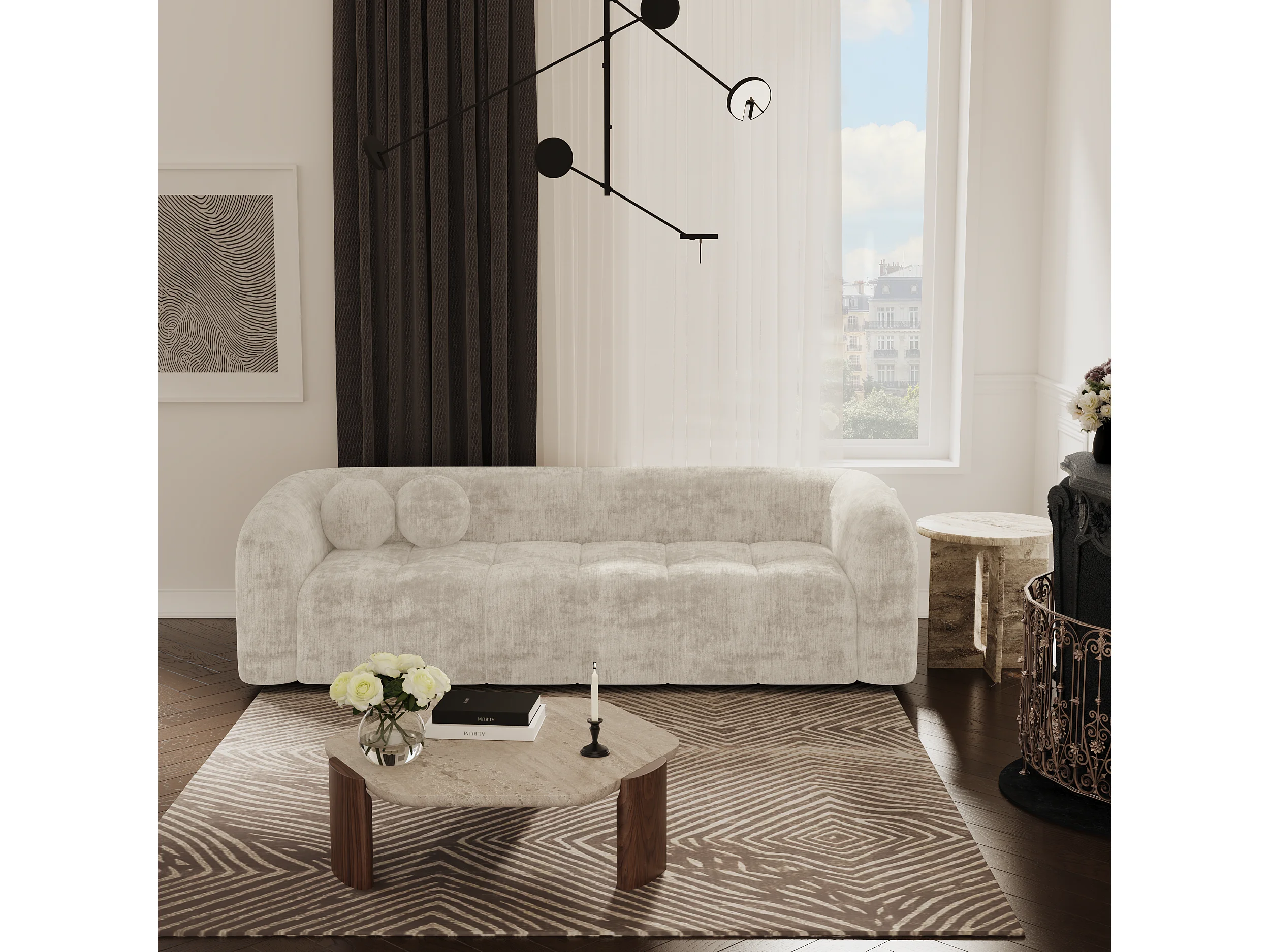 Canapé 3 places velours crème 226cm HAUSSMANN