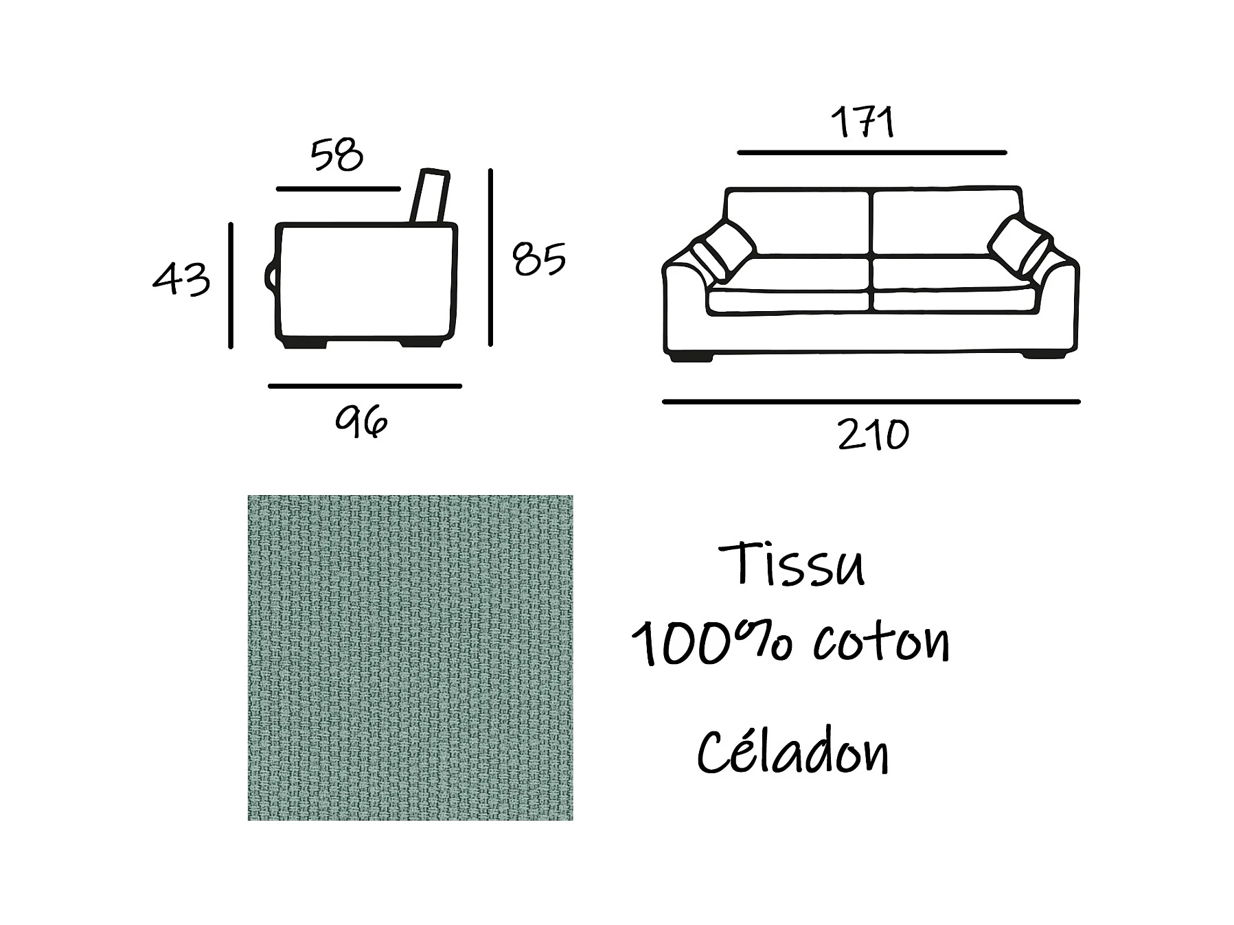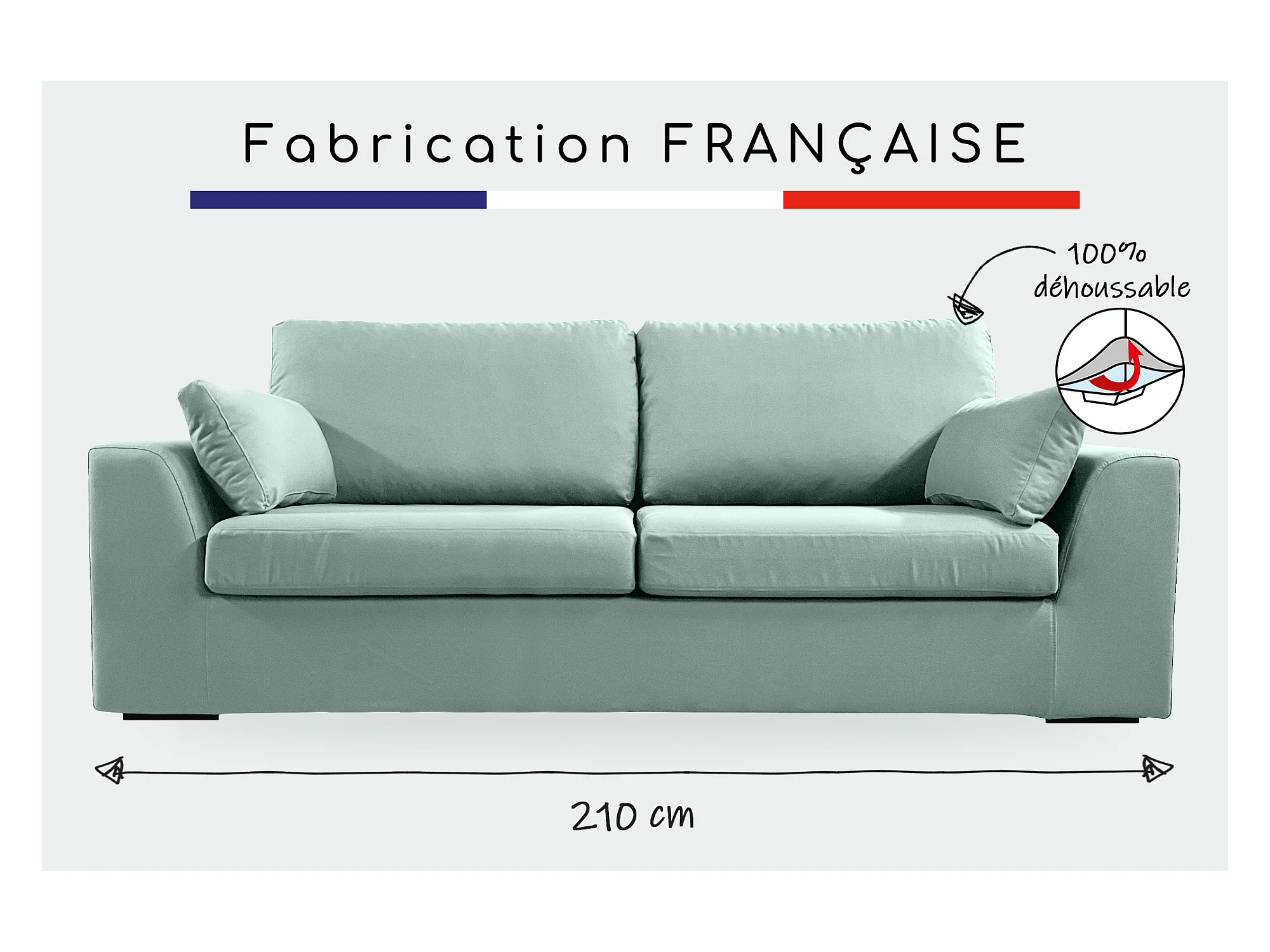 Canapé 4 pl TRESSIN 170 cm fixe tissu coton Céladon - 100% déhoussable - Fab. France