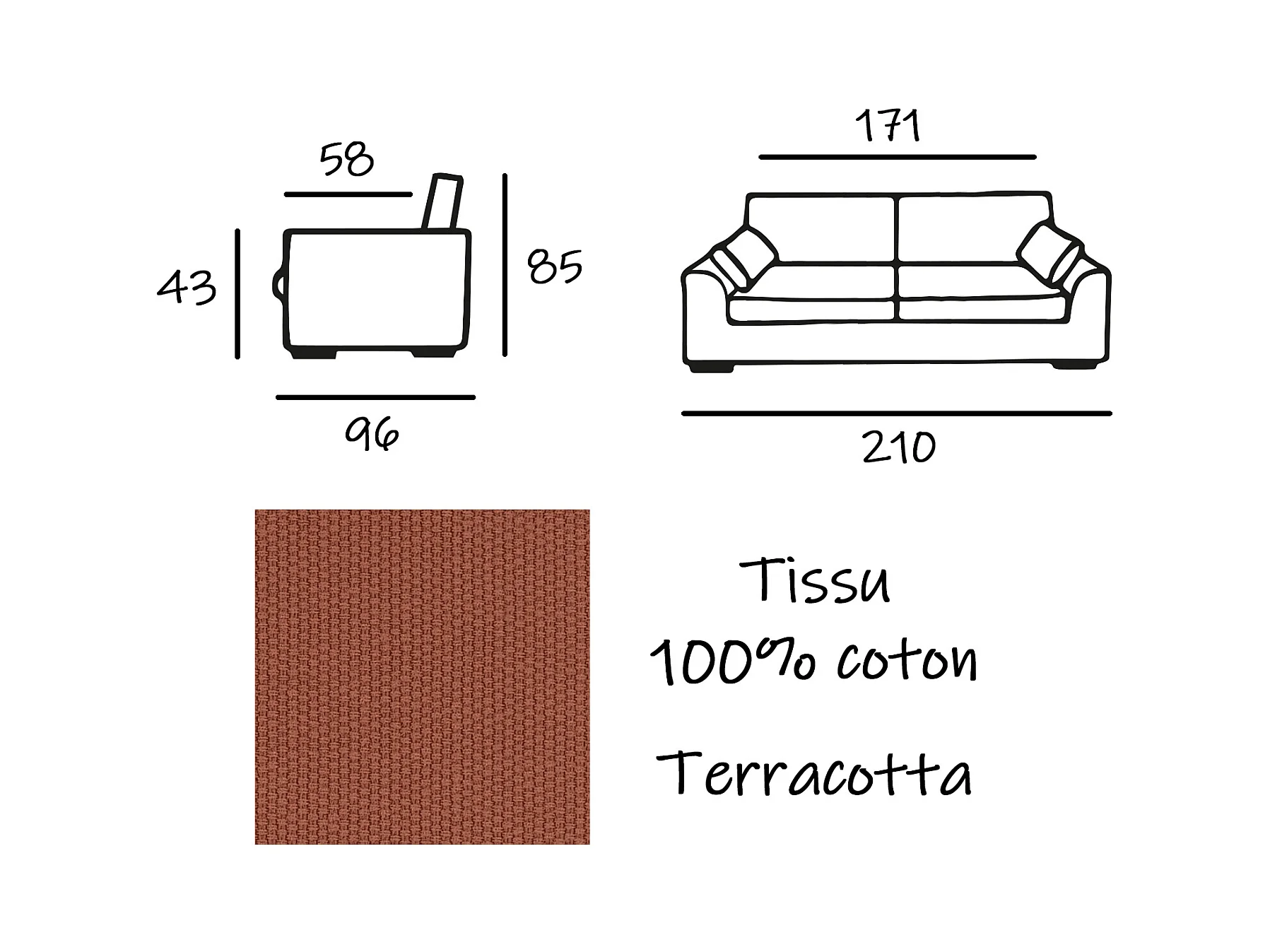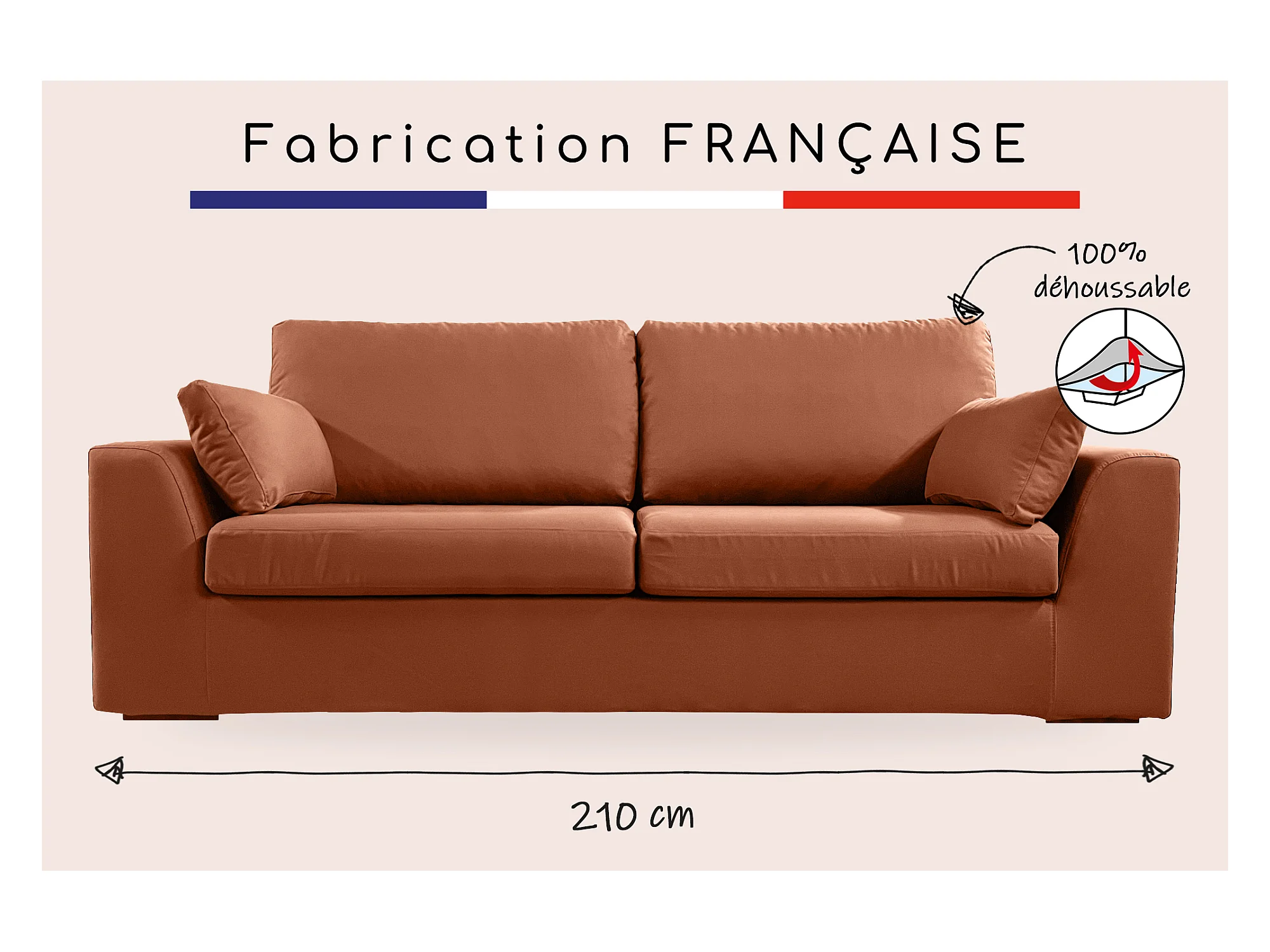 Canapé 4 pl TRESSIN 170 cm fixe tissu coton Terracotta - 100% déhoussable - Fab. France