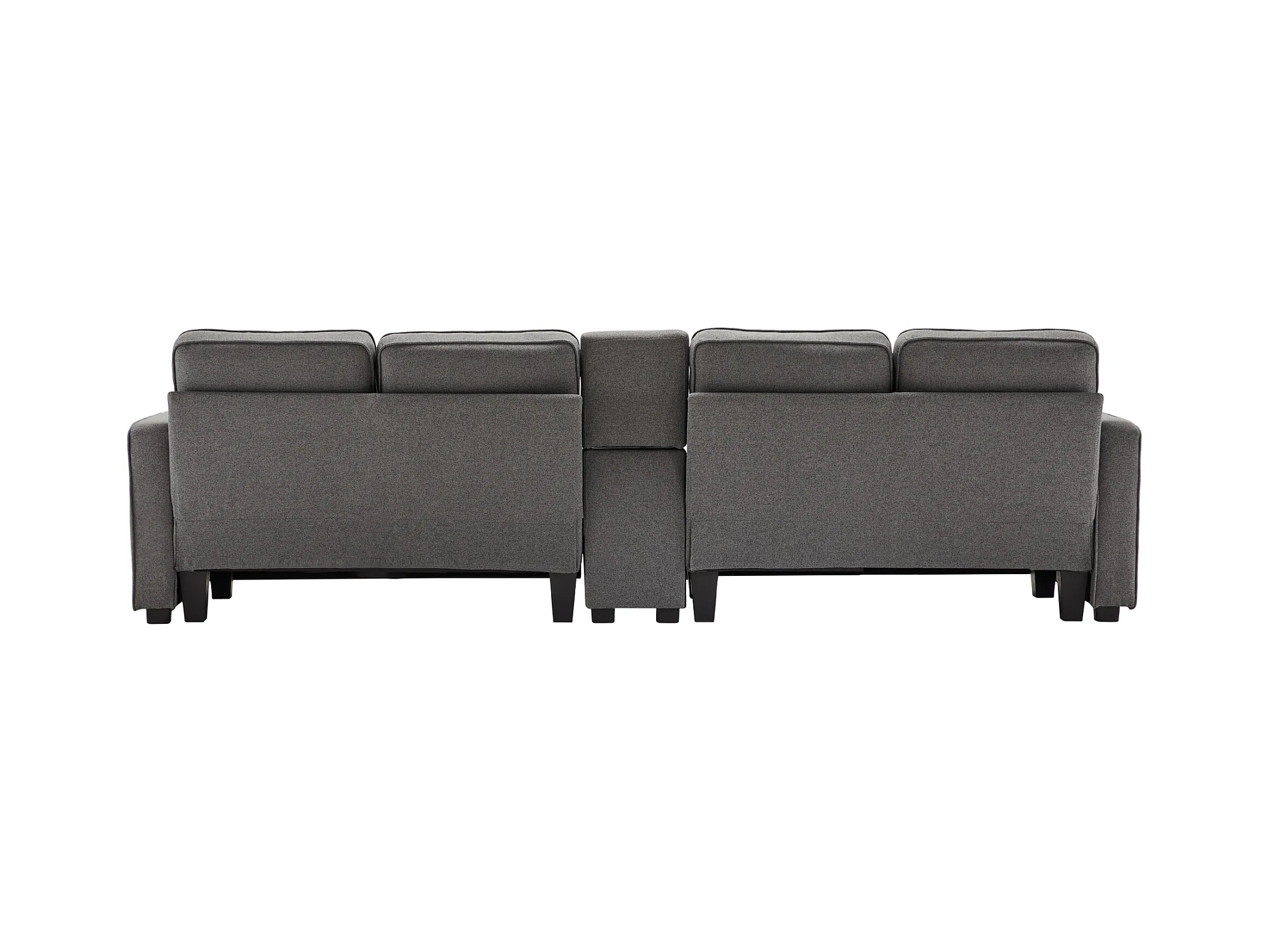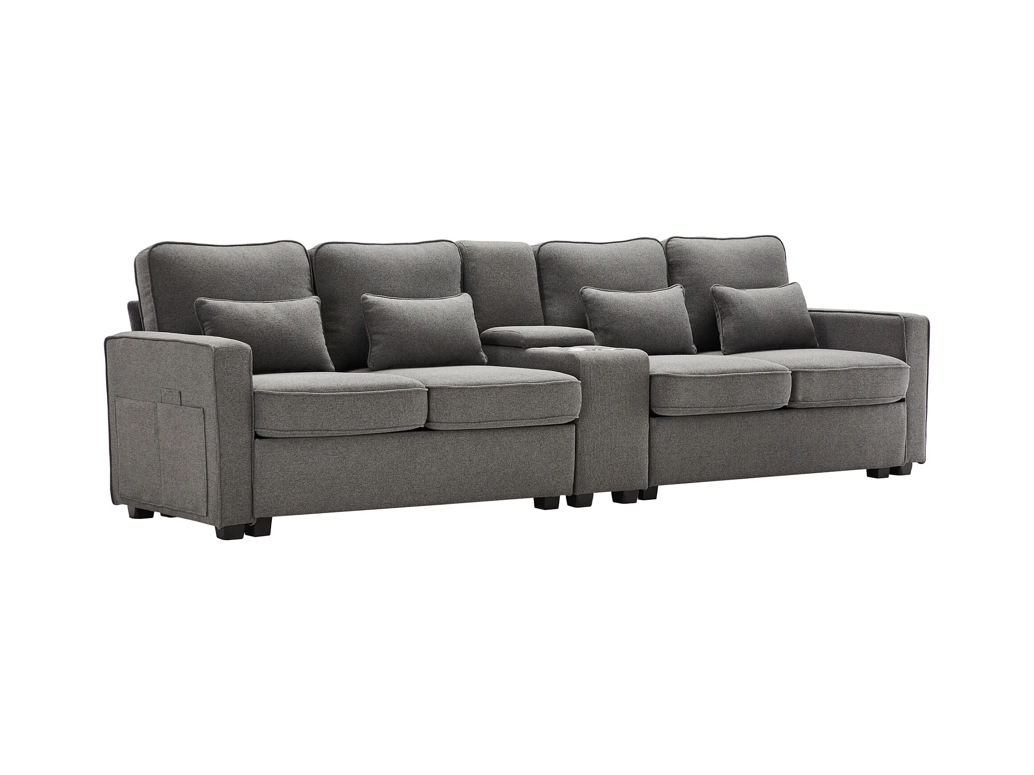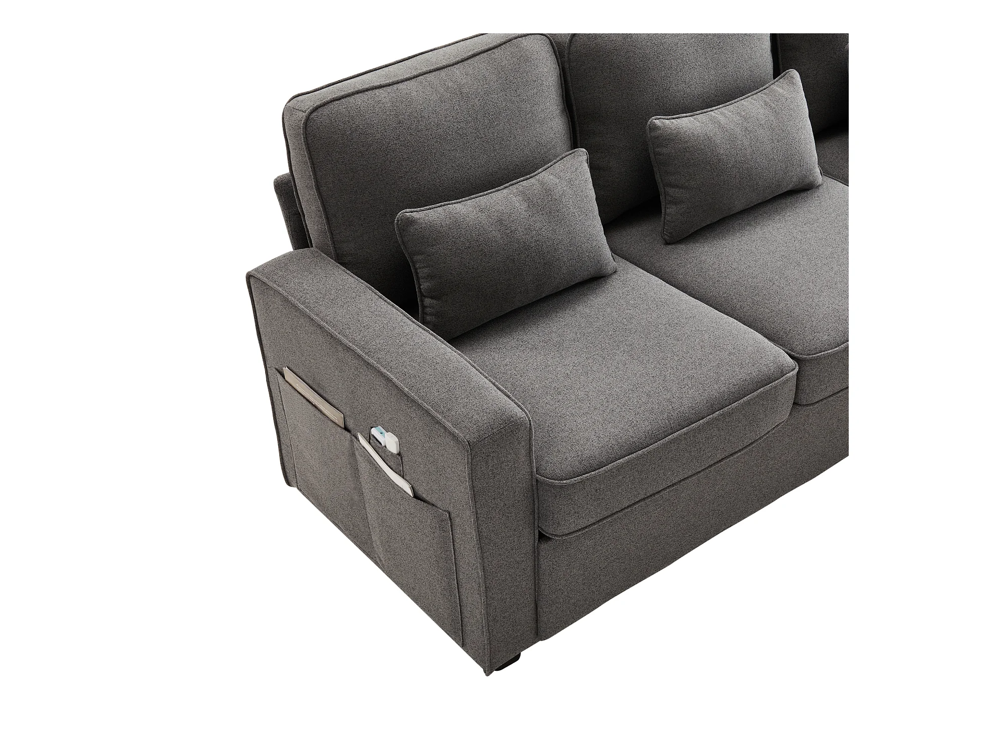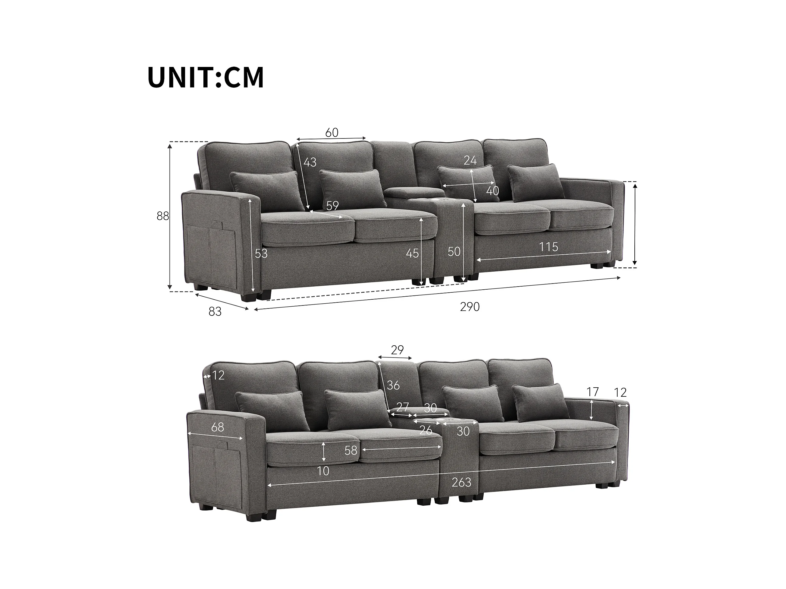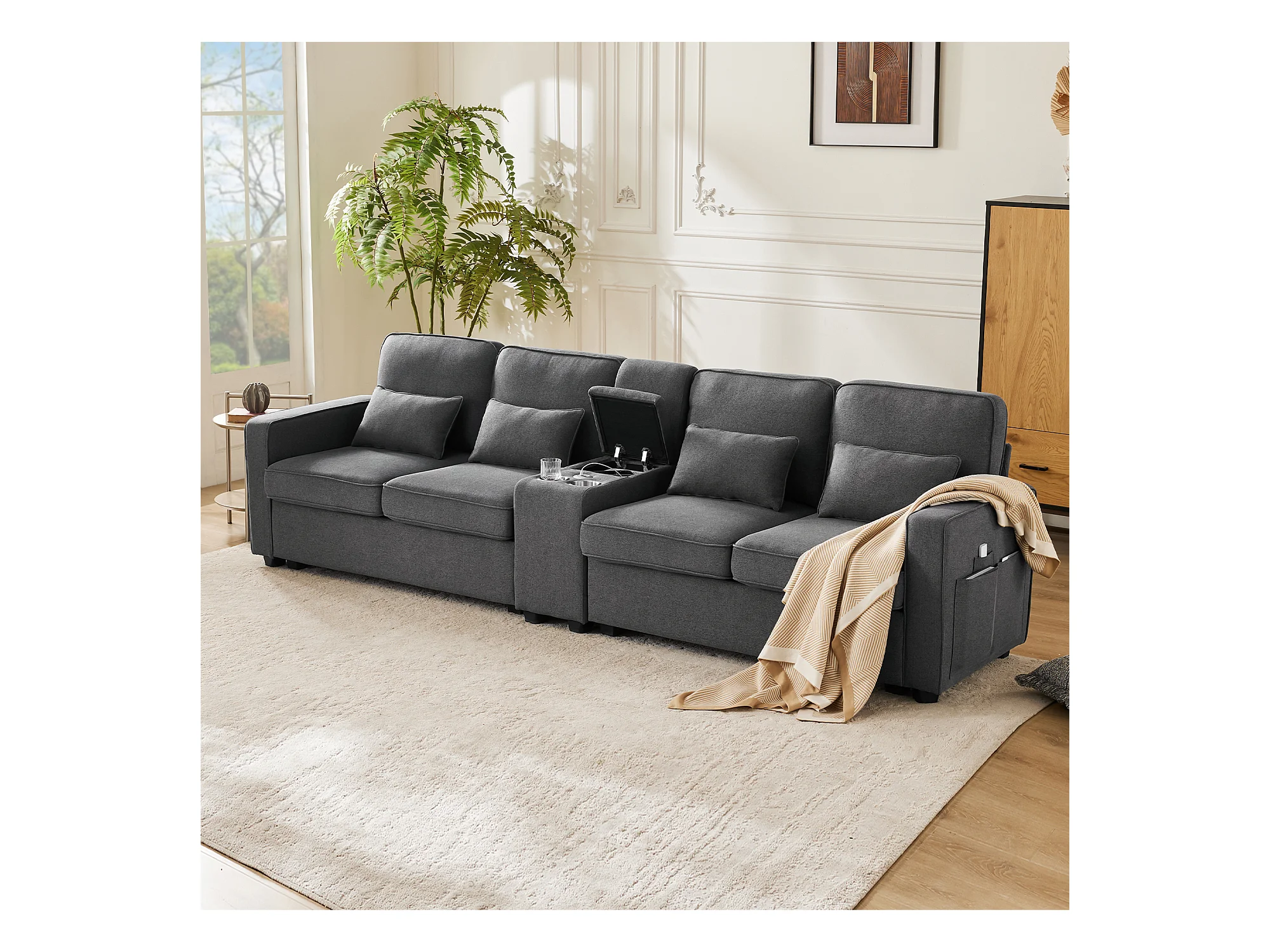 Canapé 4 places - Canapé avec 2 porte-gobelets et 2 chargeurs USB - poches d'accoudoir et 4 oreillers - lin gris foncé