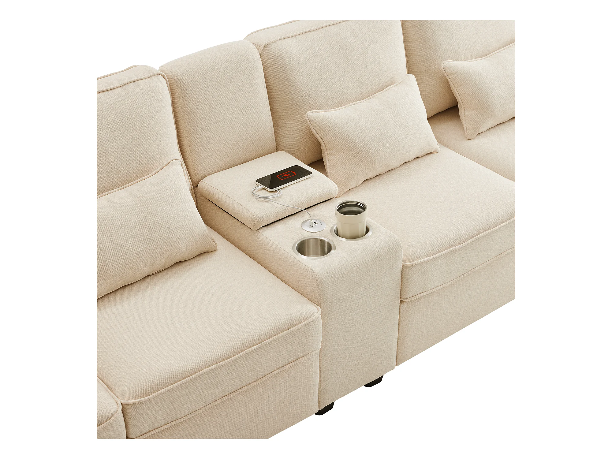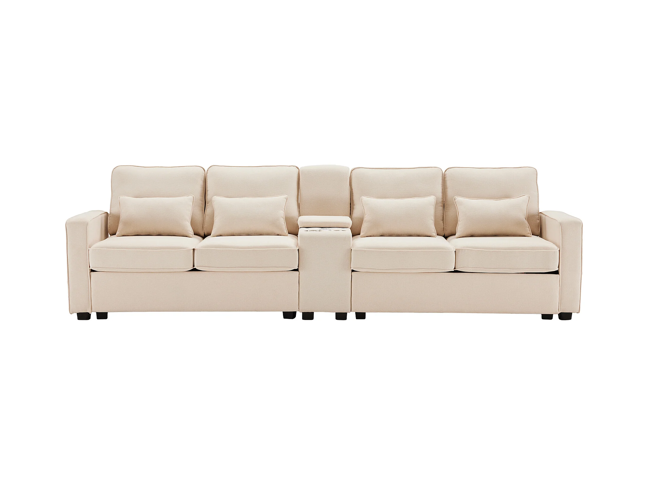 Canapé 4 places en tissu lin avec console, porte-gobelet, port USB, beige