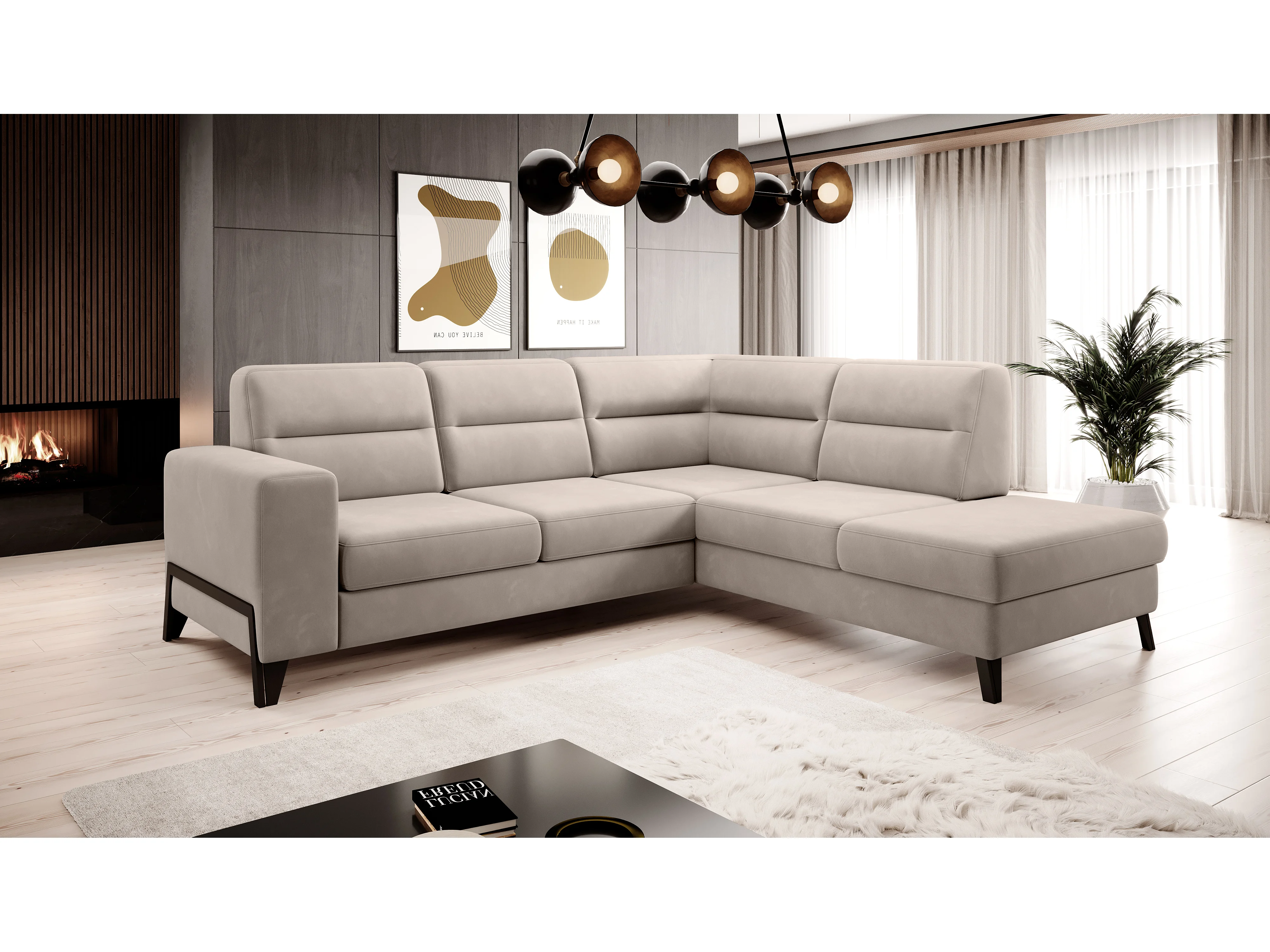 Canapé angle droit convertible velours beige clair et pieds acier noir Kassidi 277cm