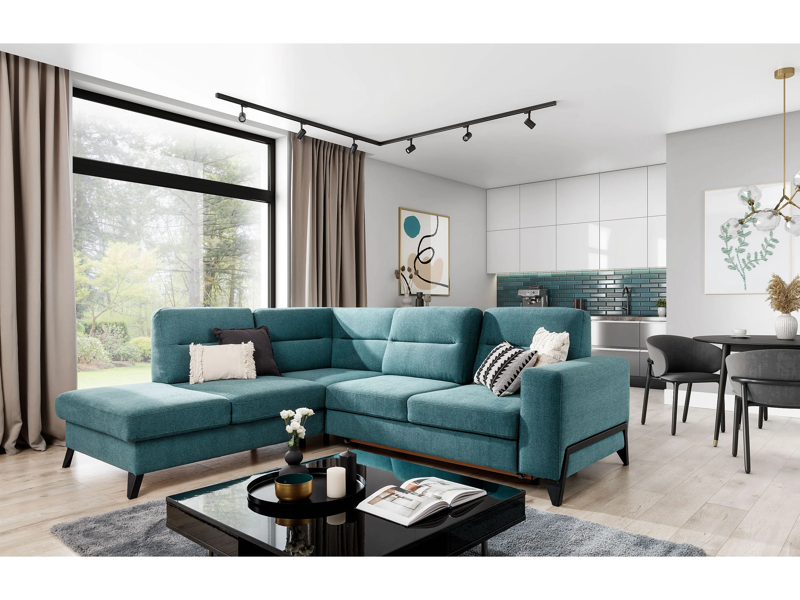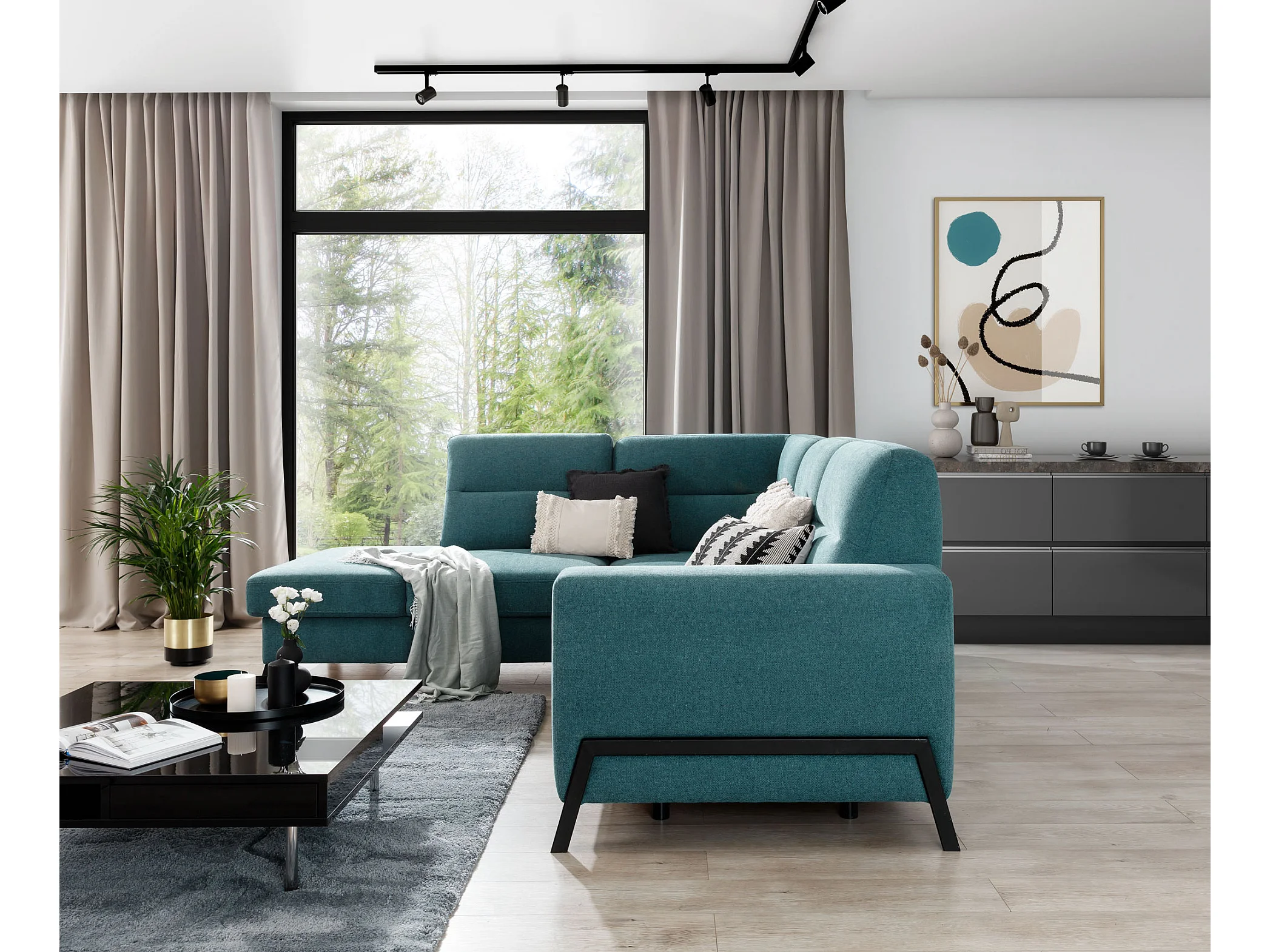 Canapé angle gauche convertible tissu bleu lavande et pieds acier noir Kassidi 277cm