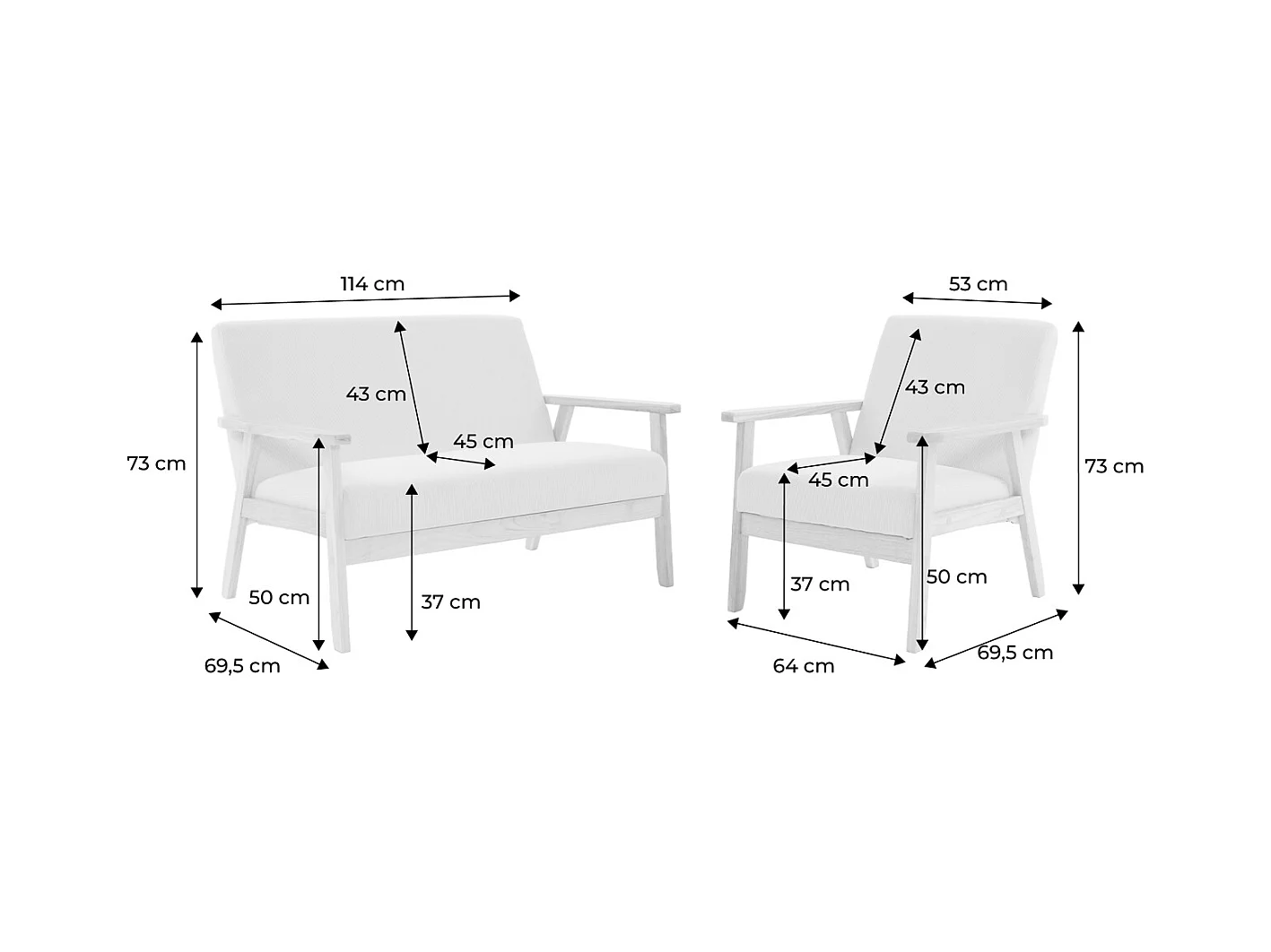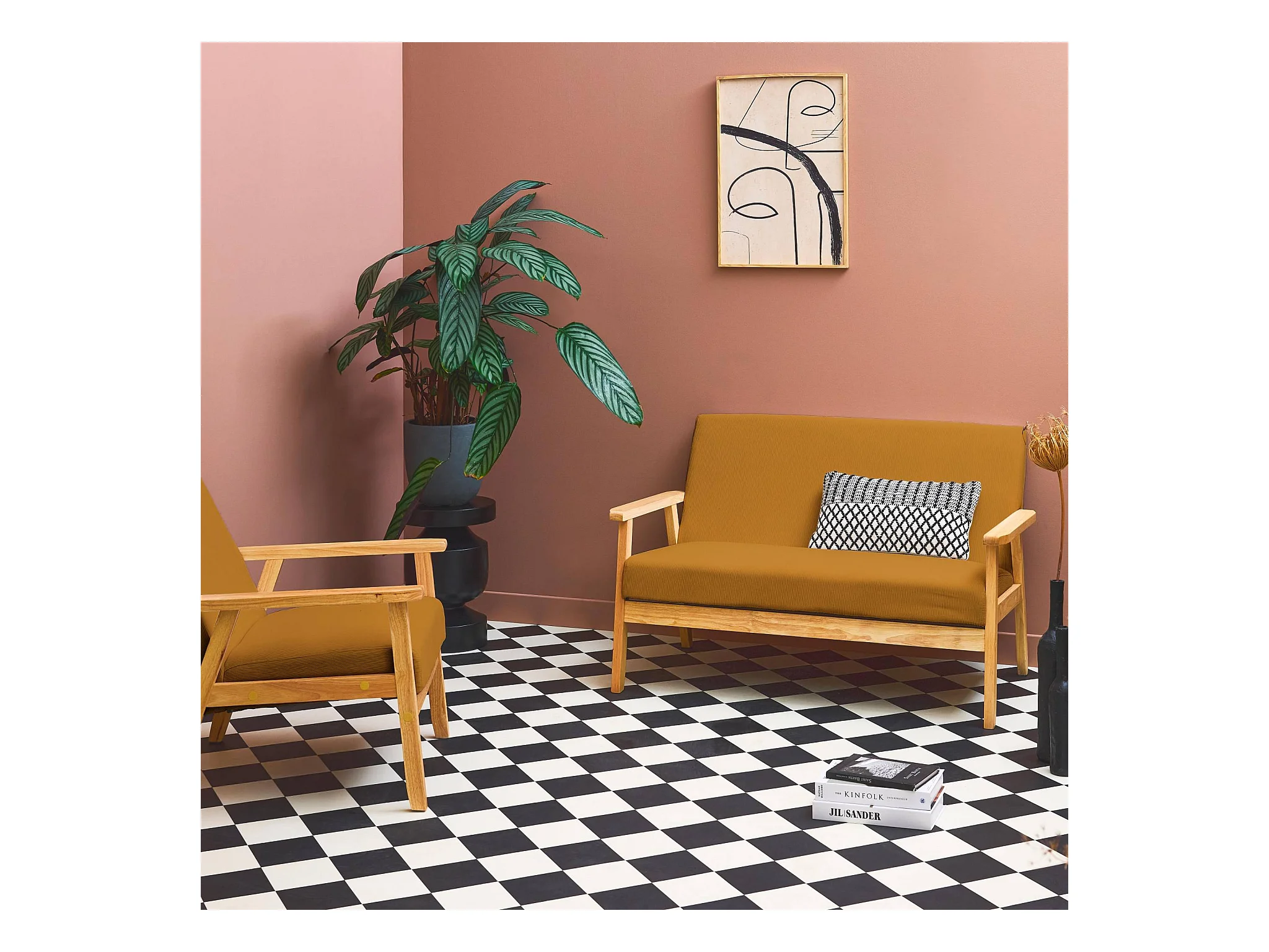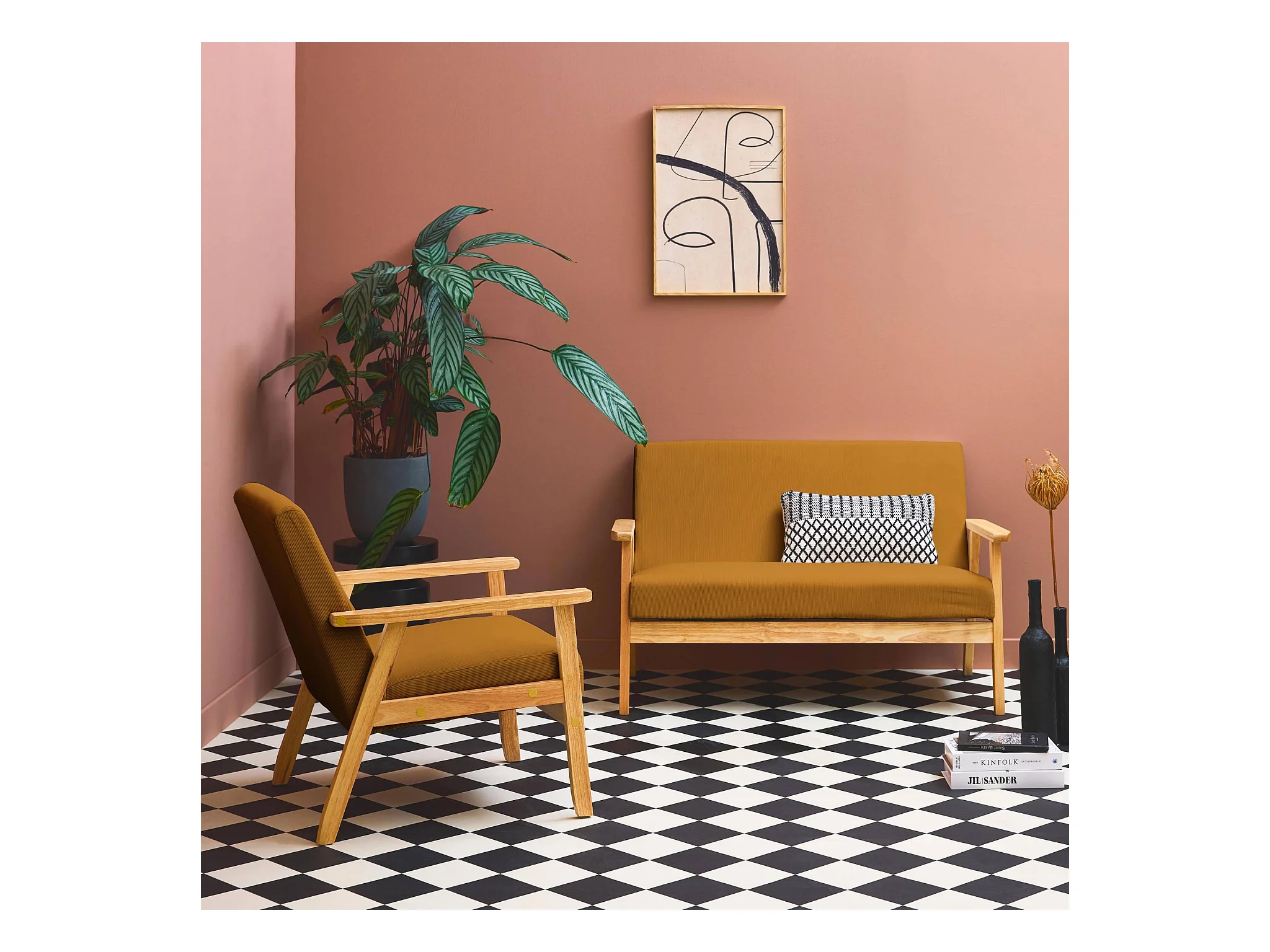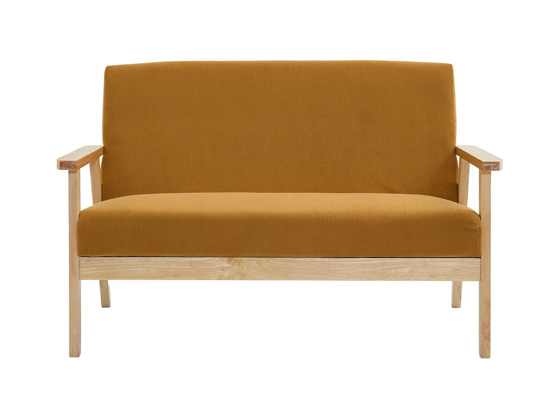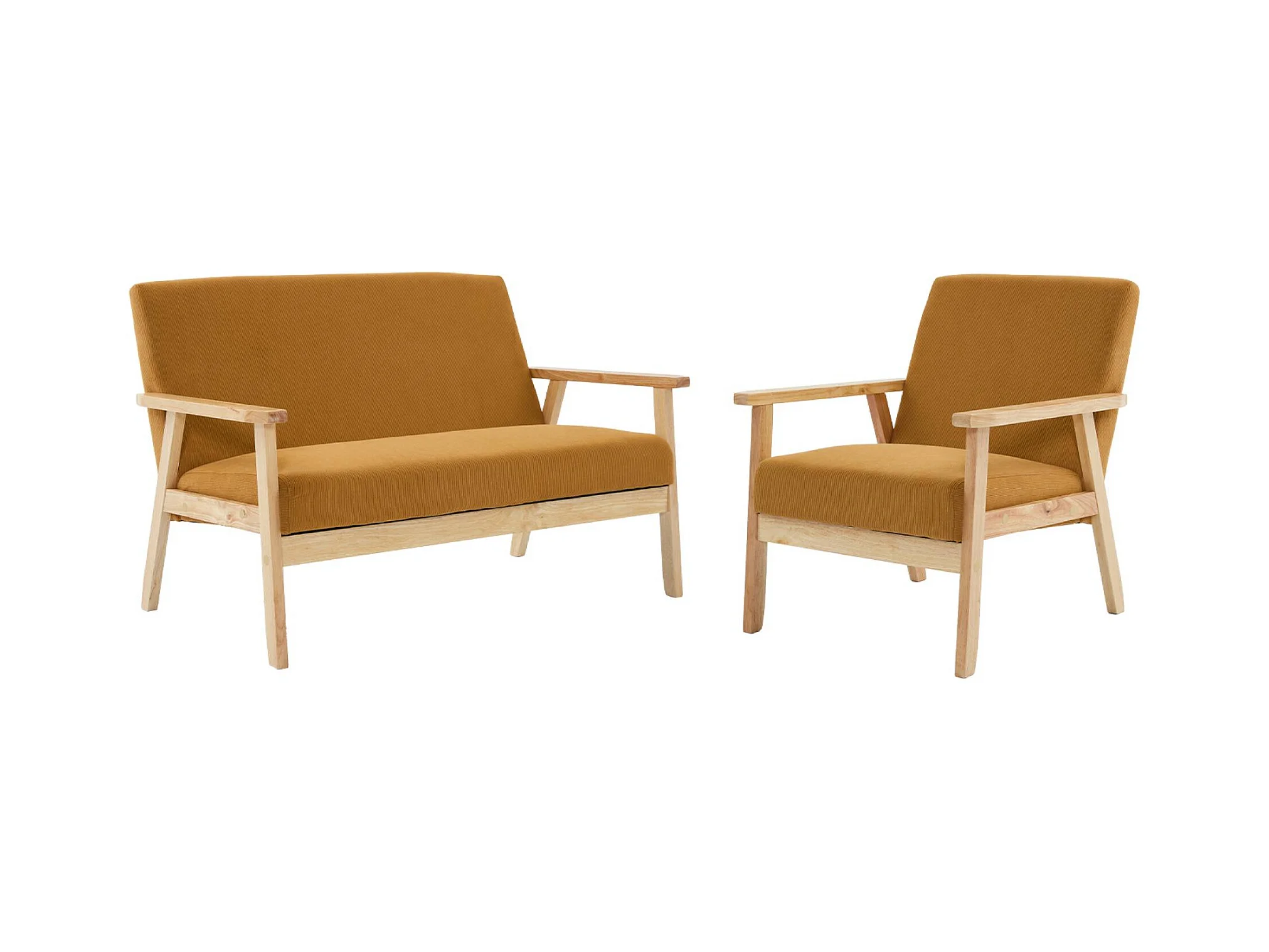 Canapé banquette 2 places + Fauteuil velours côtelé. pieds bois. moutarde