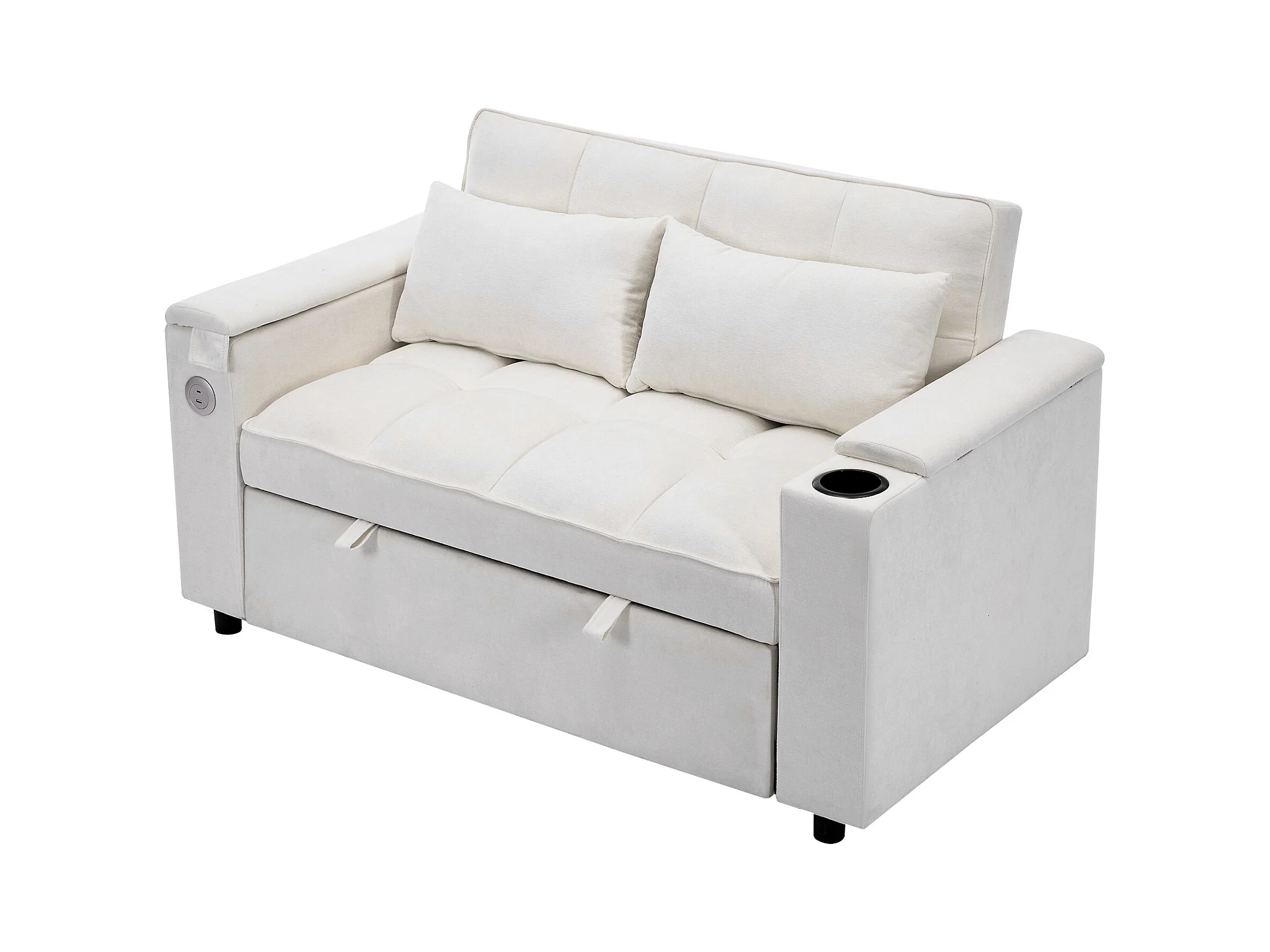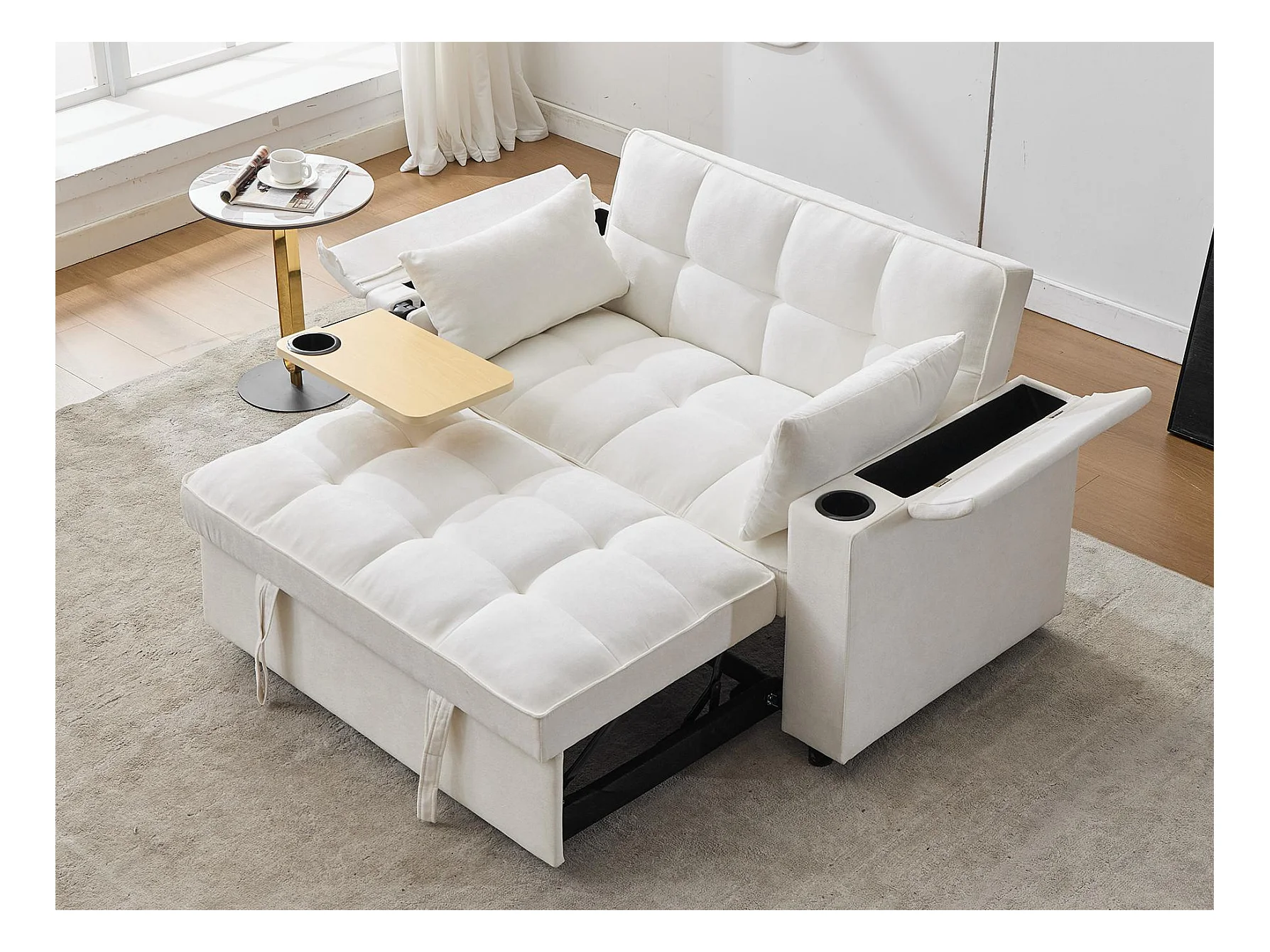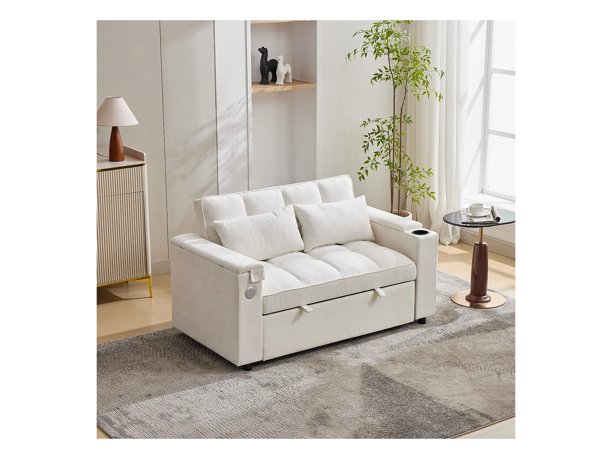 Canapé convertible 2 personnes 140.5x74x82 cm - Dossier réglable - Port USB - Porte-gobelet - Petite table d'appoint - Beige