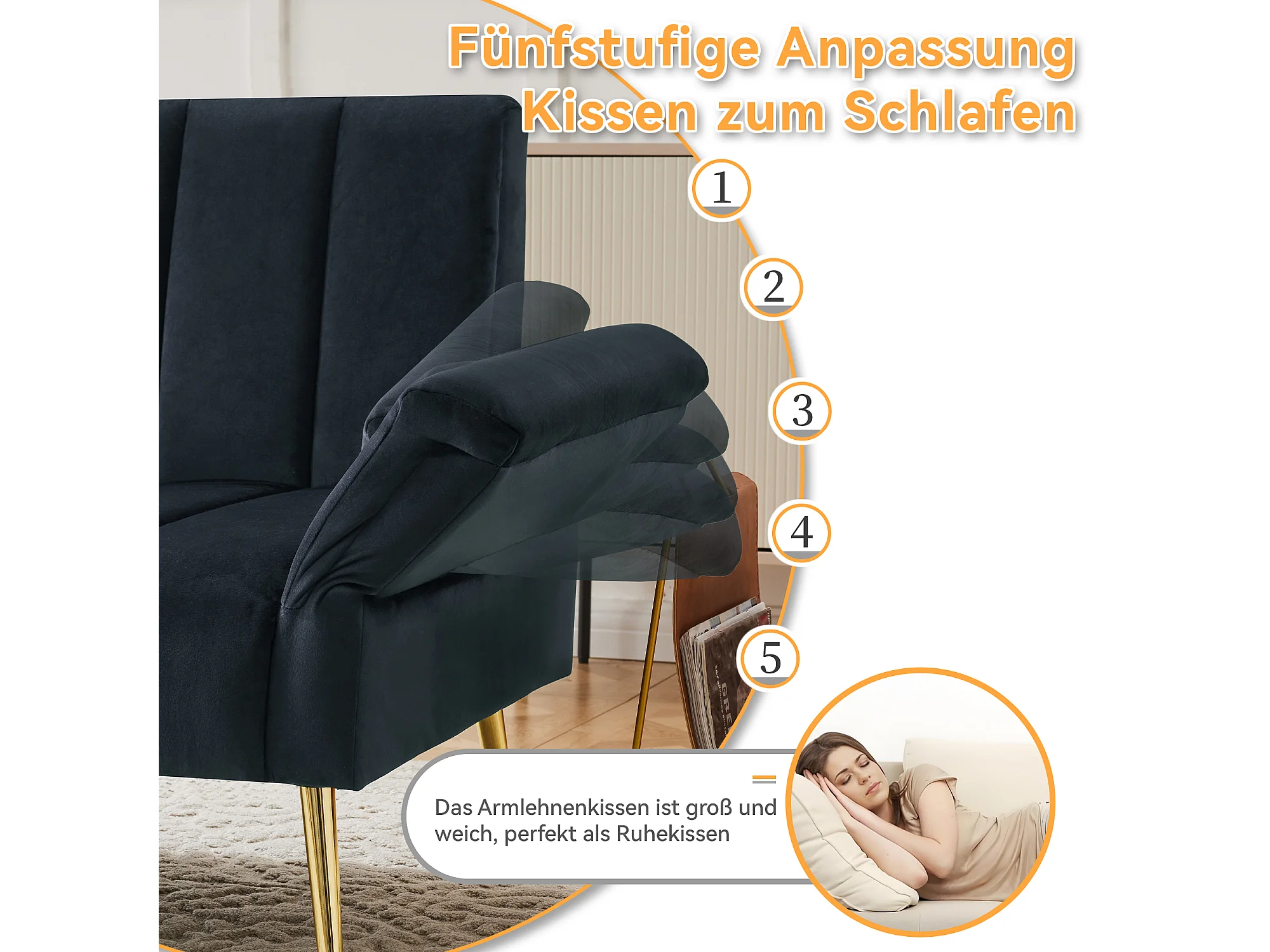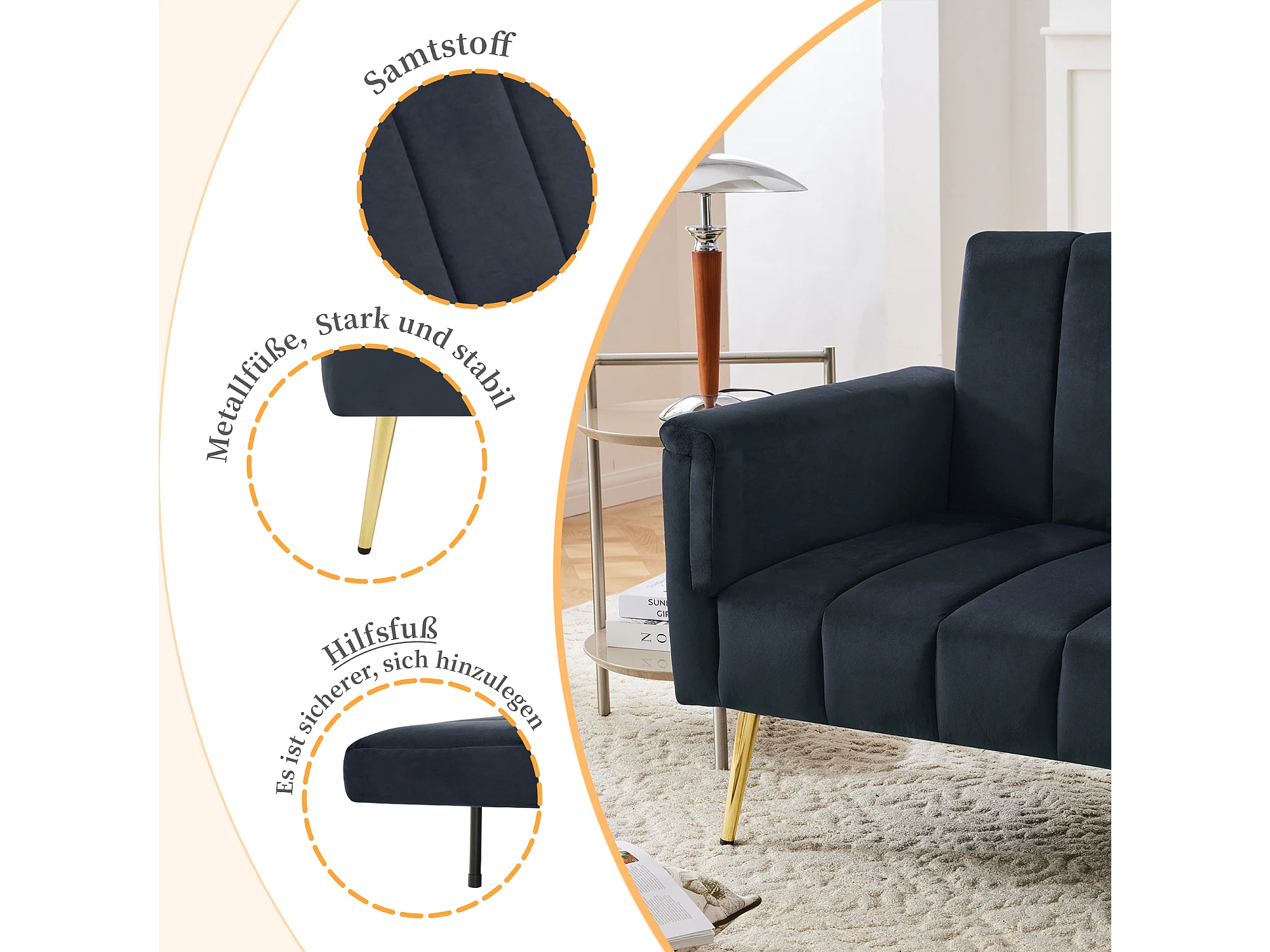 Canapé convertible 2 places, avec fonction lit, en velours, noir (183x76x75 cm)