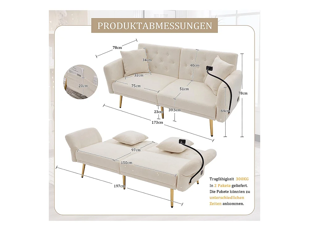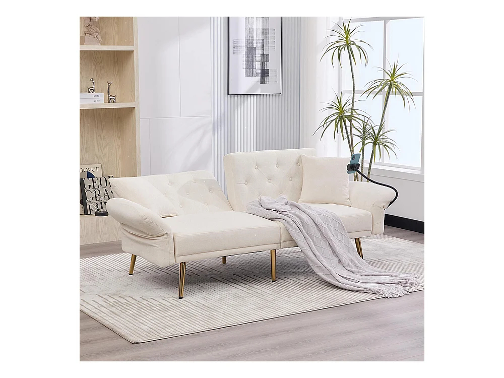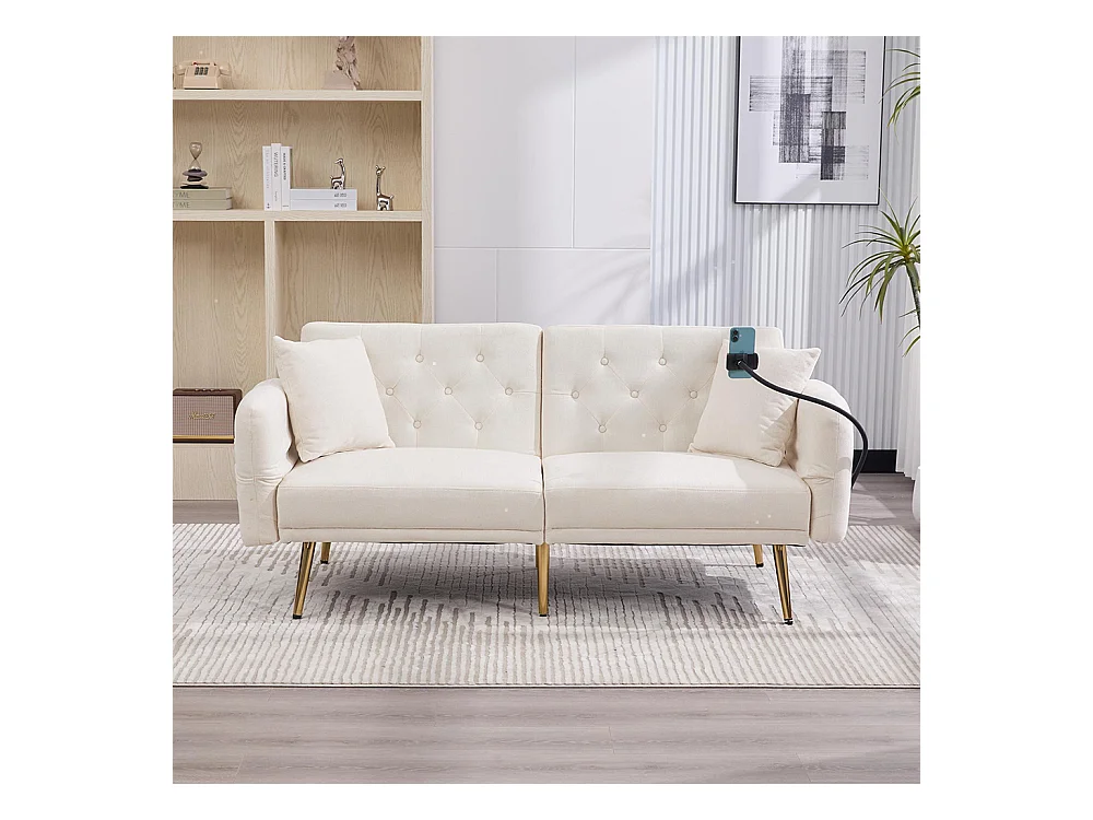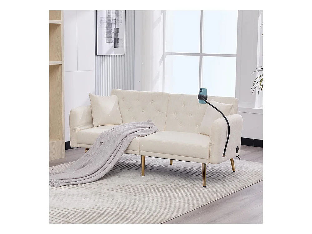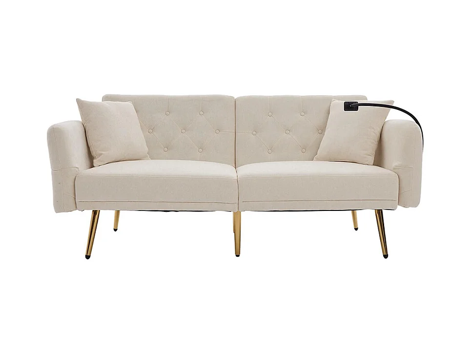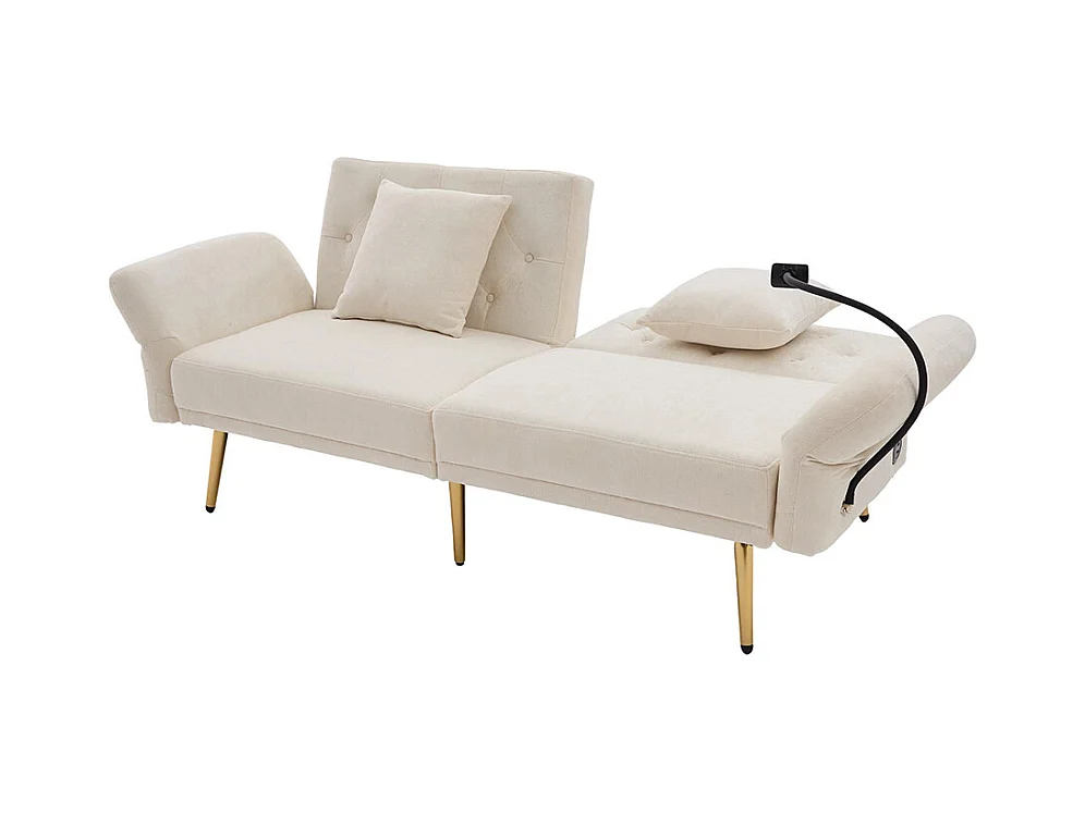 Canapé convertible 2 places dossier ajustable USB poche support téléphone pieds métal pliant siège lit dappoint beige