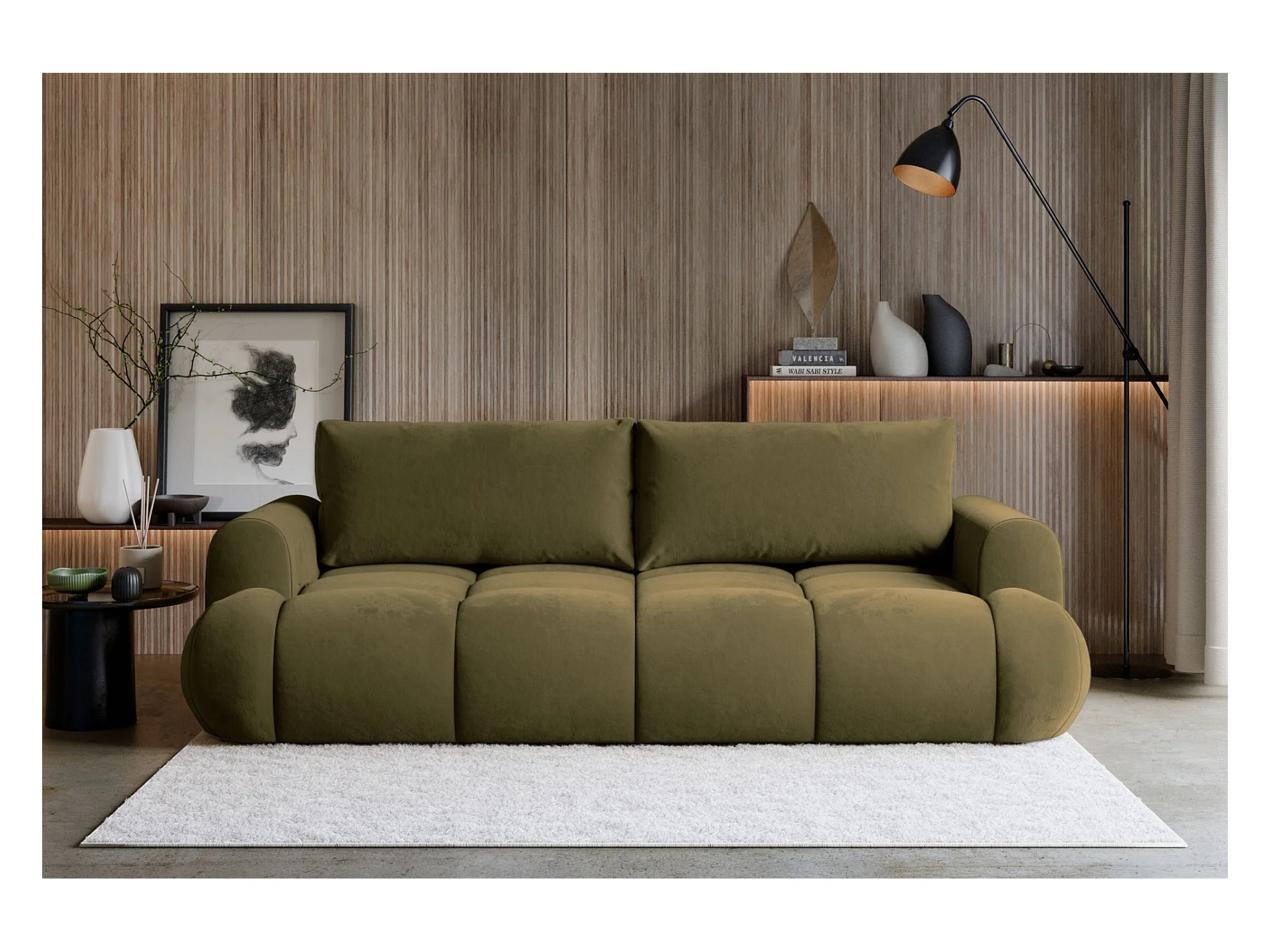 Canapé convertible 3 places – coffre de rangement – tissu velours hydrophobe – Vert olive – OMBO DOCE