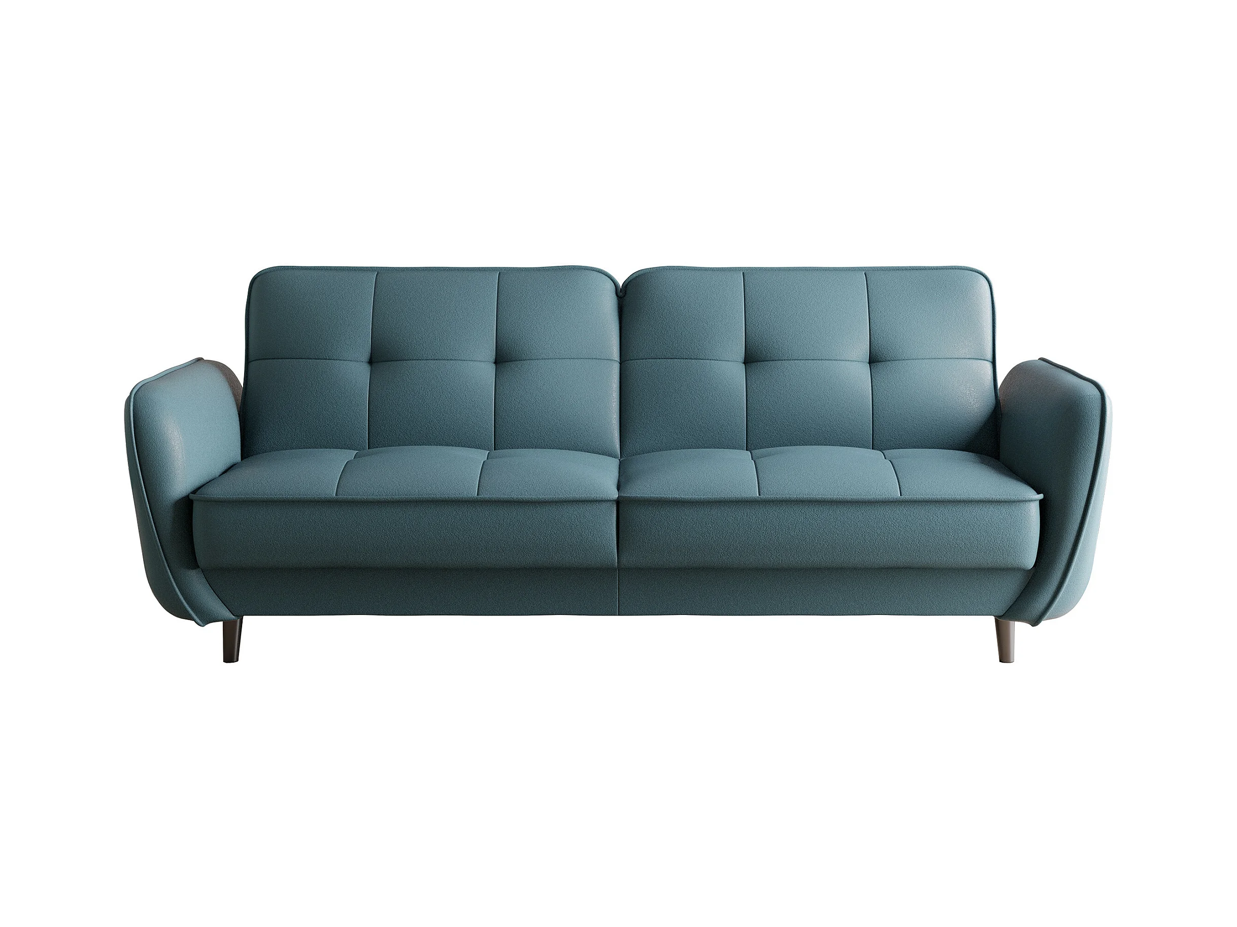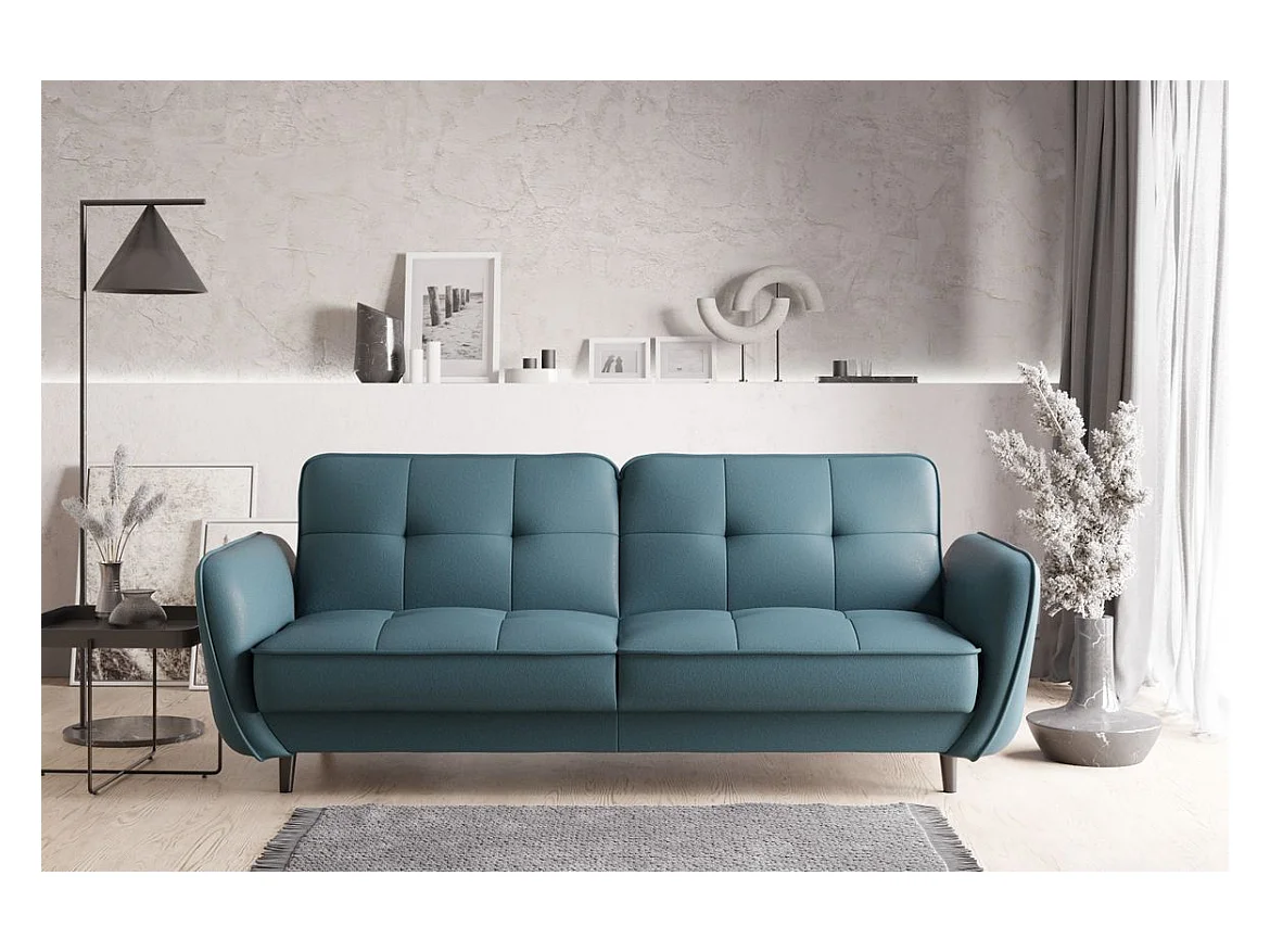 Canapé convertible 3 places tissu bleu canard capitonné et pieds bois noir Bizza 220cm