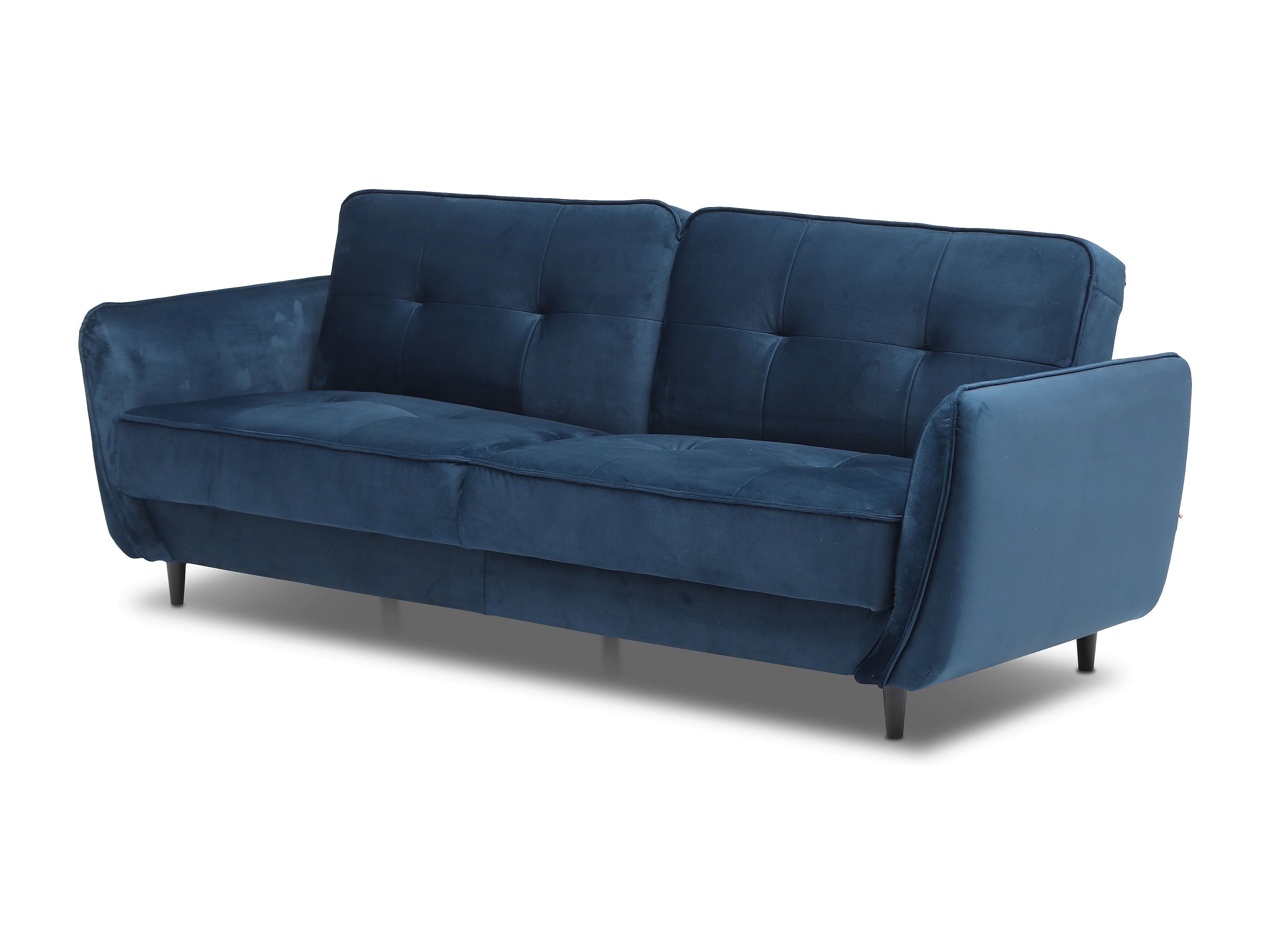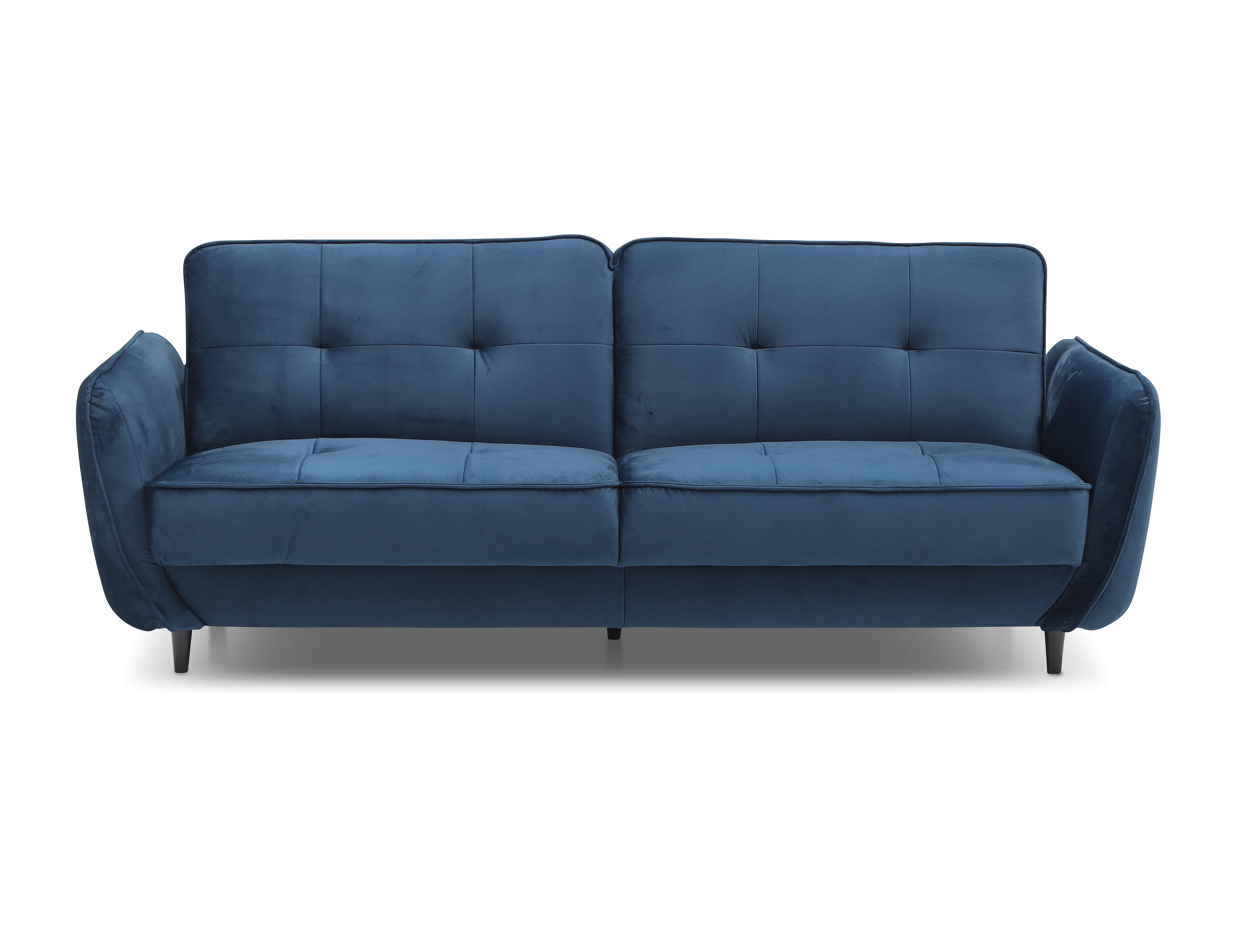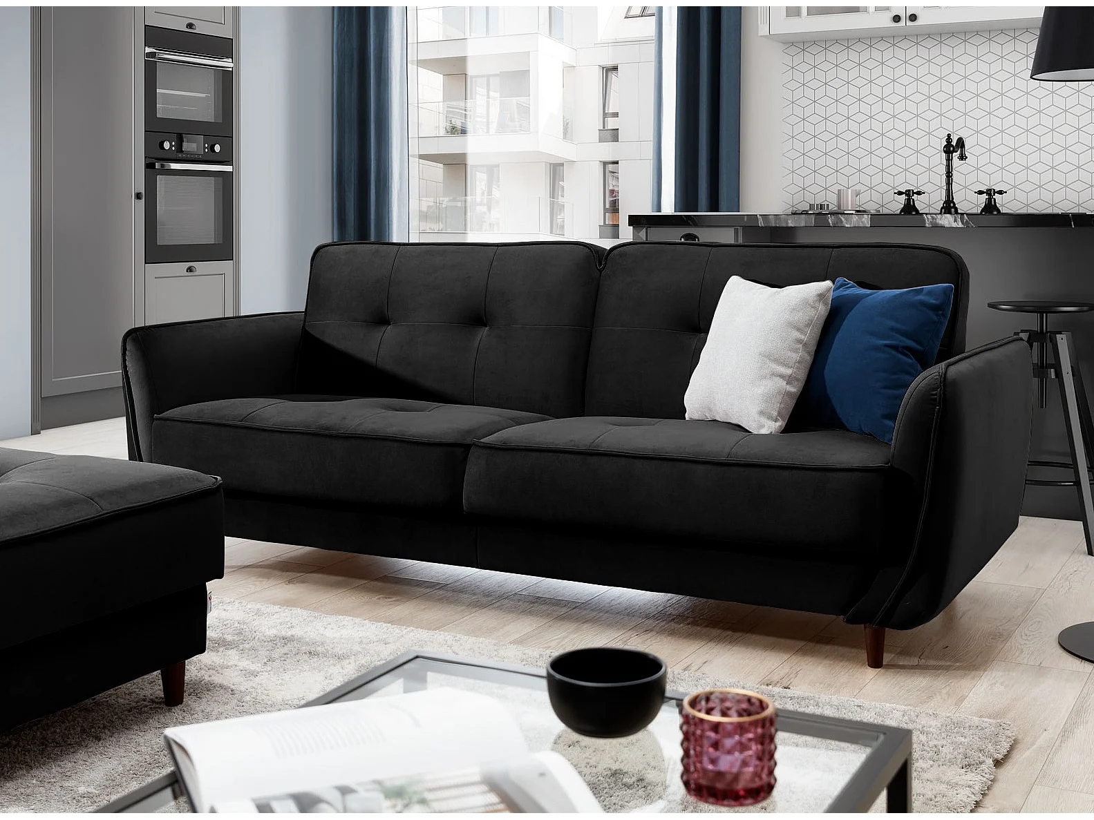 Canapé convertible 3 places velours noir capitonné et pieds bois noir Bizza 220cm