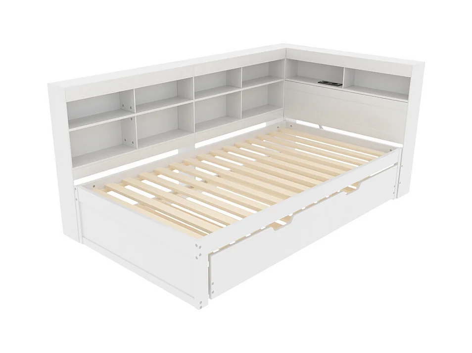 Canapé convertible 90x200, lit gigogne 90x190 avec prise USB et plusieurs rangements, lit en bois massif, lit simple, bois, blanc.