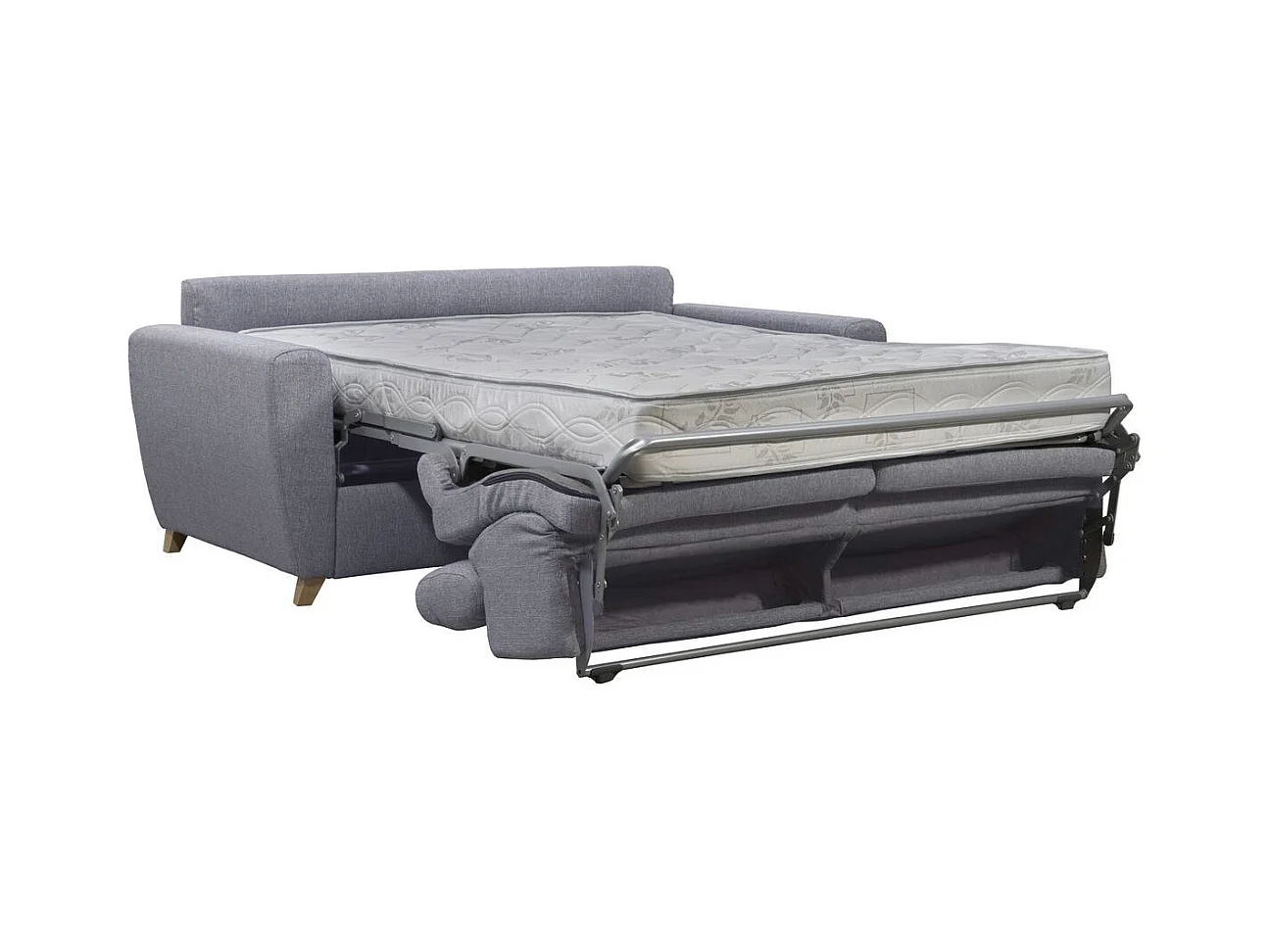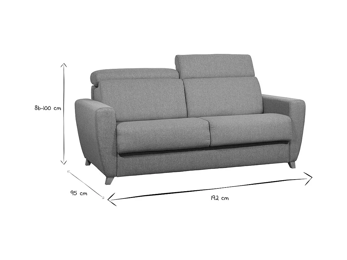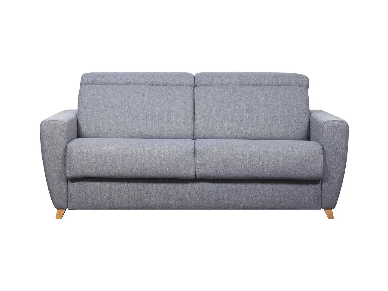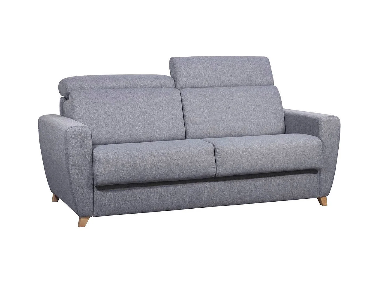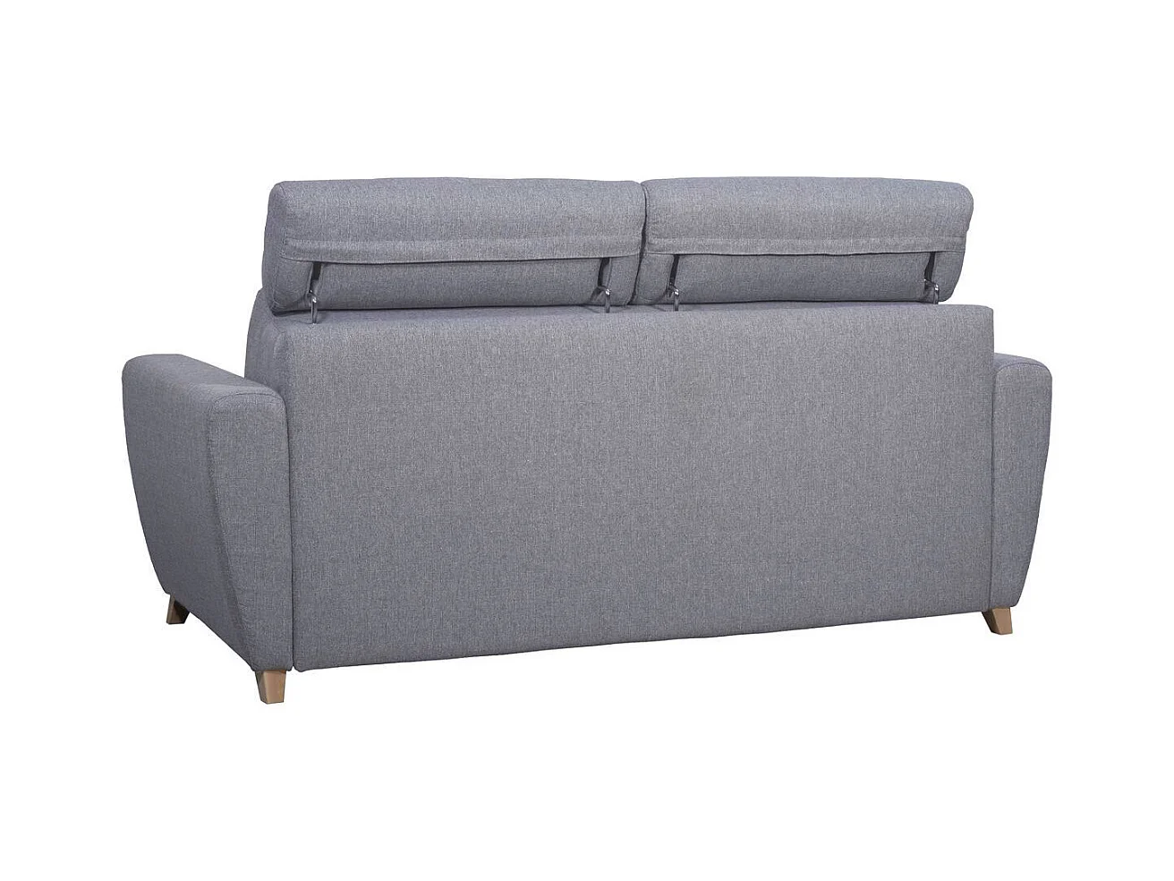 Canapé convertible avec têtières ajustables 3 places en tissu gris et bois clair et matelas 18 cm GOYA