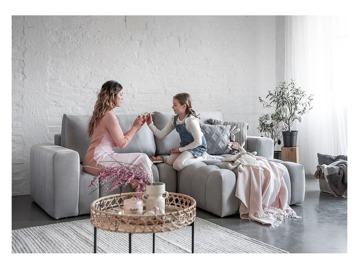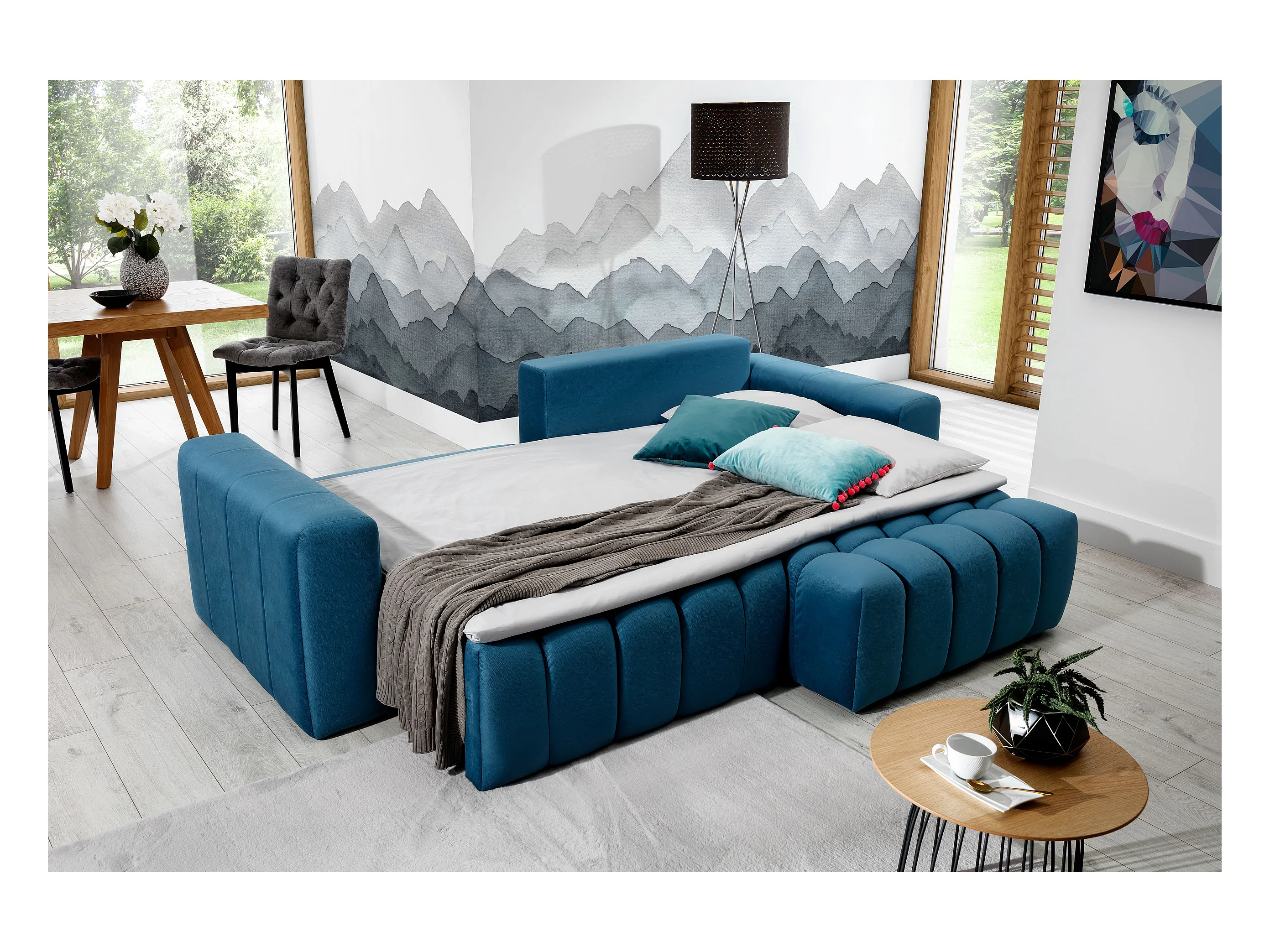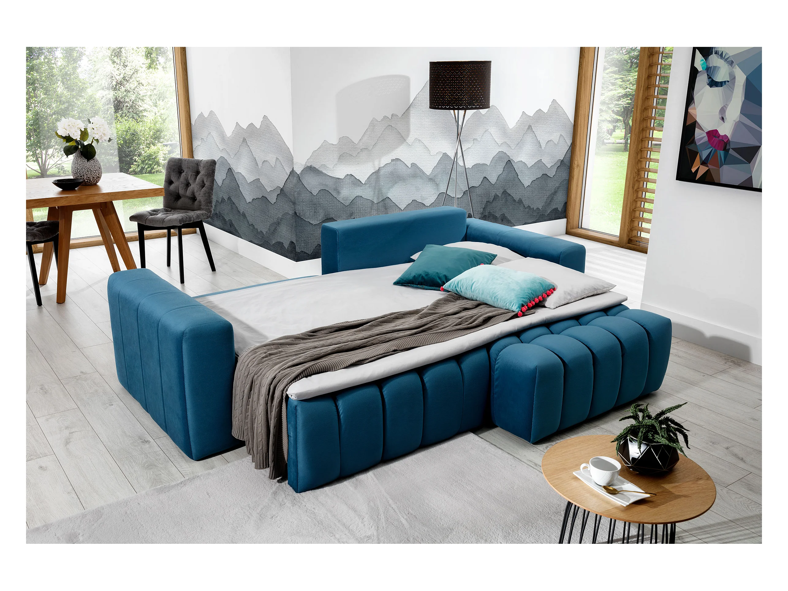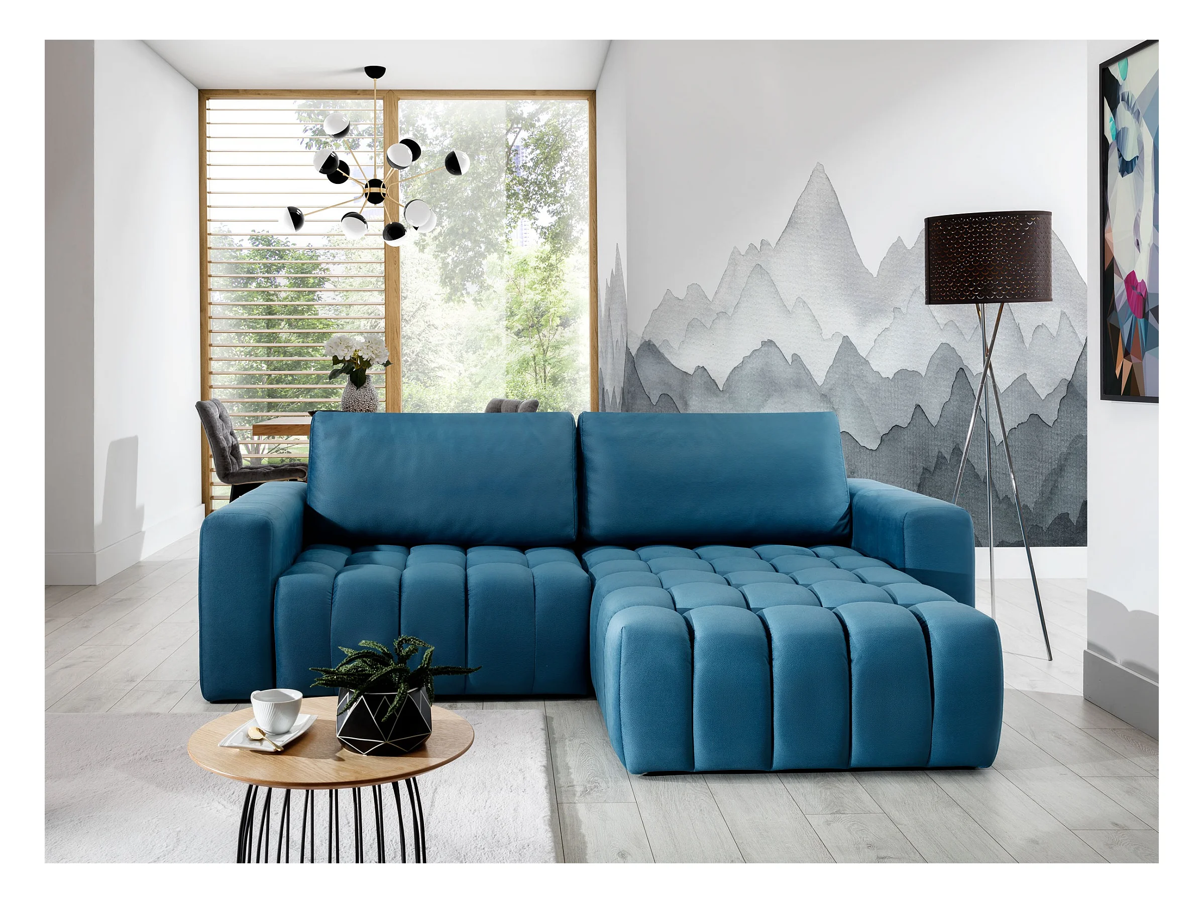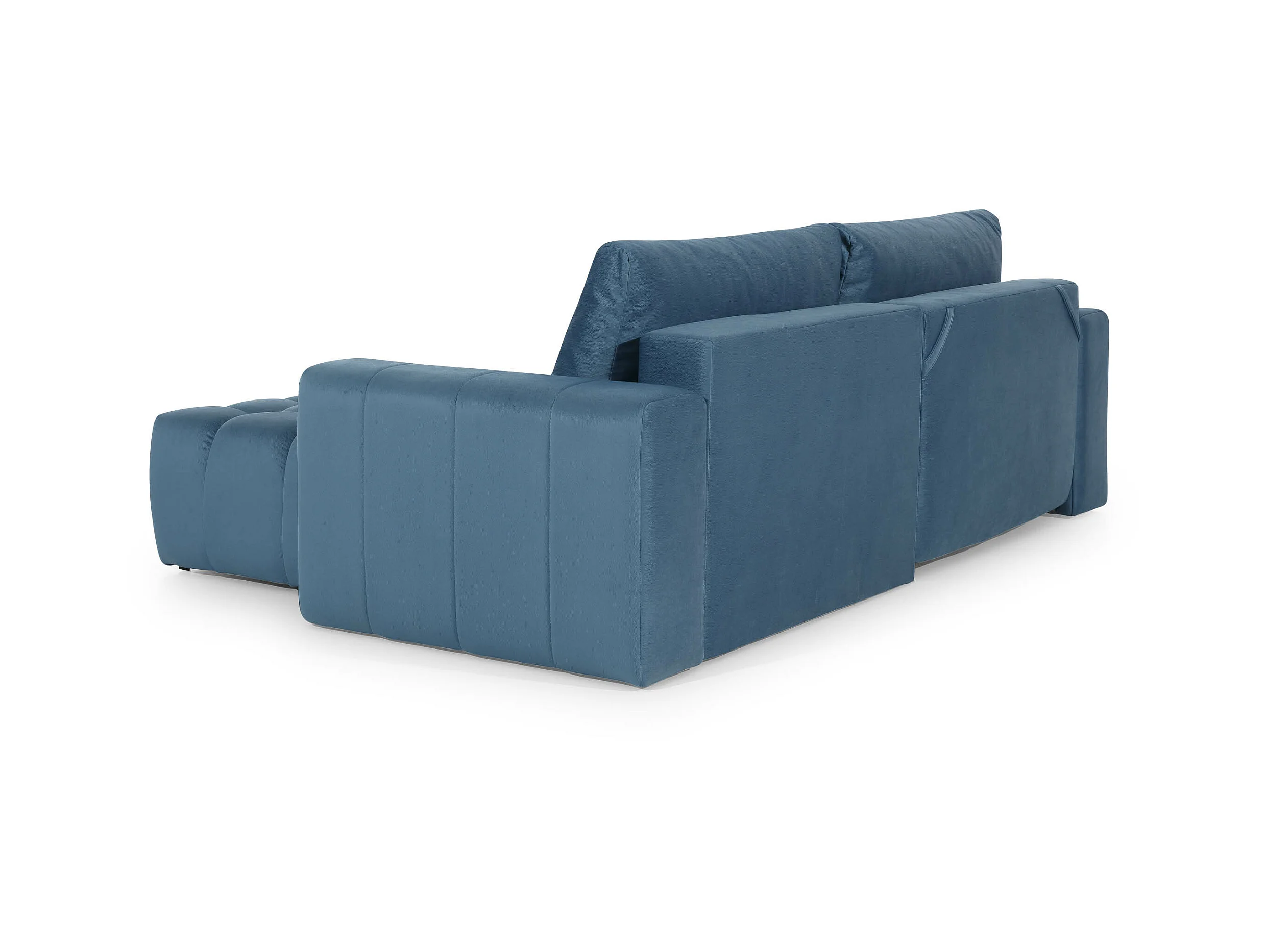Canapé convertible design velours matelassé bleu canard angle droit Bozen 250cm