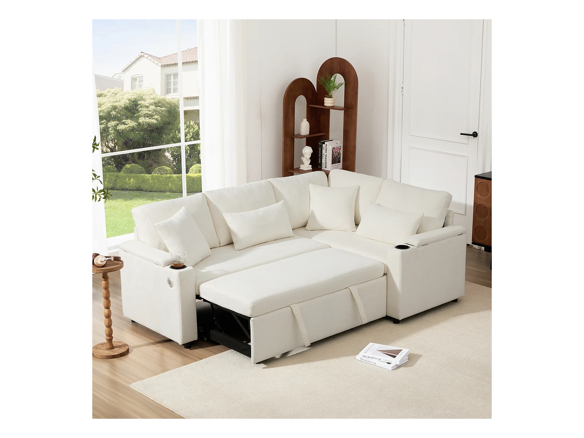Canapé convertible extensible avec rangement - 206.5 x 141 x 86 cm - avec USB + 2 coussins - velours - beige
