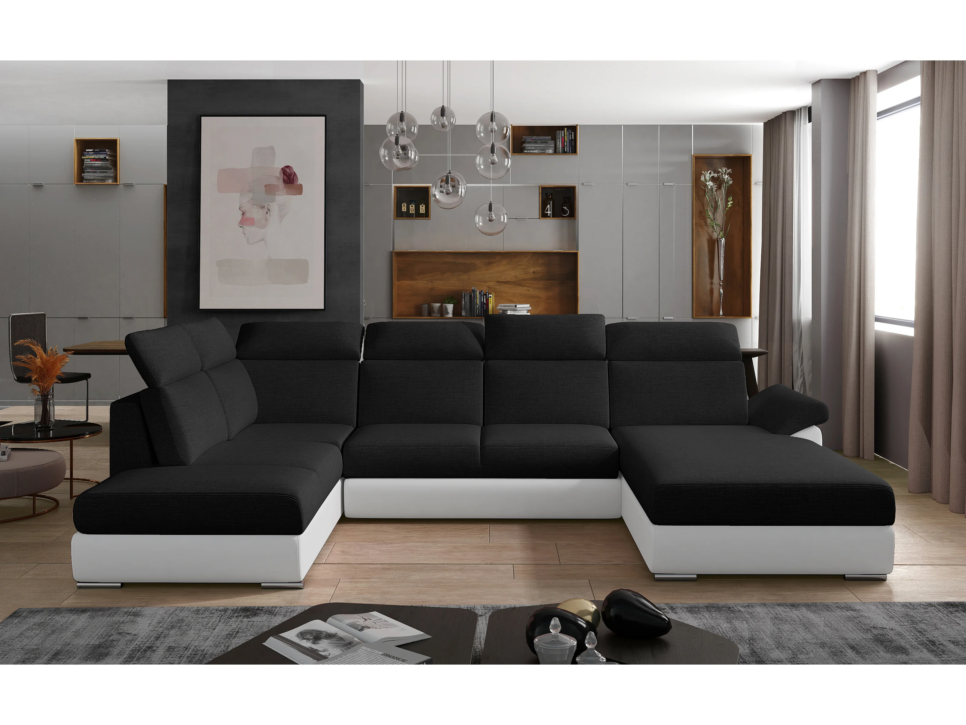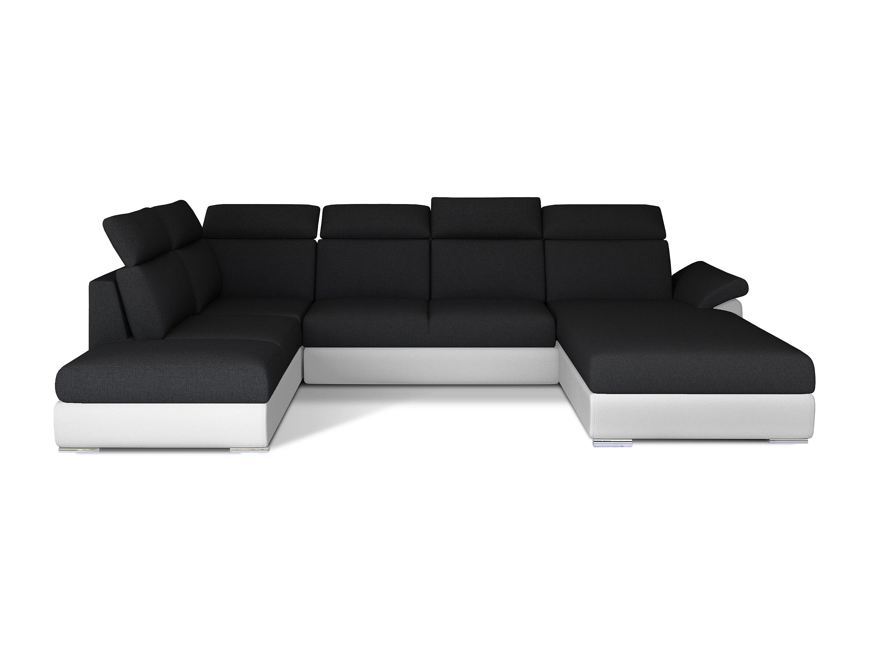 Canapé Convertible Panoramique LEVANO Tissu et Simili Cuir, Têtières-Blanc/Noir-Coffre à droite