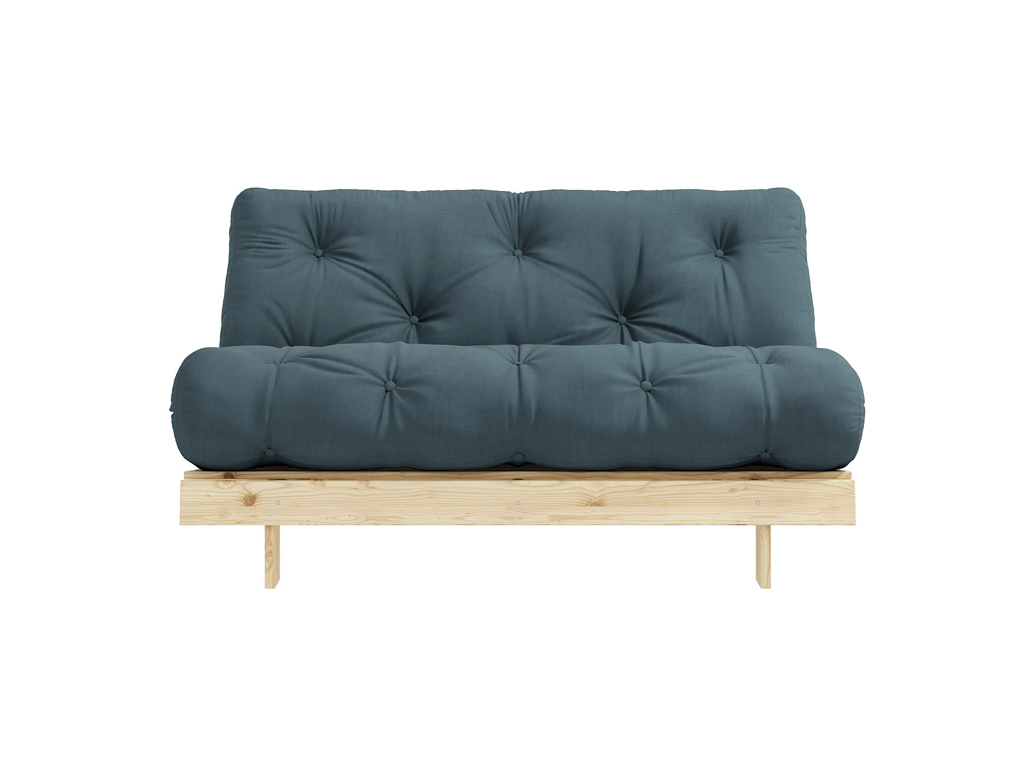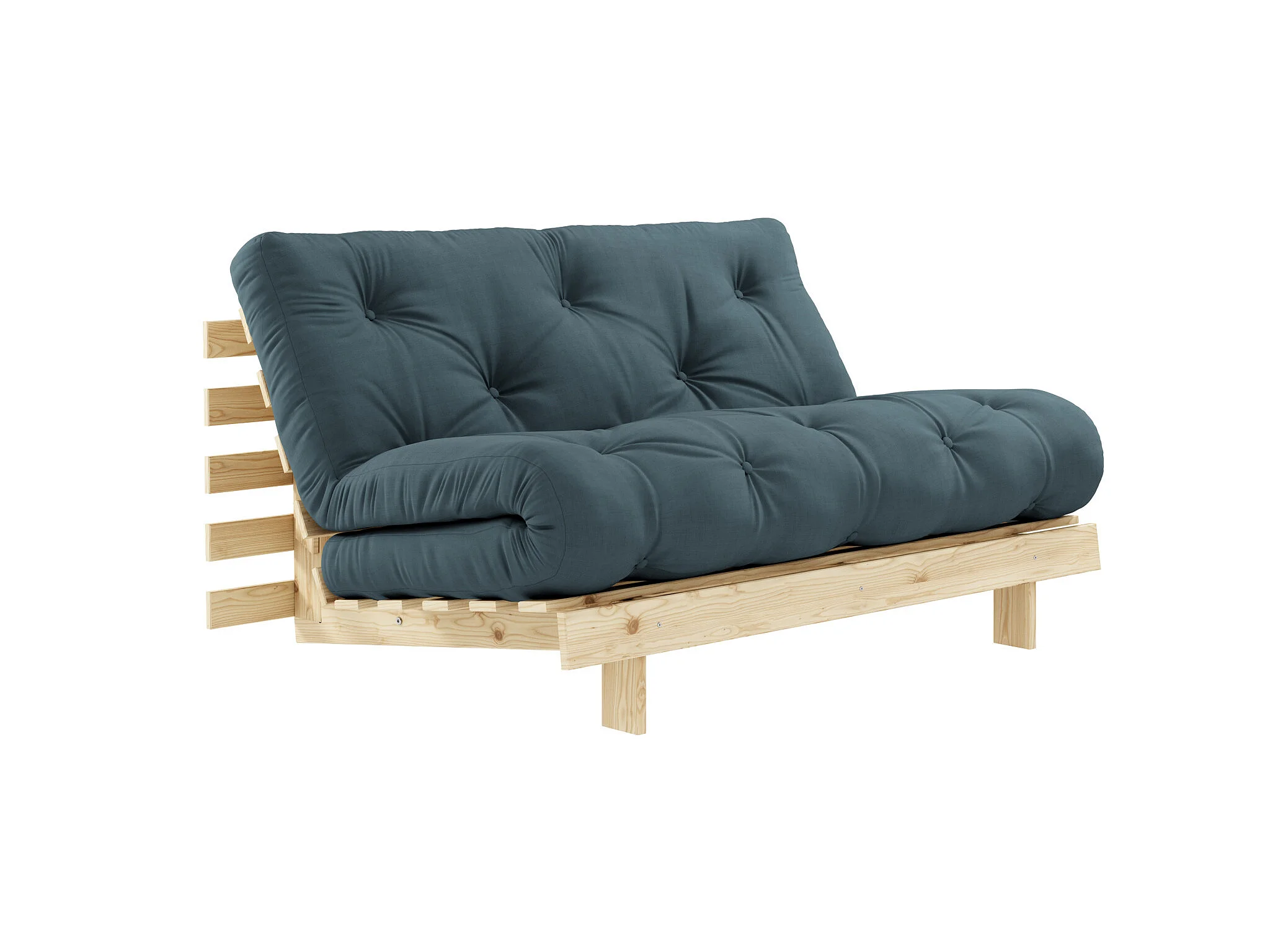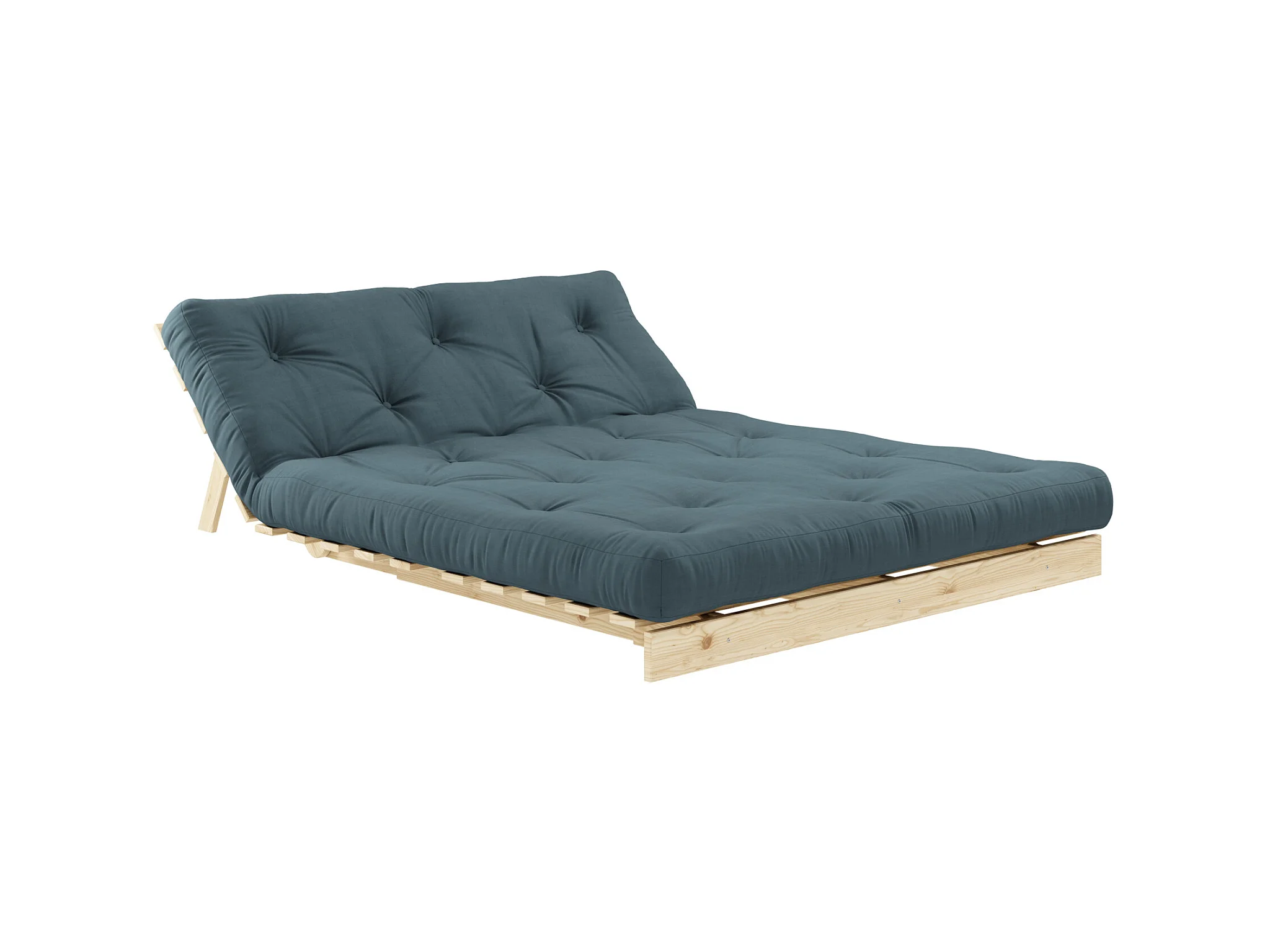 Canapé convertible ROOTS en pin massif naturel avec matelas futon bleu canard 140x200