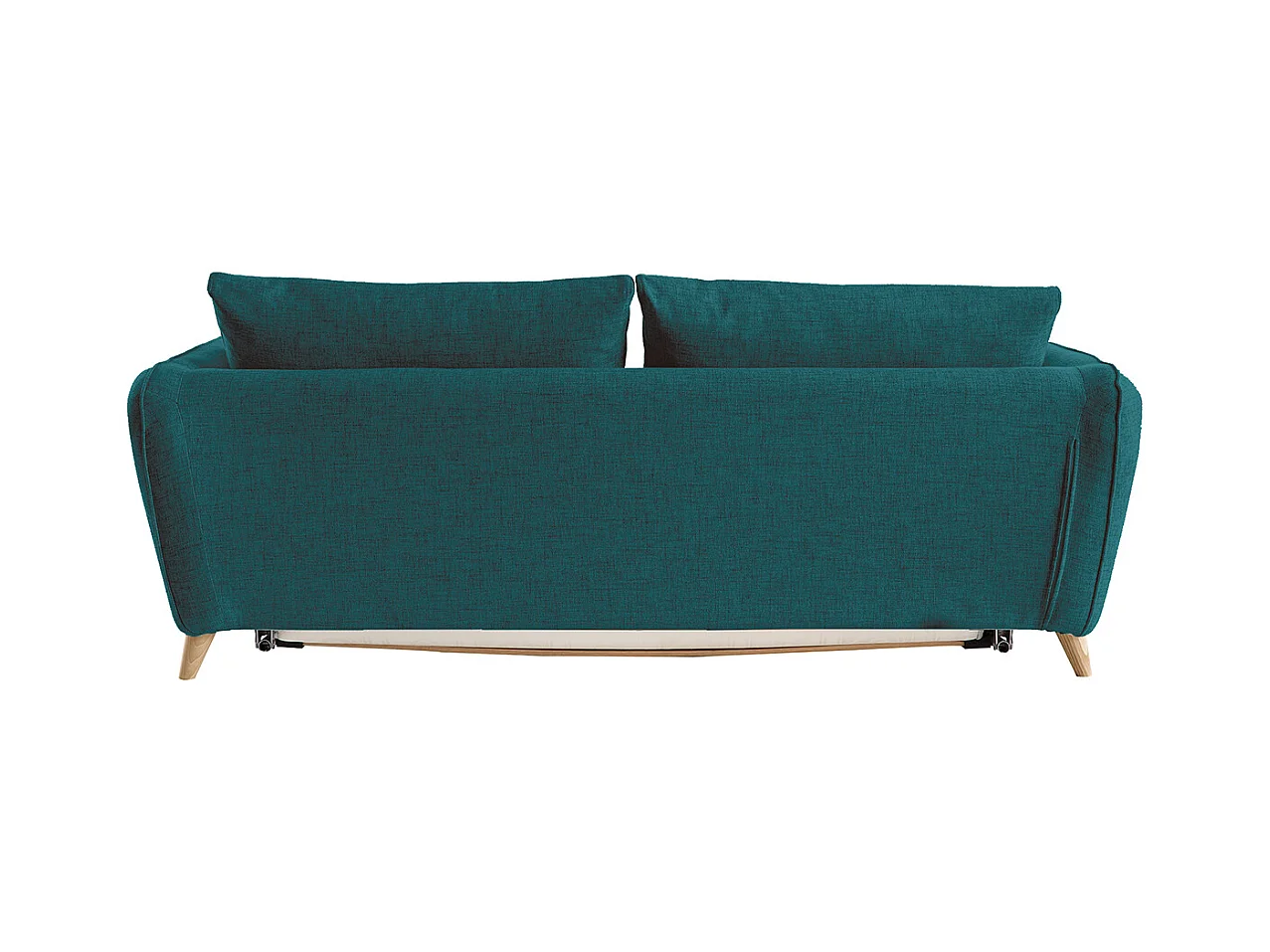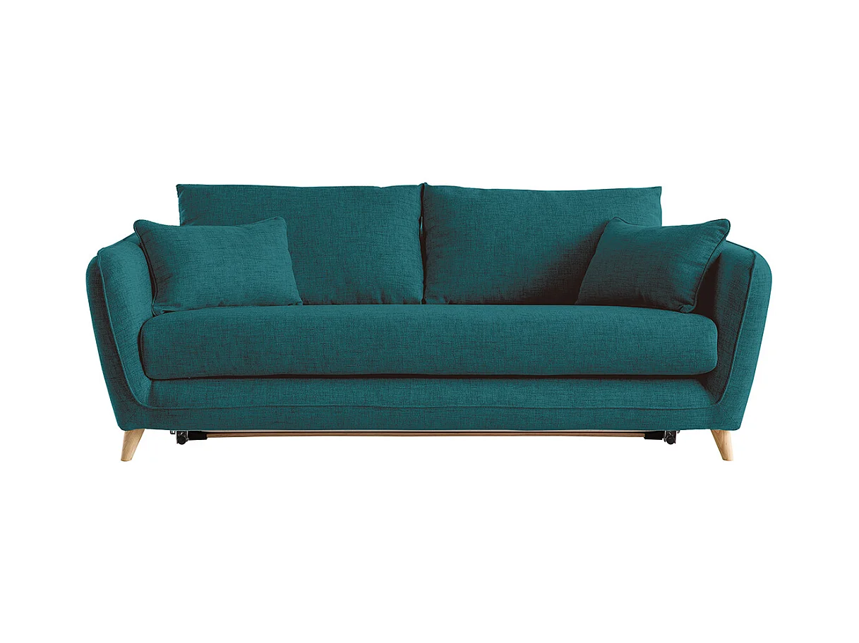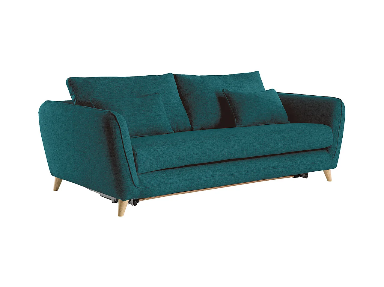 Canapé convertible scandinave 3 places en tissu bleu paon et bois clair avec matelas 10 cm CREEP