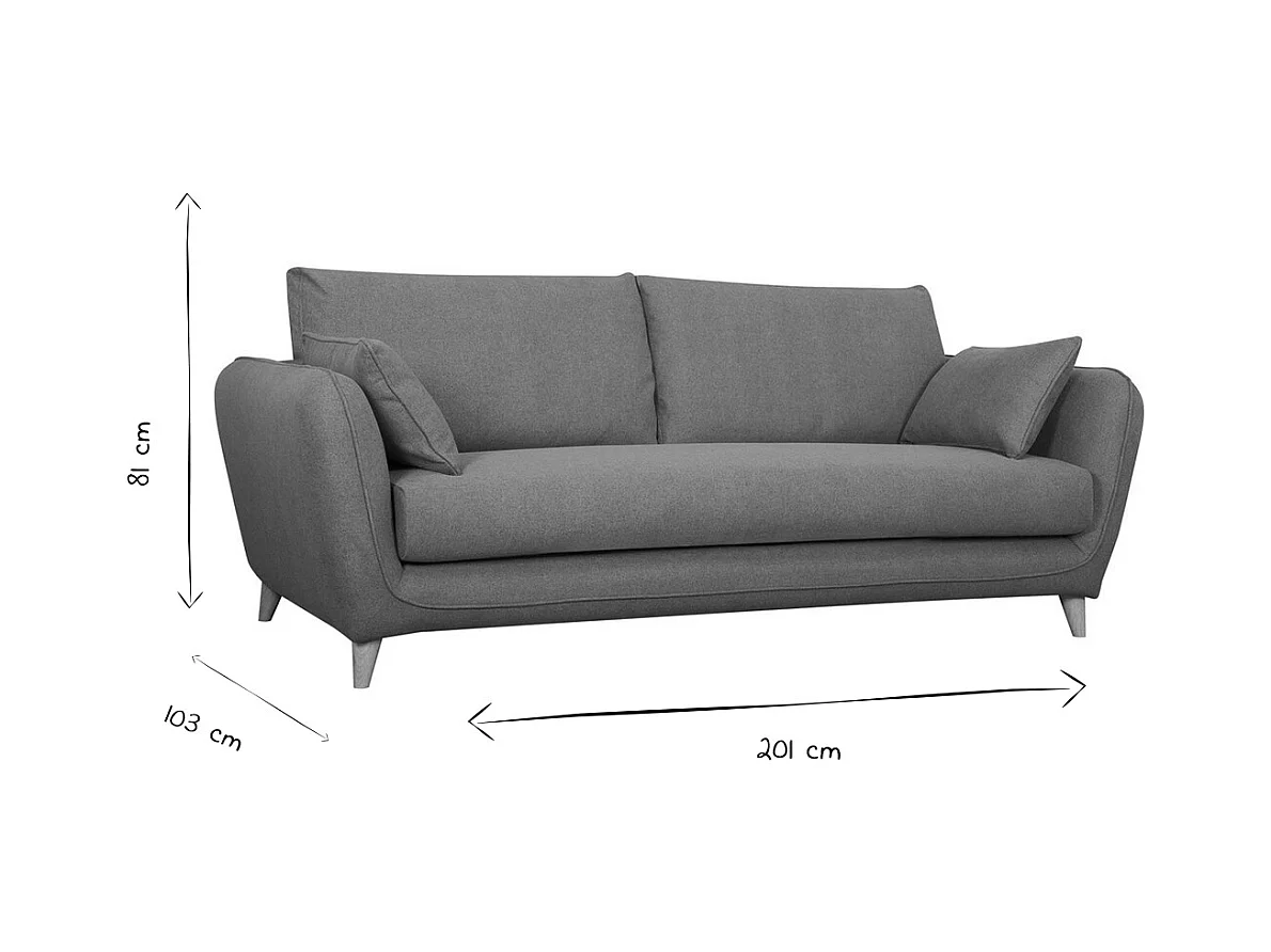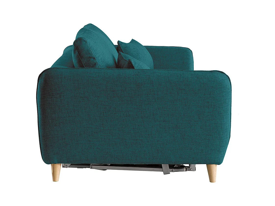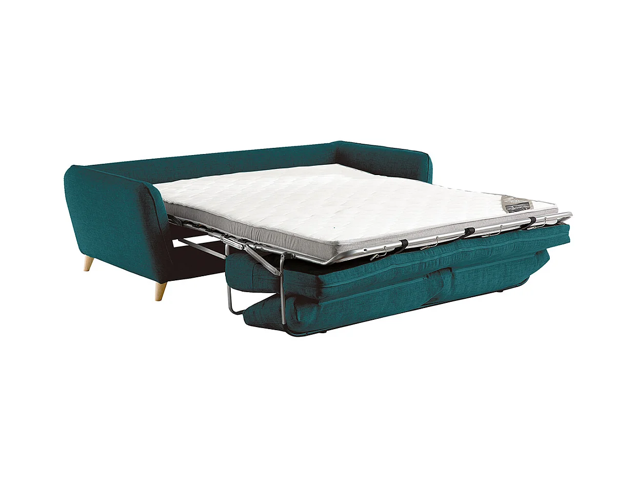 Canapé convertible scandinave 3 places en tissu bleu paon et bois clair avec matelas 10 cm CREEP