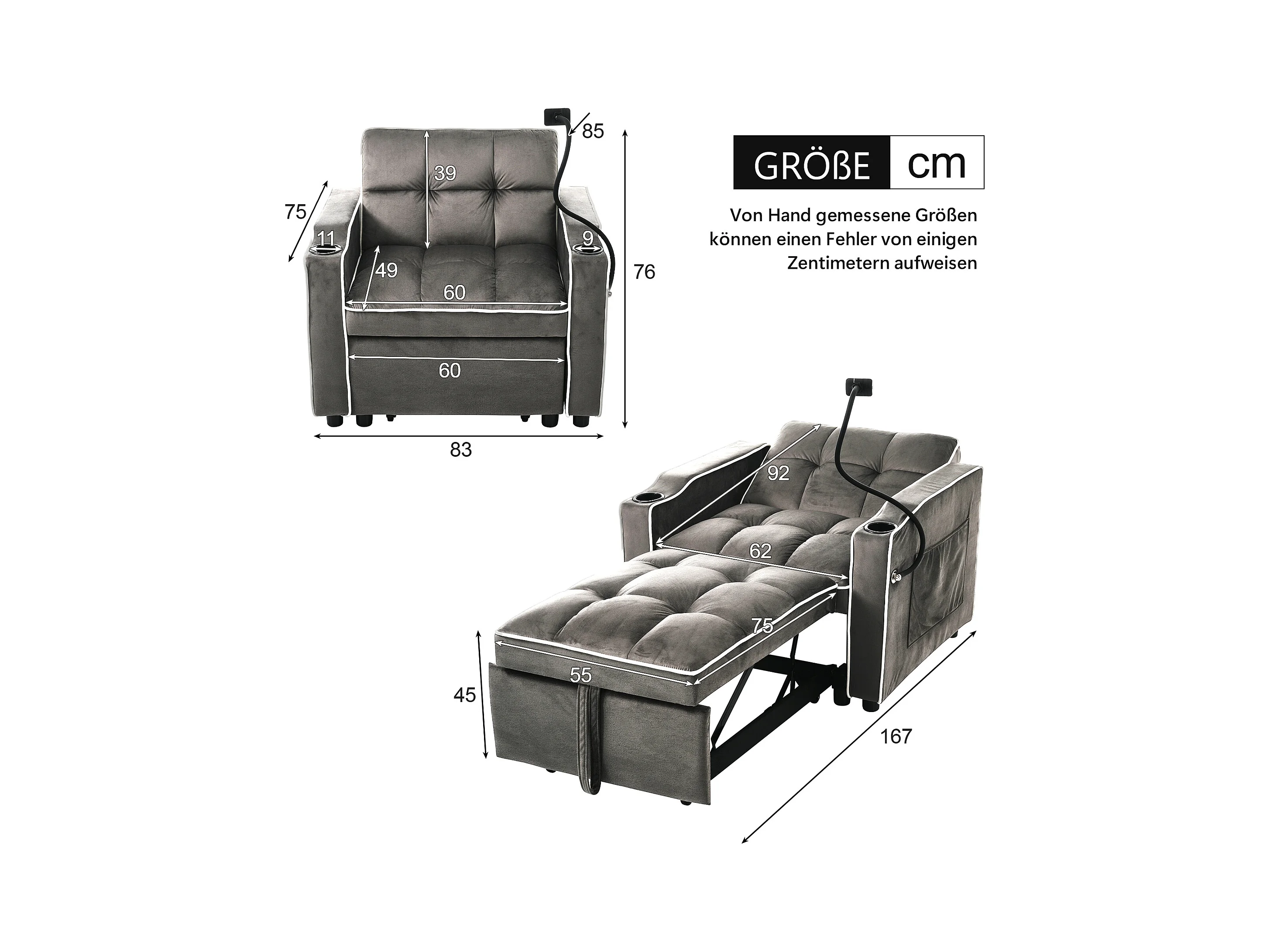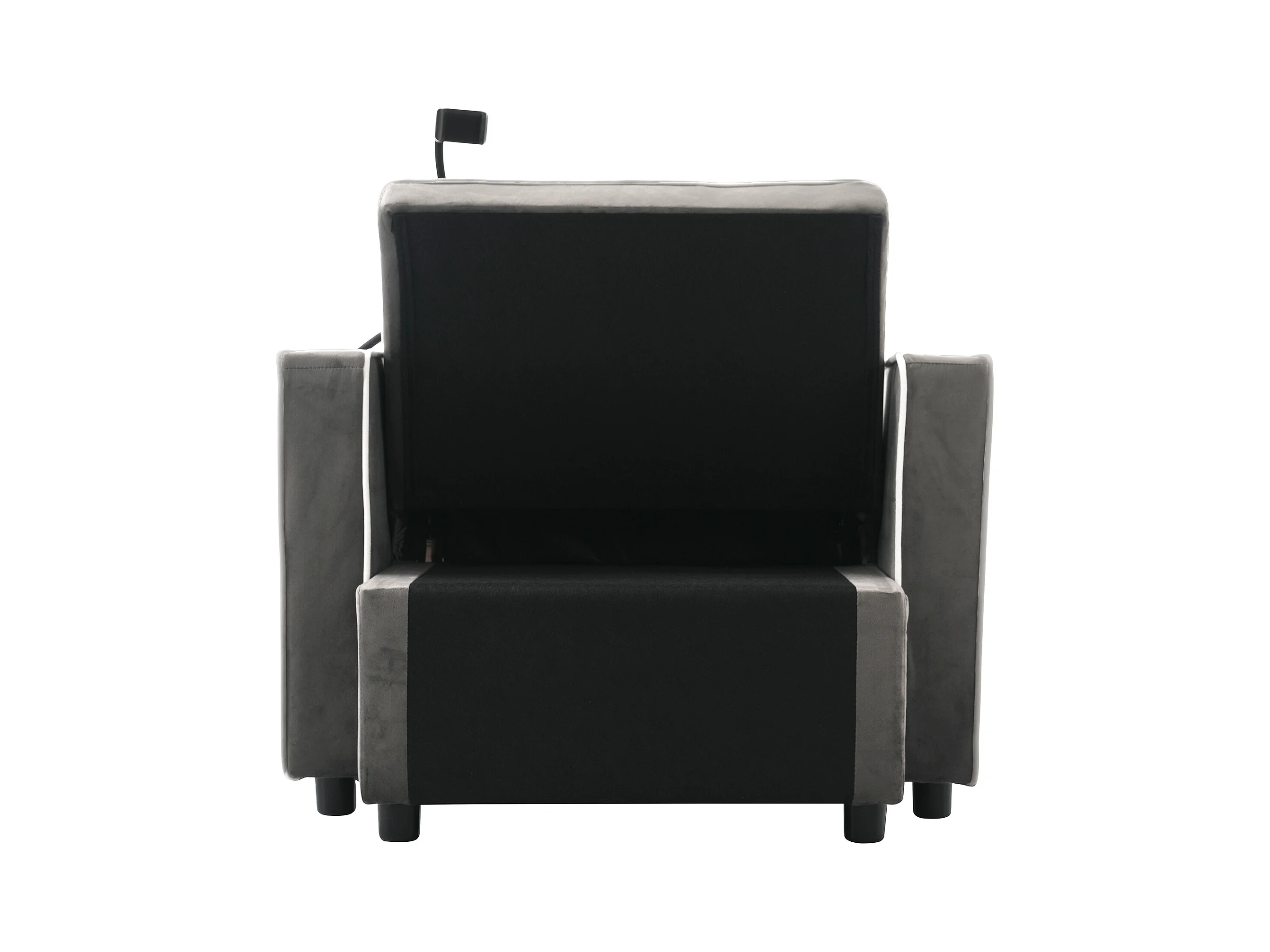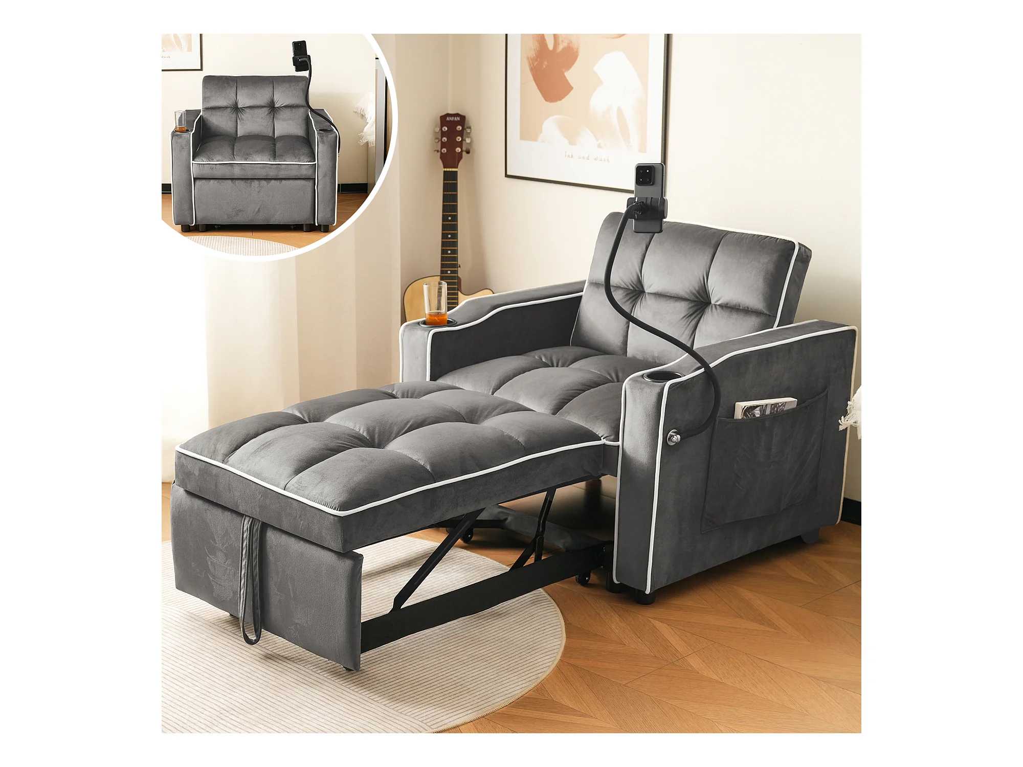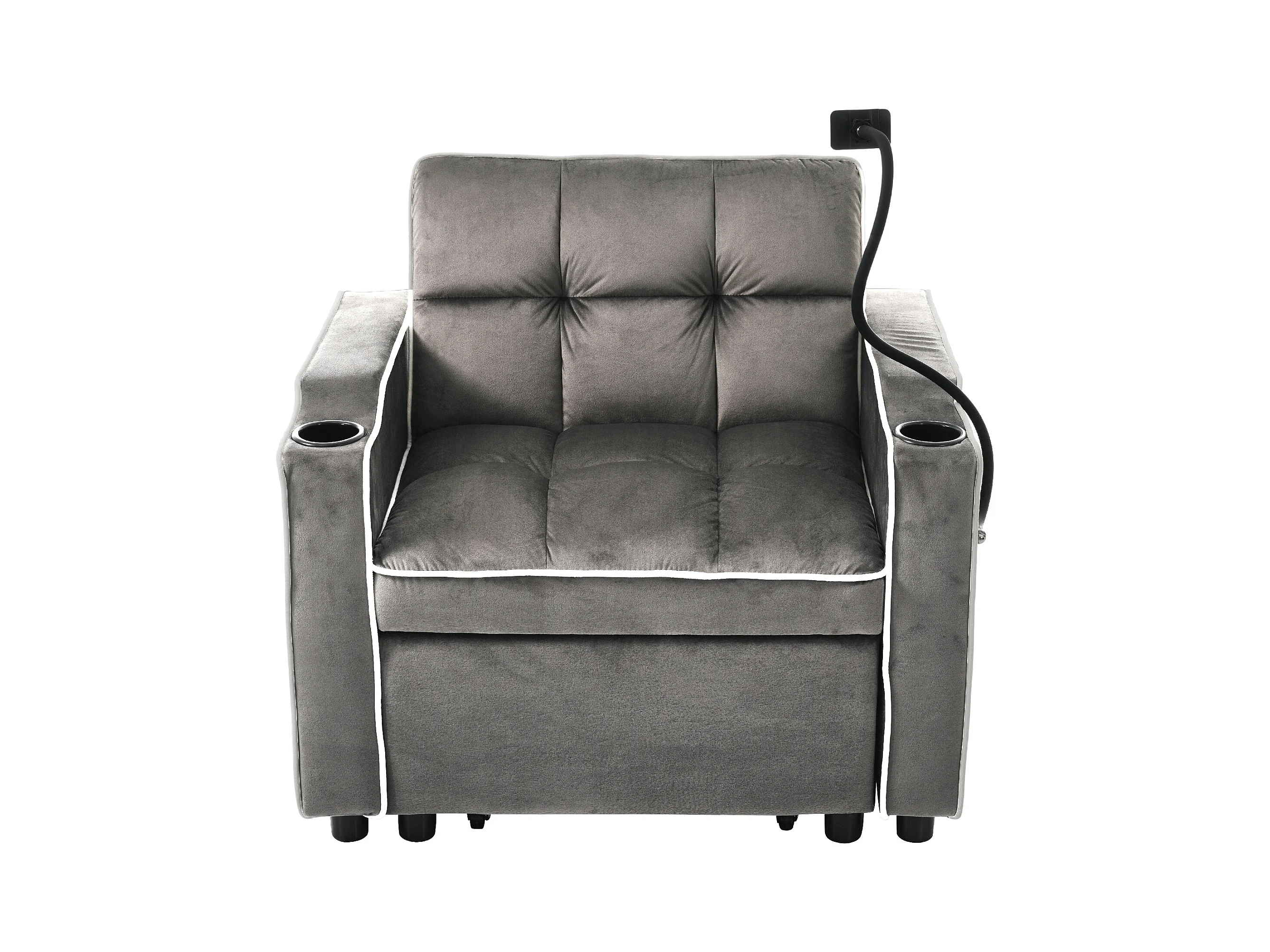 Canapé convertible, velours gris foncé, Canapé simple avec support téléphone et porte-gobelet, pour salon et chambre
