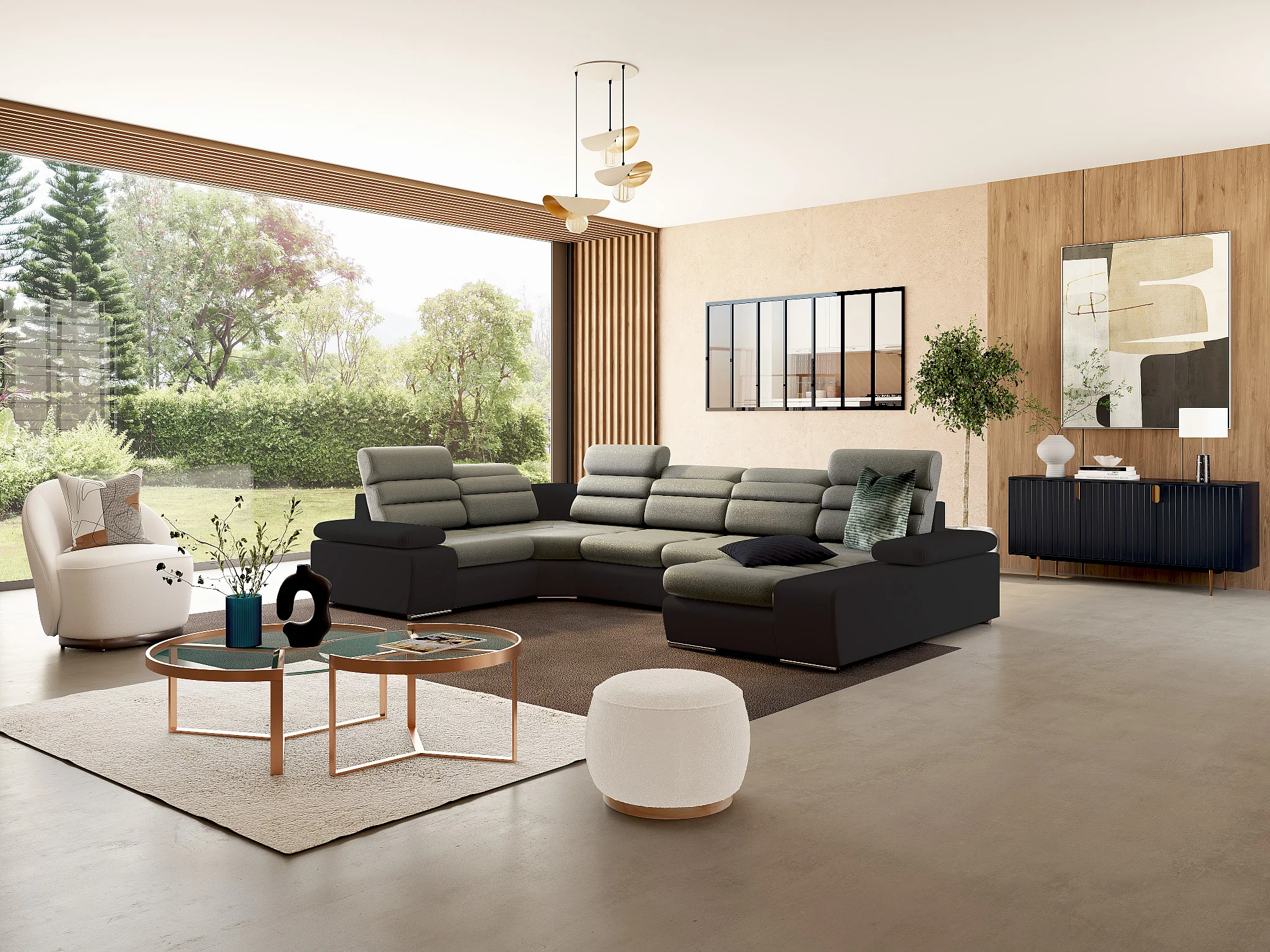 Canapé d'angle panoramique convertible en tissu et simili BOILEAU - Bicolore beige/marron - Angle droit
