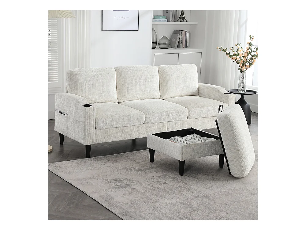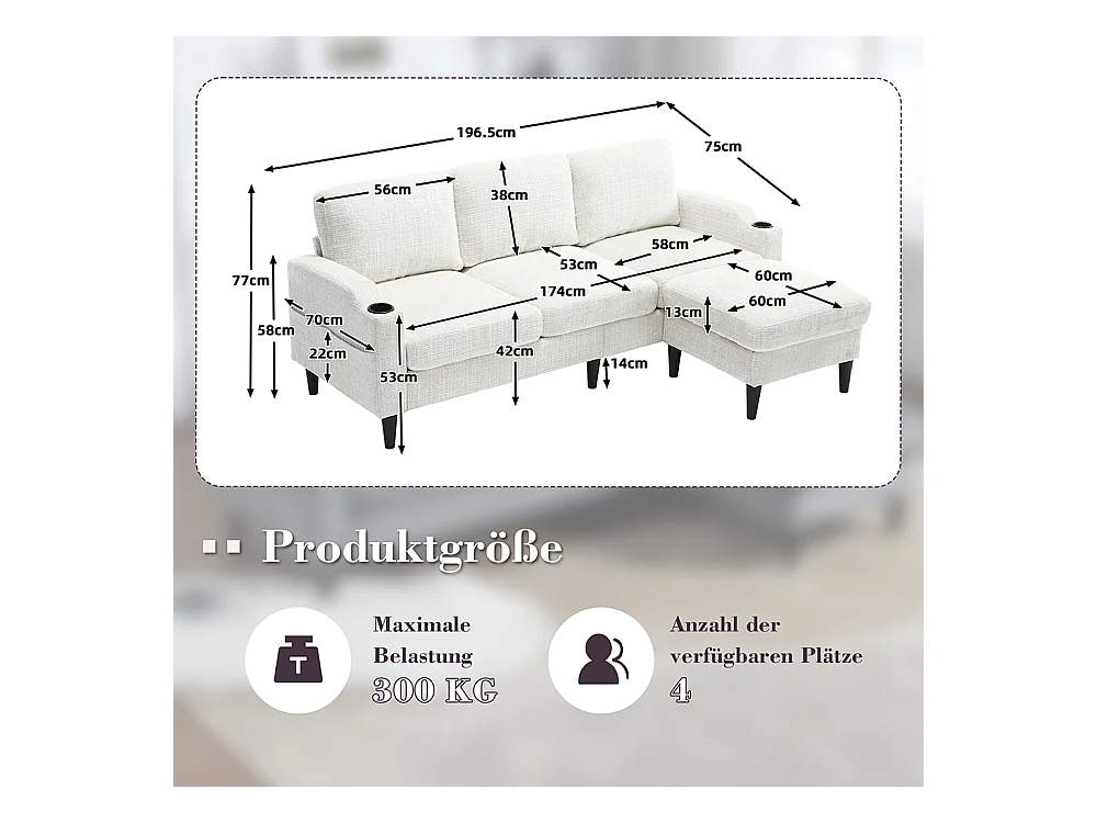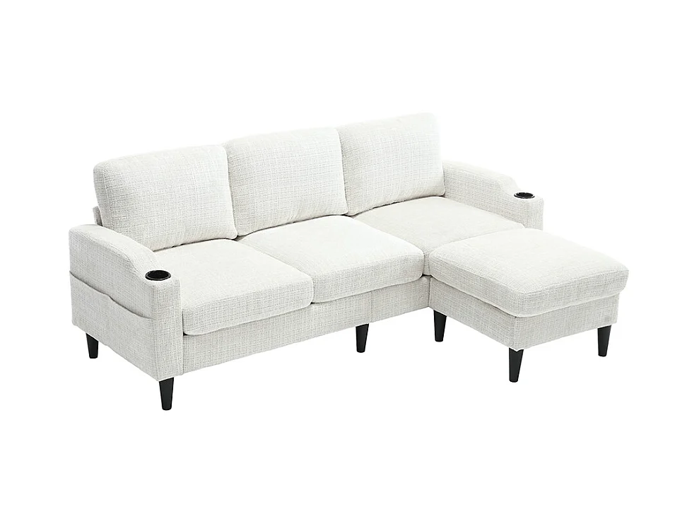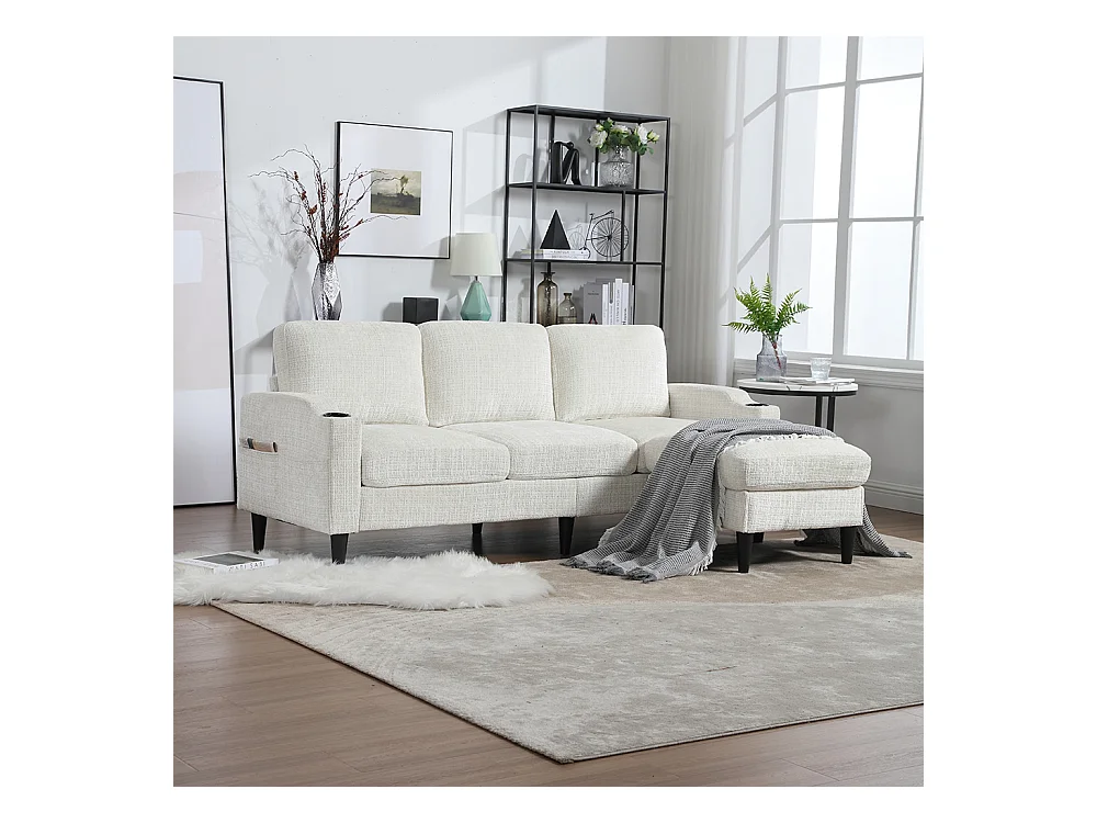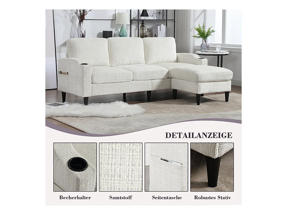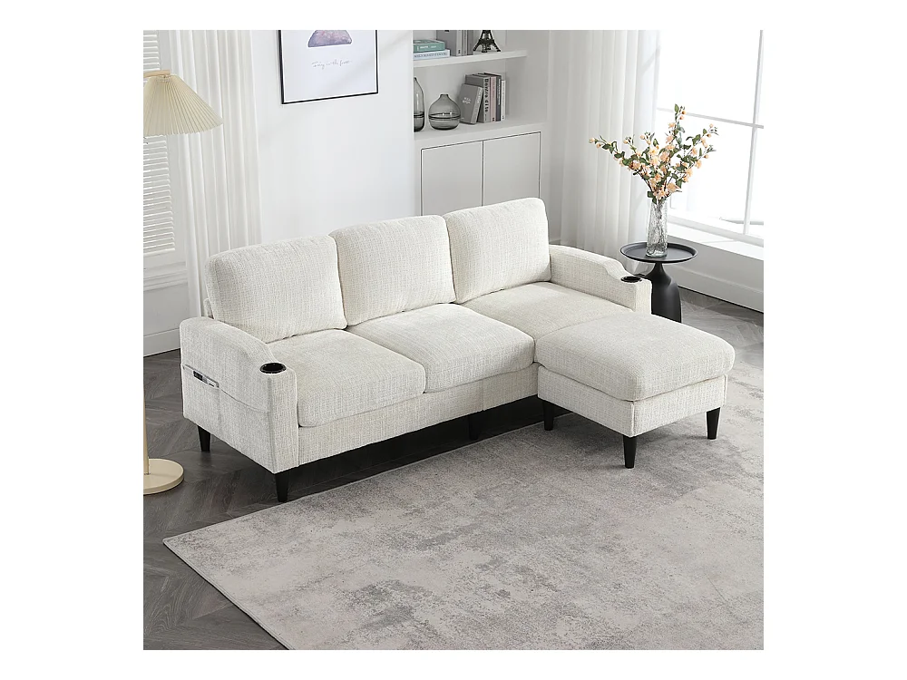 Canapé d'angle 4 places avec pouf et coffre de rangement accoudoirs porte-gobelets poches latérales pieds en plastique revêtement en chenille beige