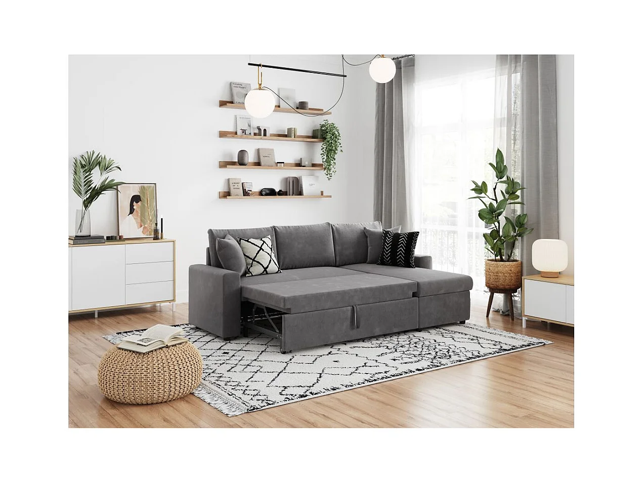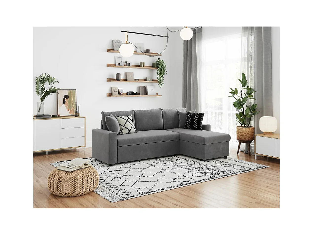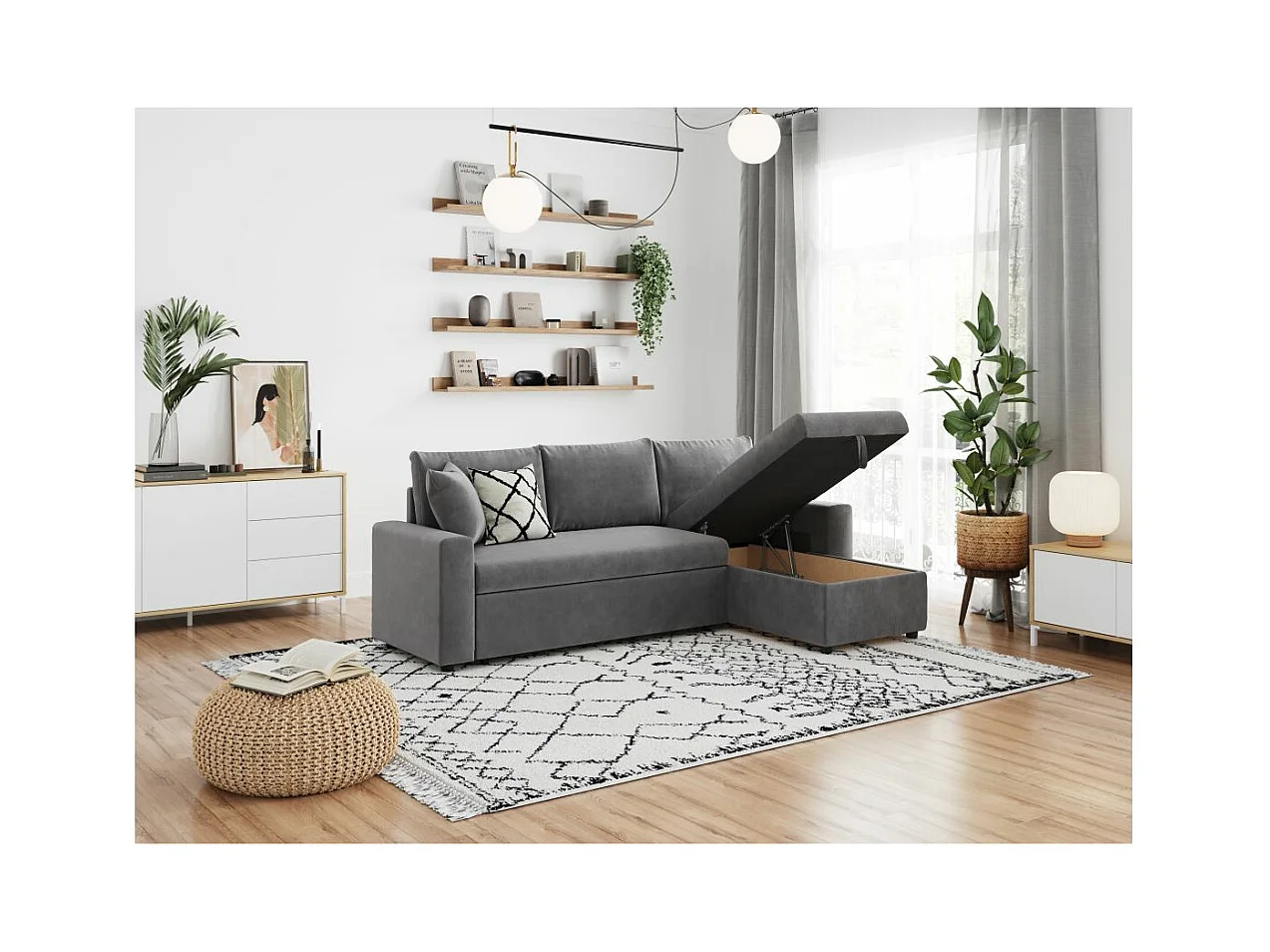 Canapé d'angle 4 places Convertible et Réversible Maria avec Coffre en microfibre - Gris - L227 x P146 x H81cm - Loungitude
