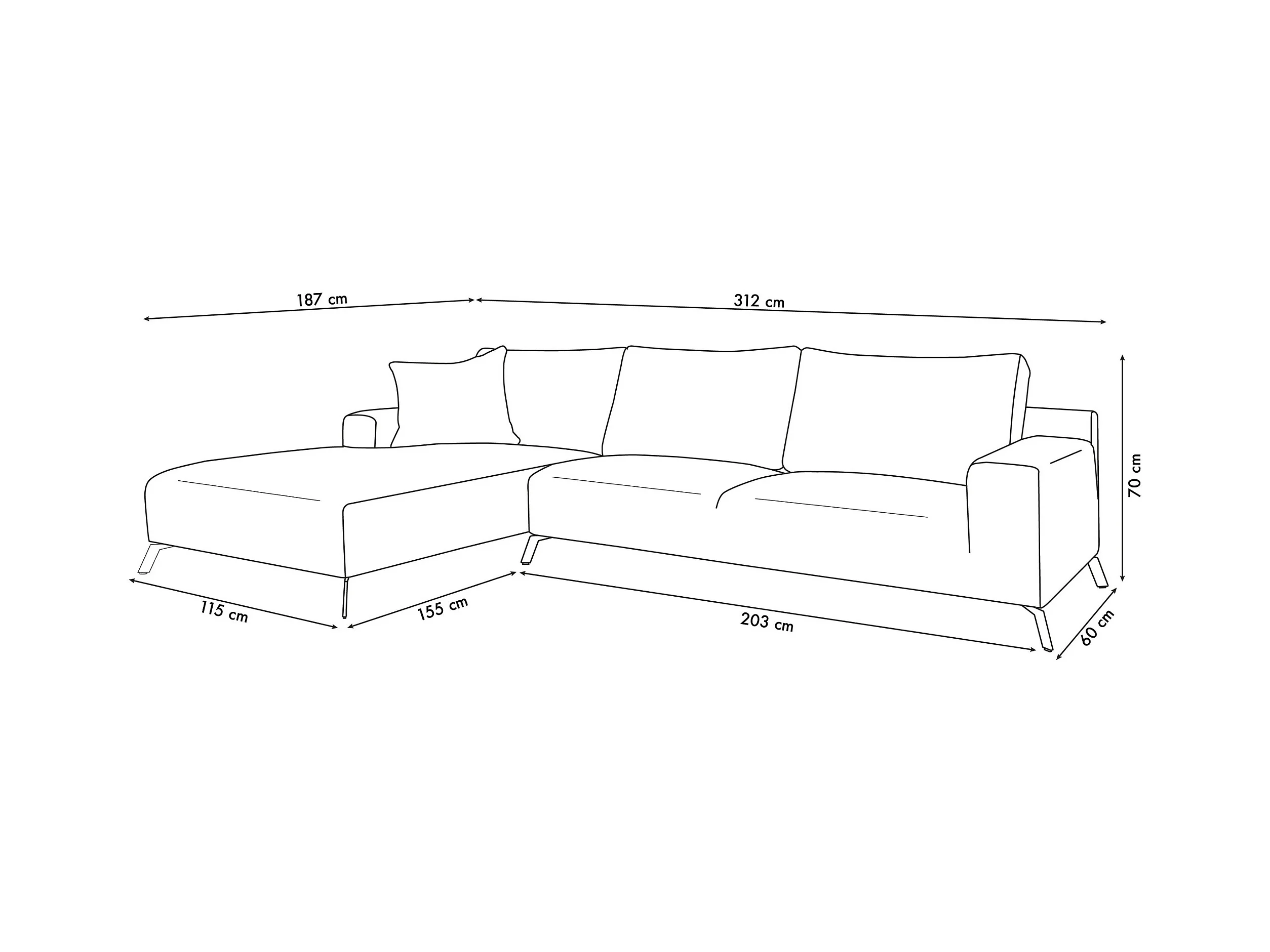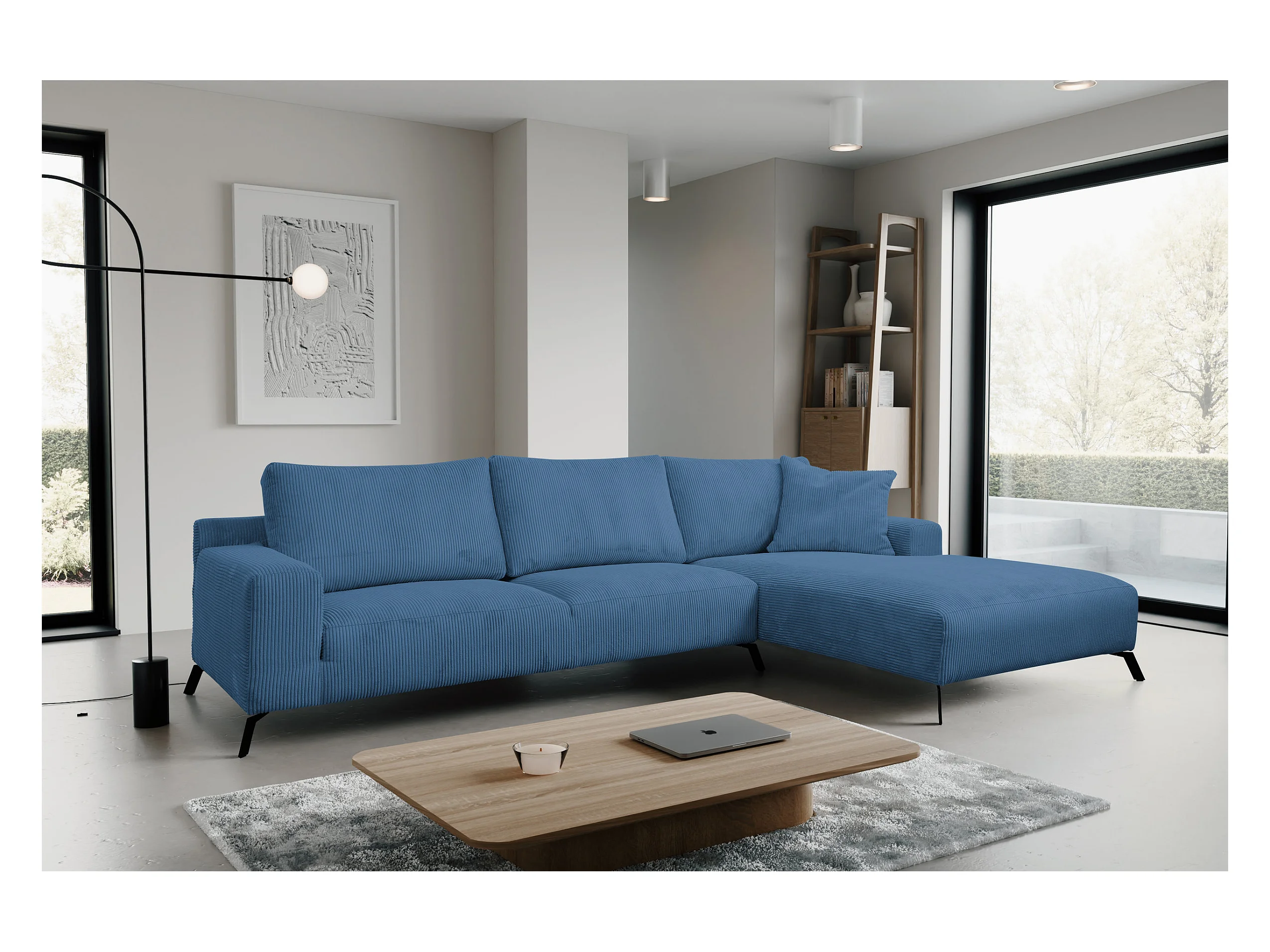 Canapé d'angle Aspen, couleur du canapé : bleu, tissu velours côtelé, pouf à droite