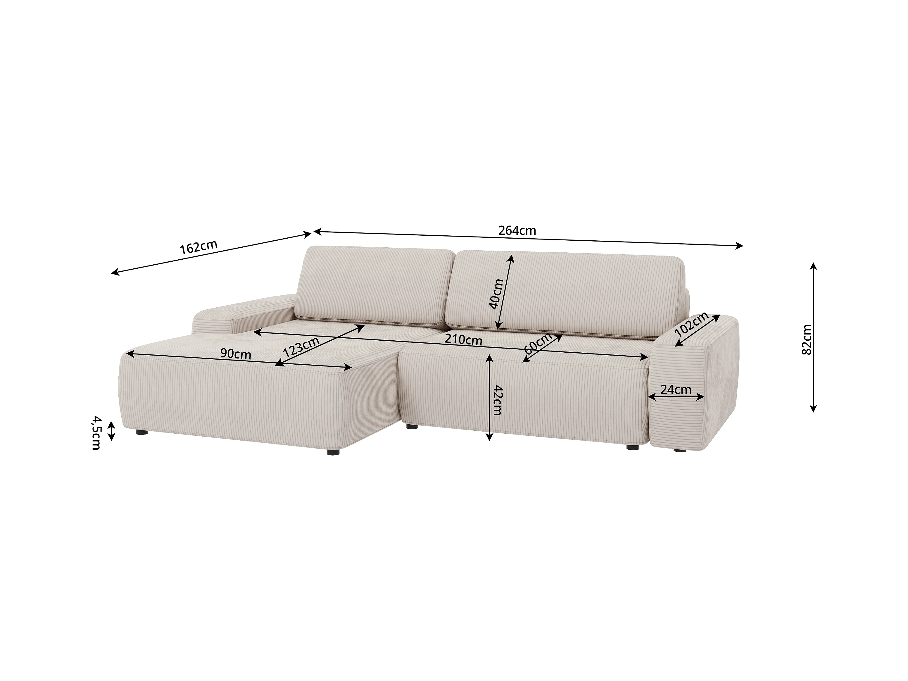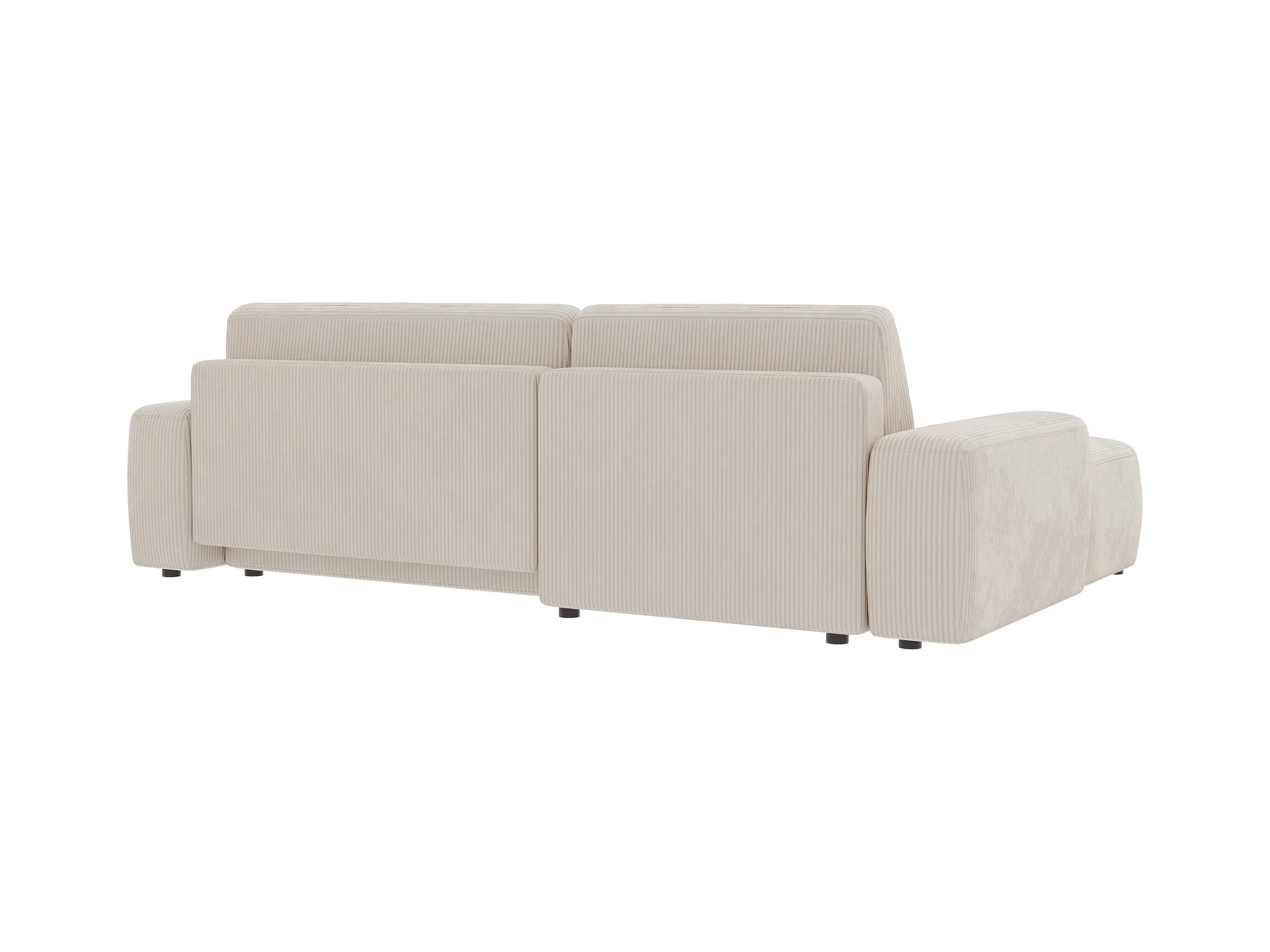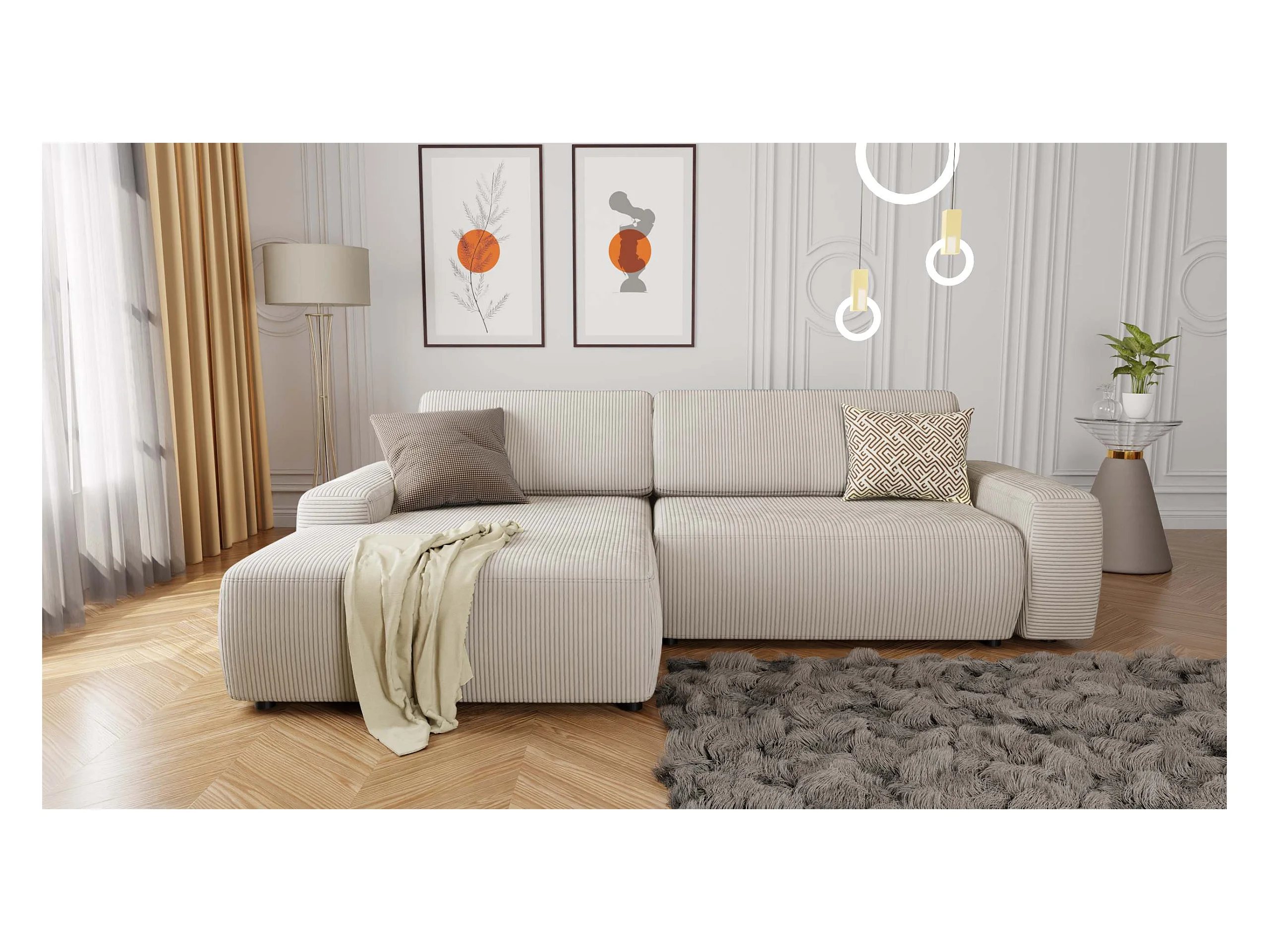Canapé d’angle avec fonction lit et coffre de rangement en tissu côtelé beige, offrant un agréable confort d’assise EVERLY