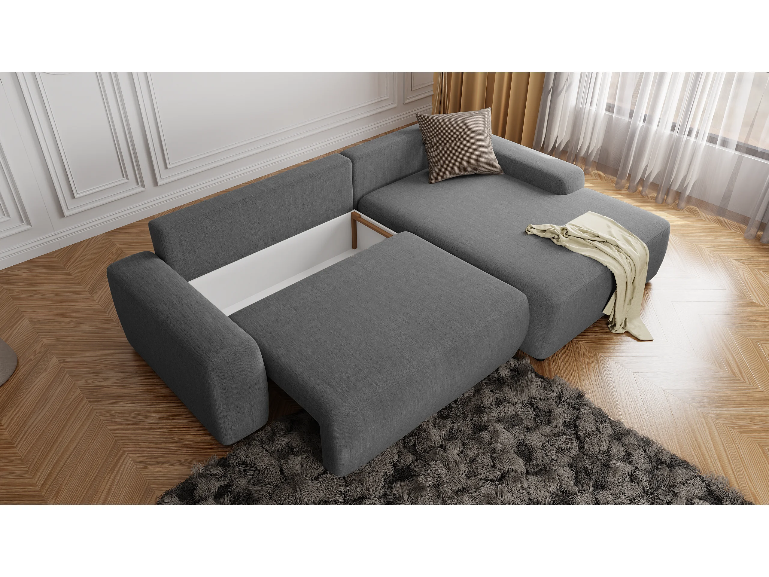 Canapé d’angle avec fonction lit et coffre de rangement en tissu velours gris, agréable confort d’assise ALWIN