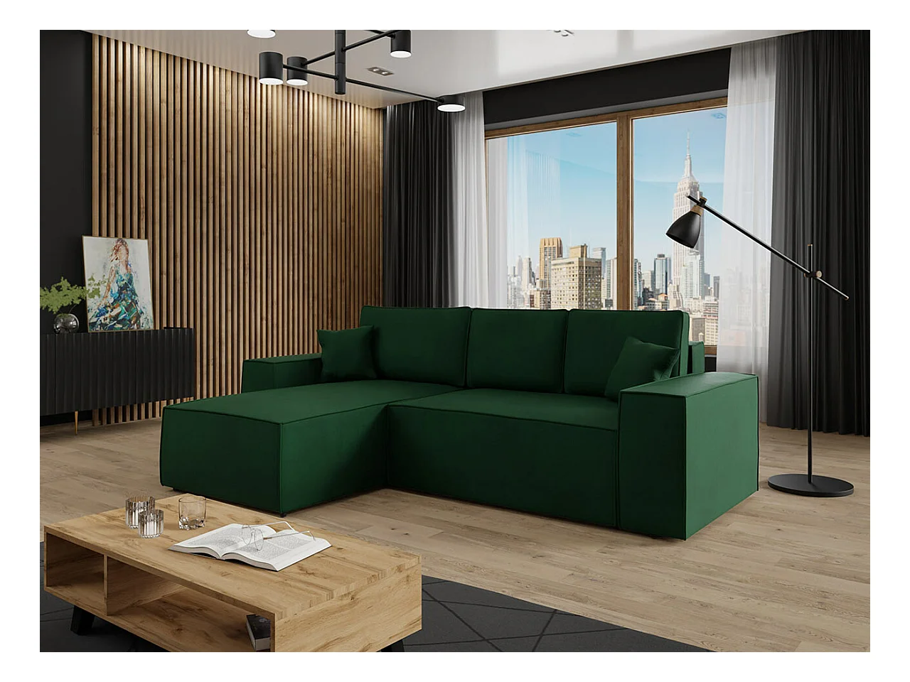 Canapé d'angle Clovis 108, Vert, Fonction de couchage, Boîte de literie, 279x174x94cm