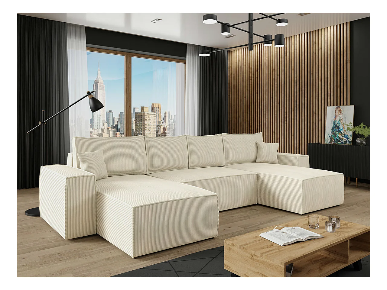 Canapé d'angle Clovis 109, Brun clair, Fonction de couchage, Boîte de literie, 370x174cm