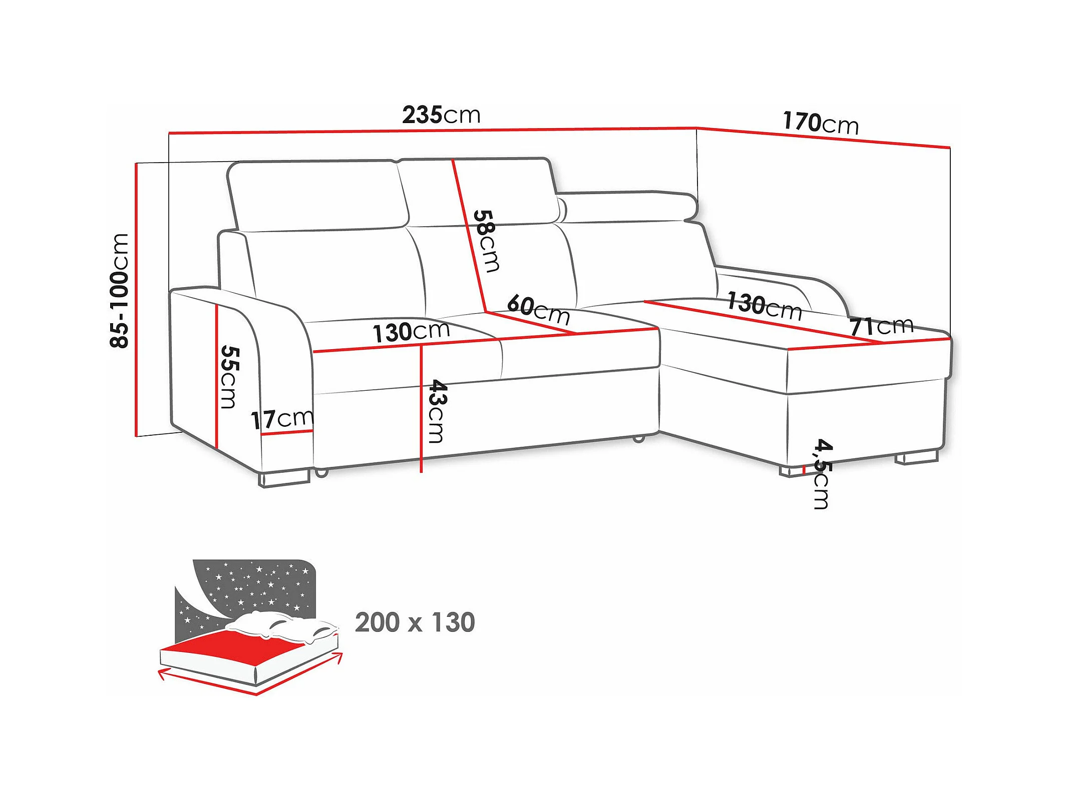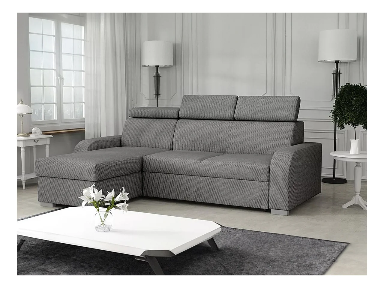 Canapé d'angle Etrcala 100, Gris, Fonction de couchage, Boîte de literie, 235x170x85cm