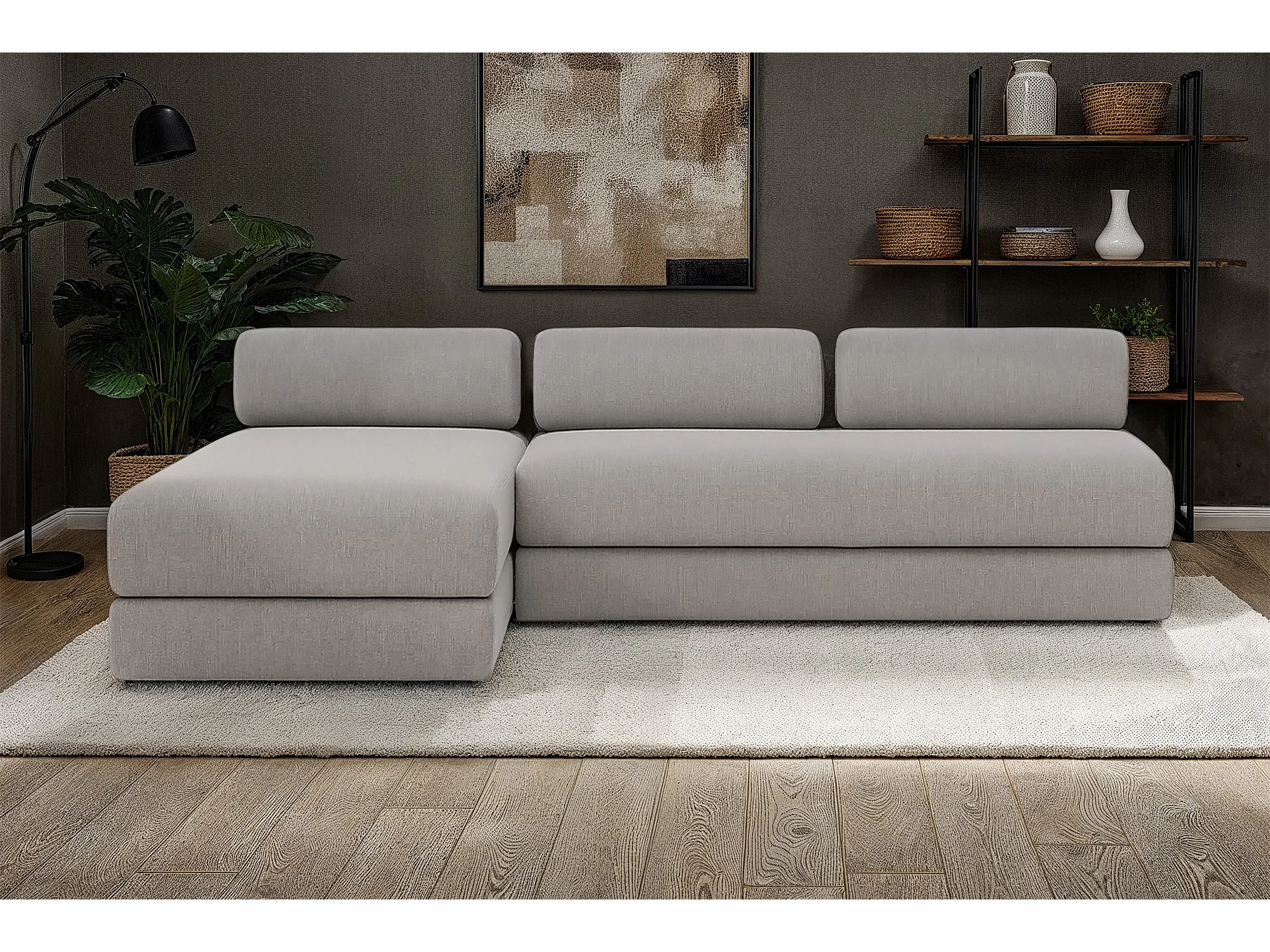 Canapé d'angle modulable et convertible 6 places - Tissu lisse - Gris clair