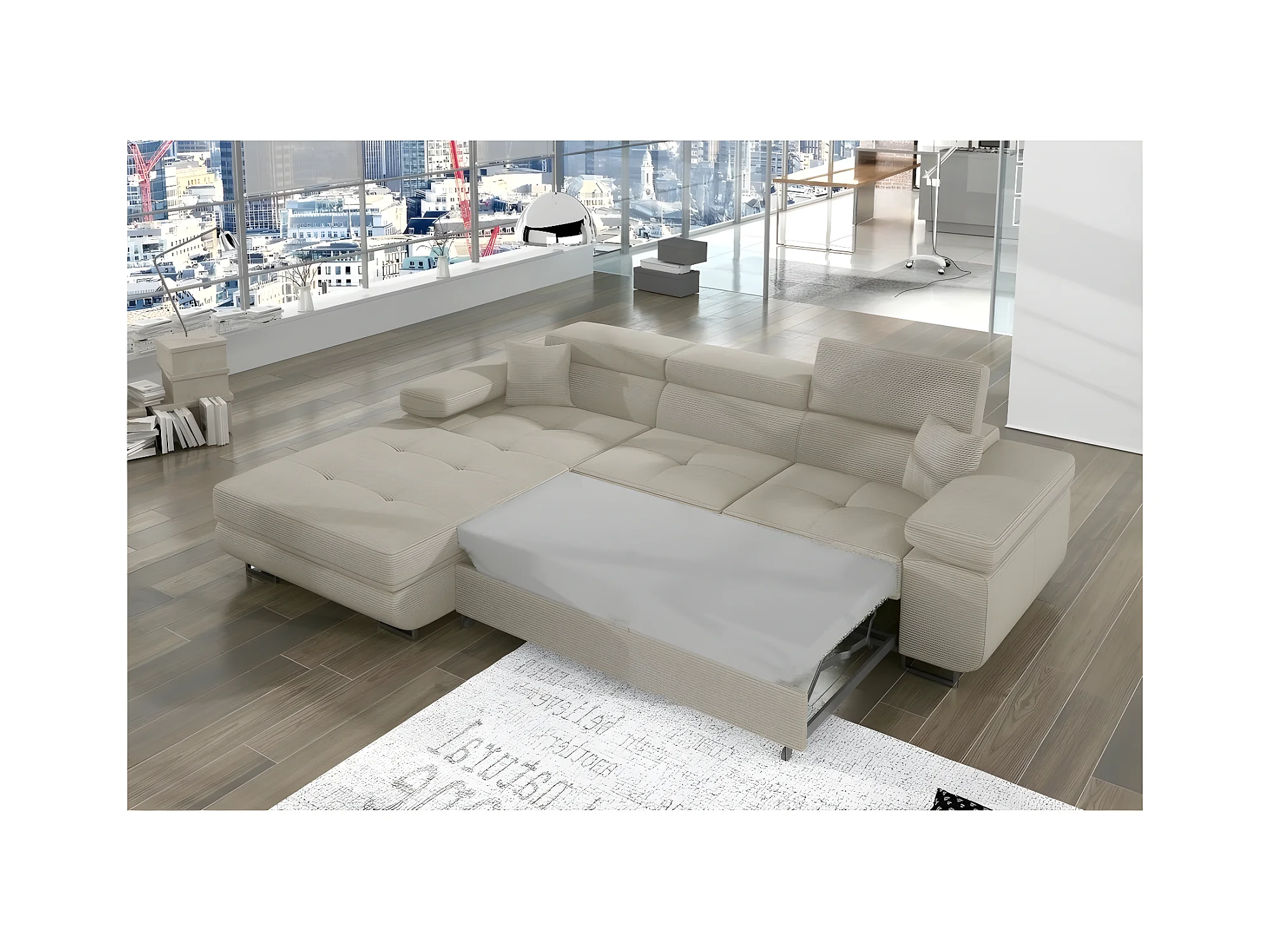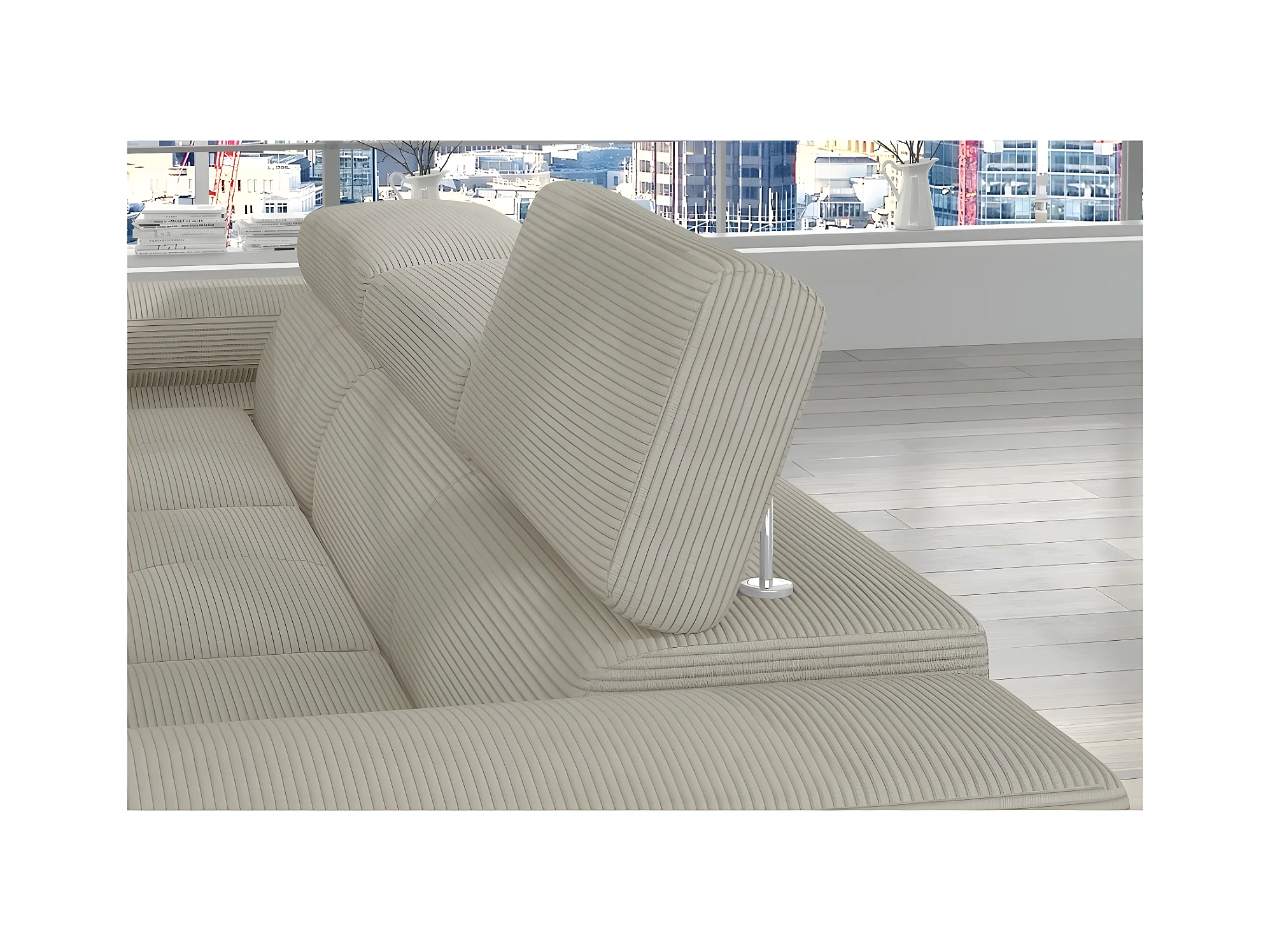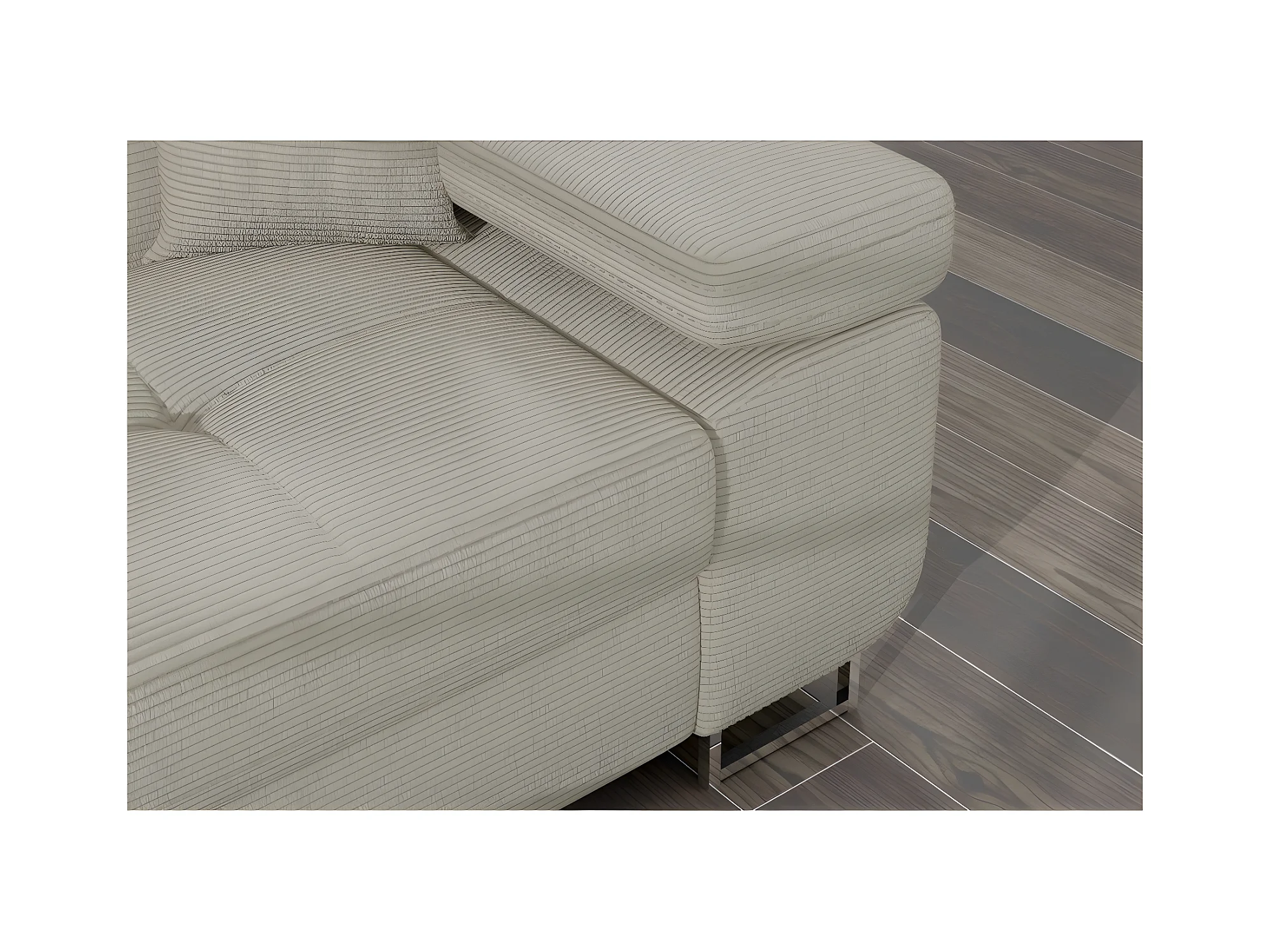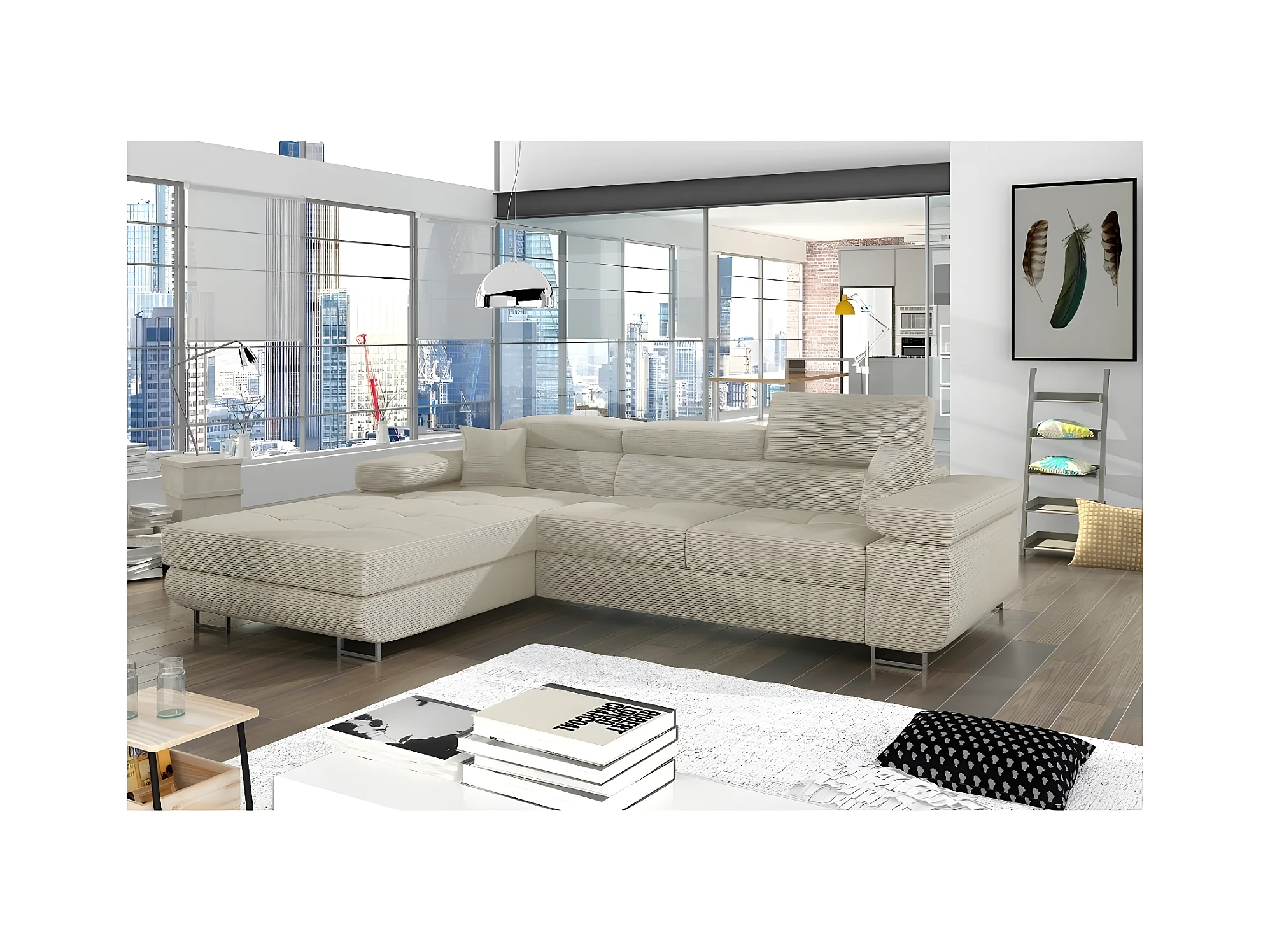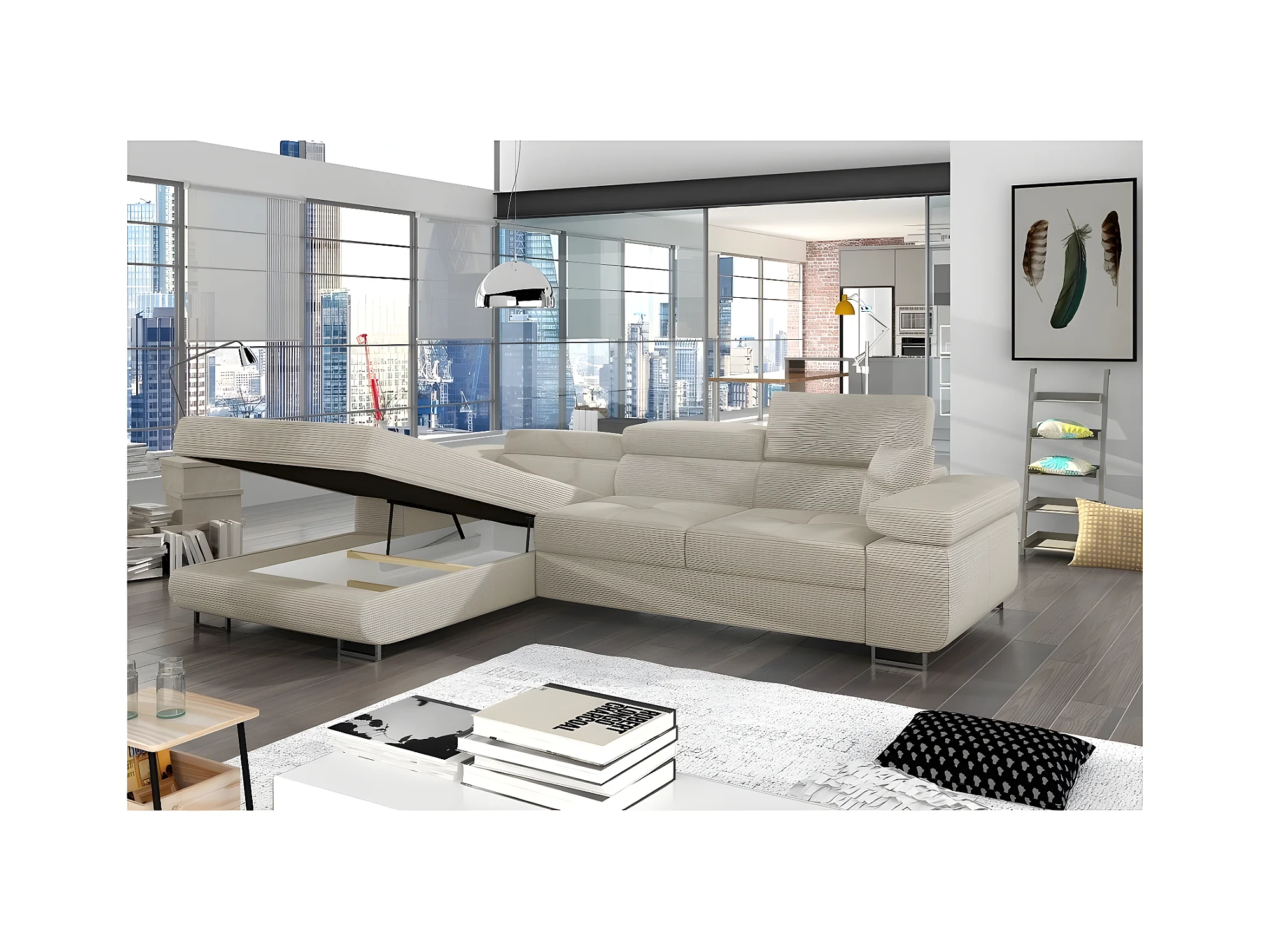 Canapé d'angle convertible - ARMEL en velours cottelé luxe 5 places, couleur beige, coffre, angle gauche (vu de face)