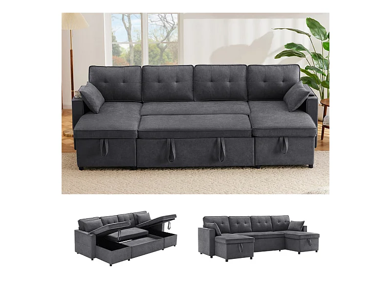 Canapé d'angle convertible avec 2 Coffres, Oreiller, Porte-gobelets - en Coton et Lin - 270×130×86cm - Gris