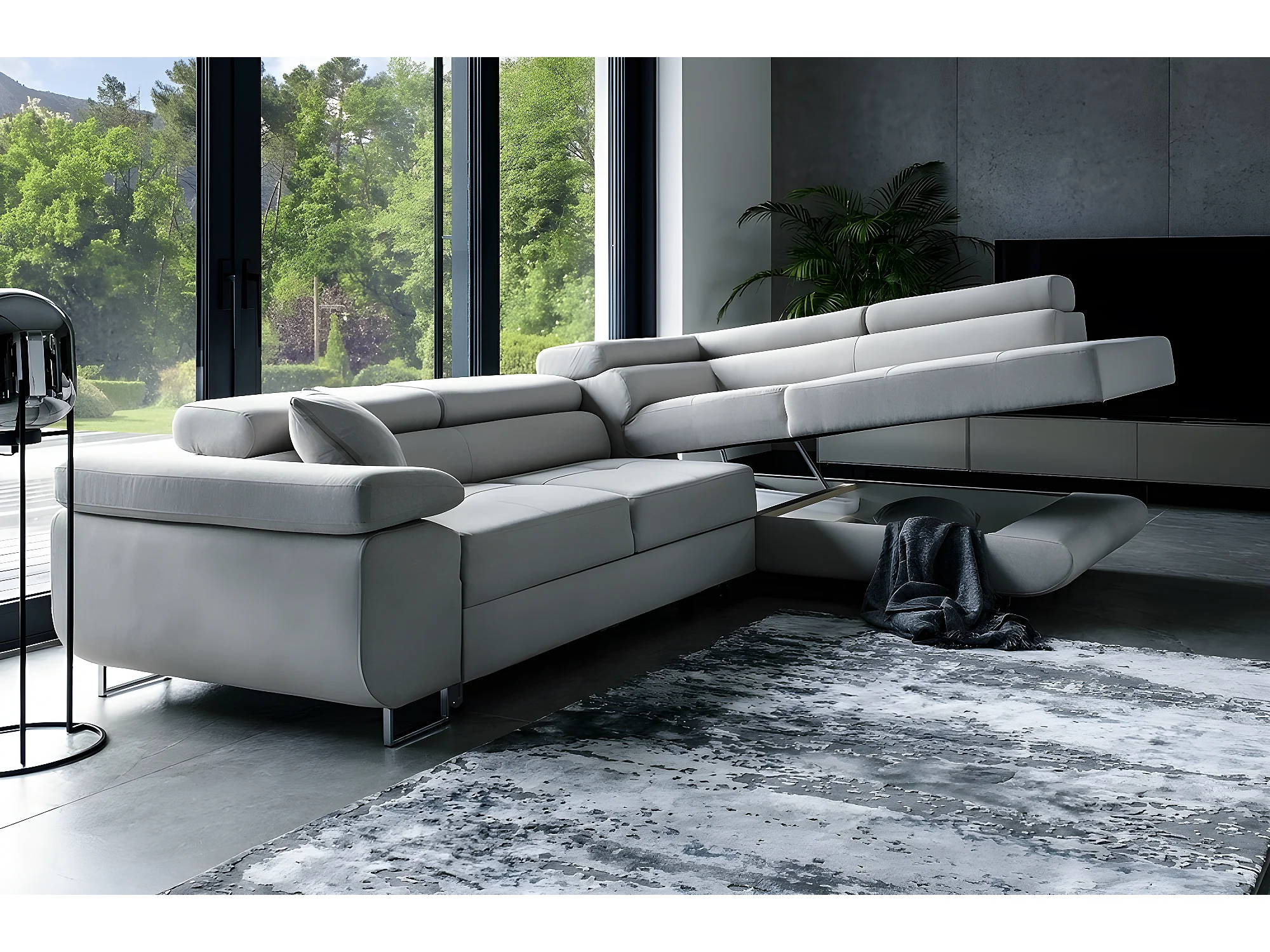 Canapé d'angle convertible en tissu luxe 5 places, ANNECY VELOURS, couleur gris clair, angle droit (vu de face)