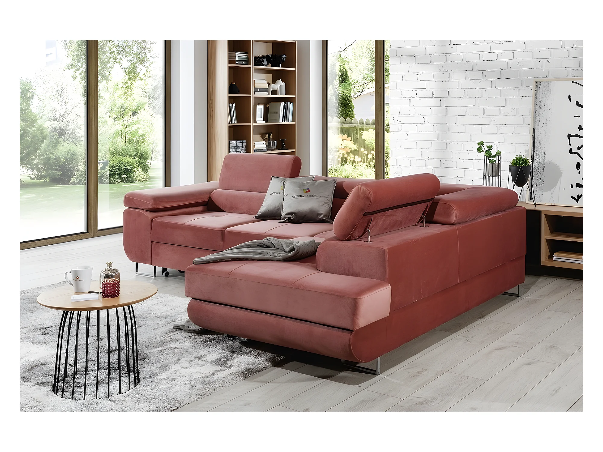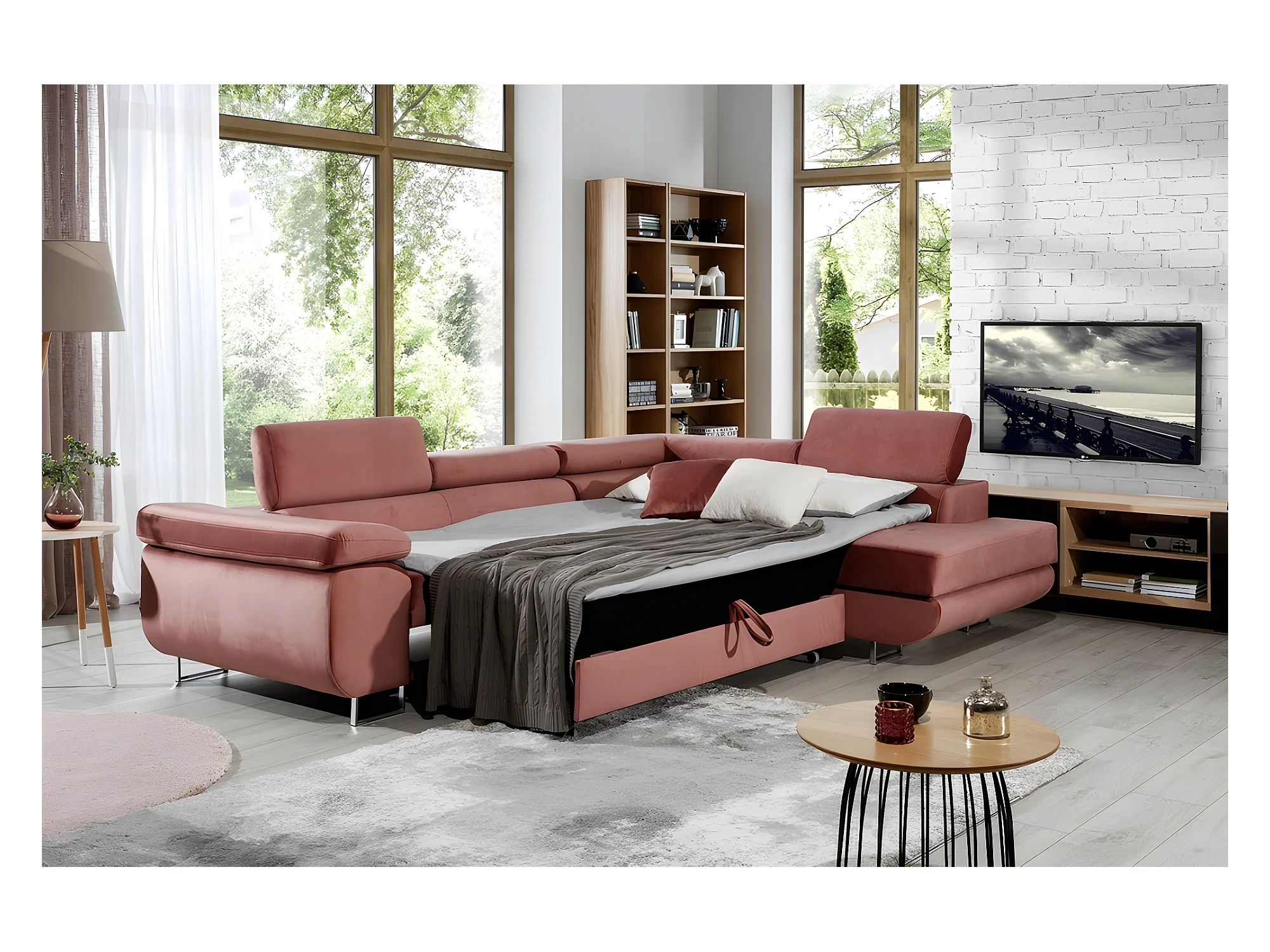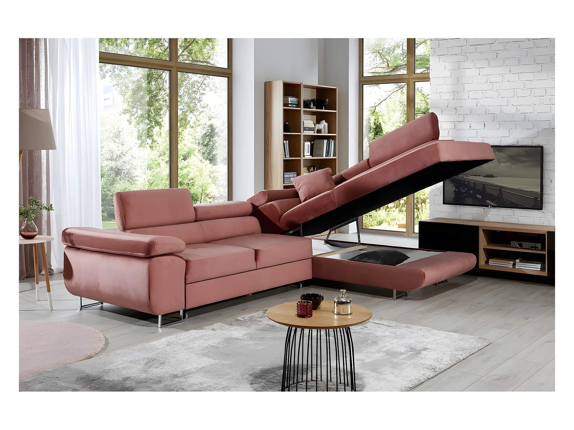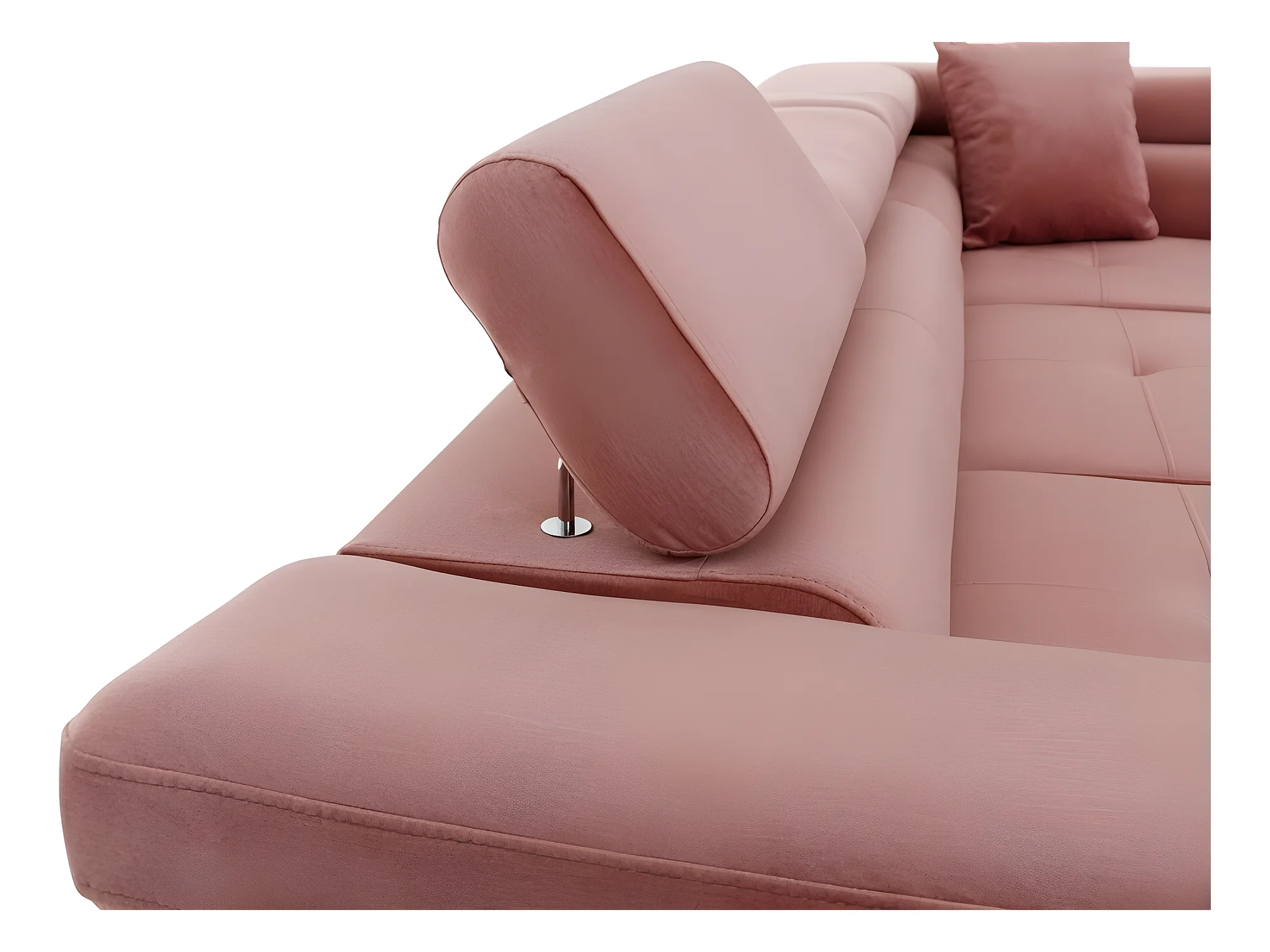 Canapé d'angle convertible en tissu luxe 5 places, ANNECY VELOURS, couleur rose pale, angle droit (vu de face)