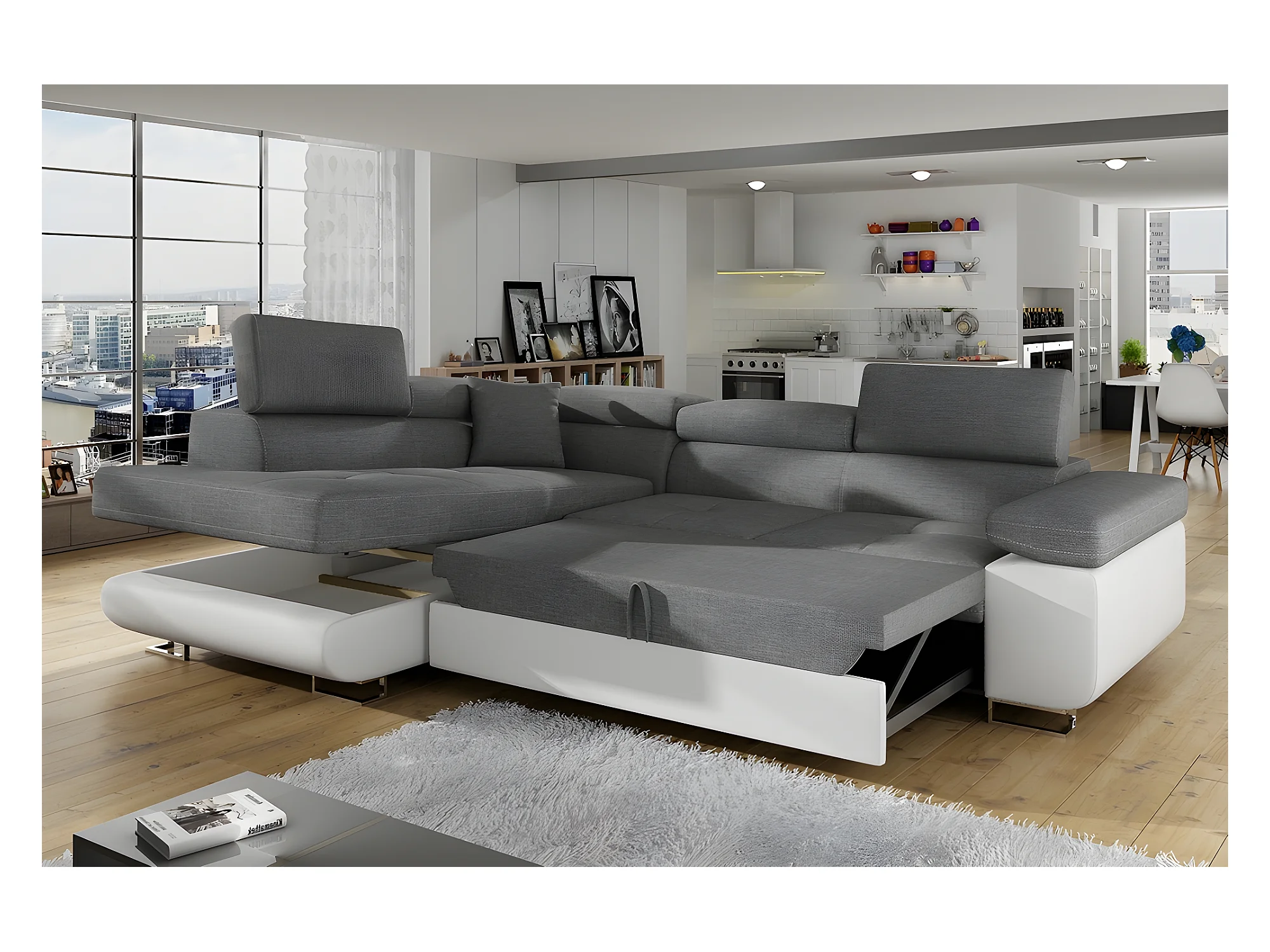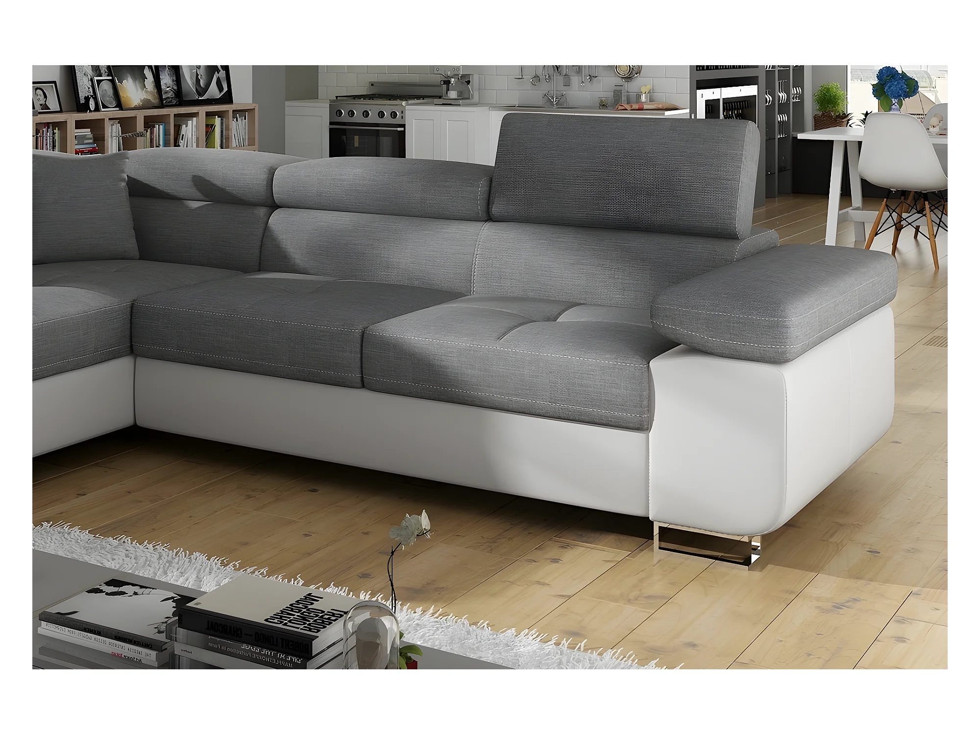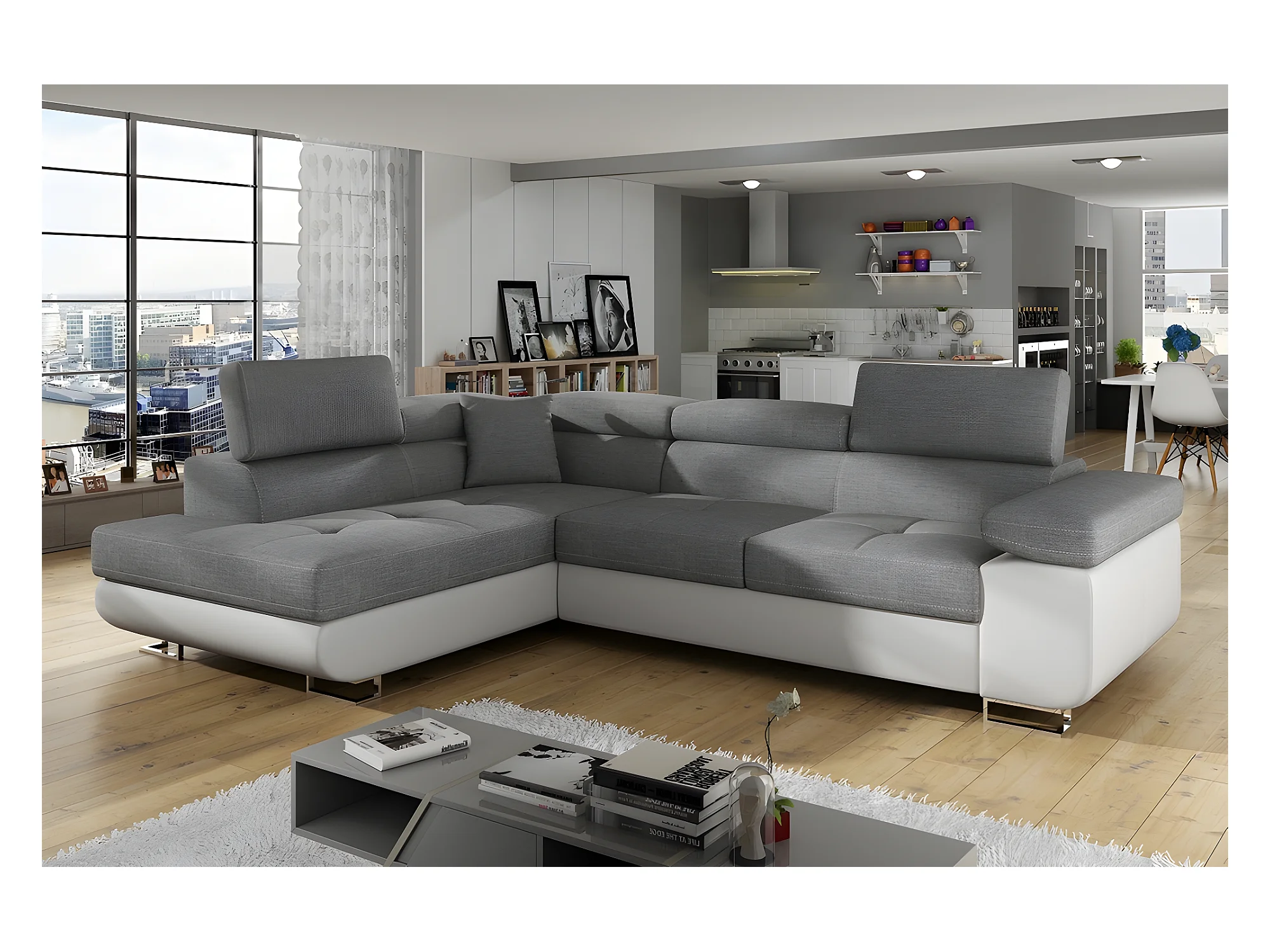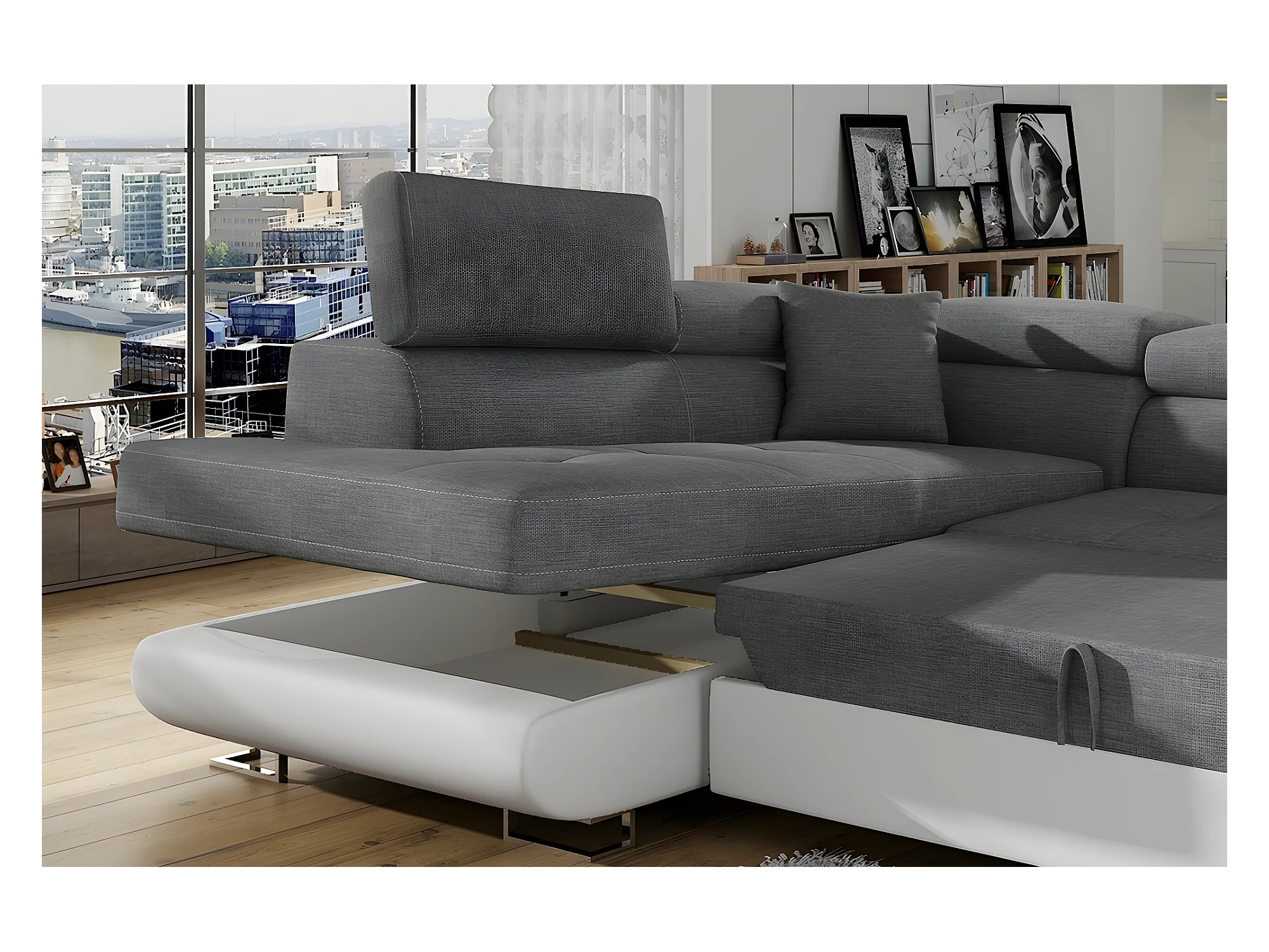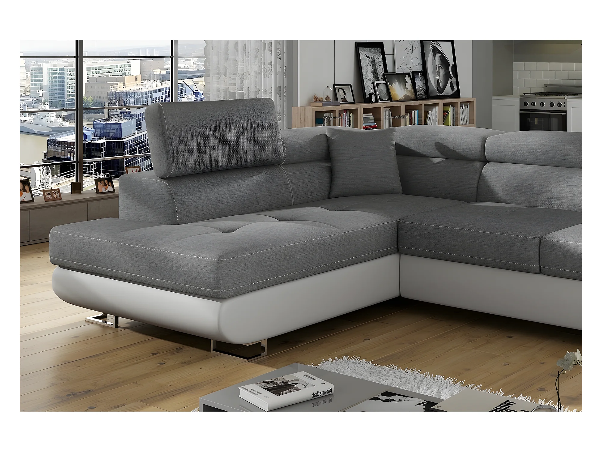 Canapé d'angle convertible en tissu luxe et simili cuir 5 places, coffre, gris / blanc cassé, angle gauche (vu de face), ANNECY MIX
