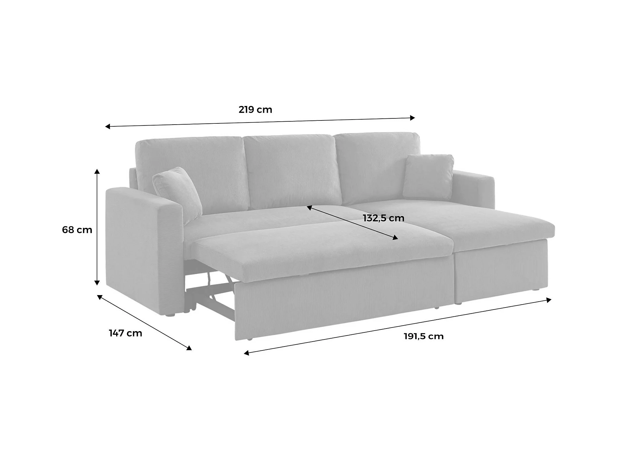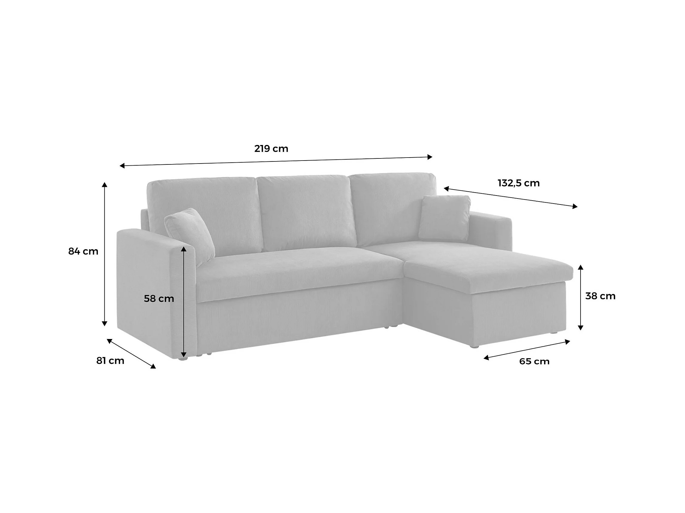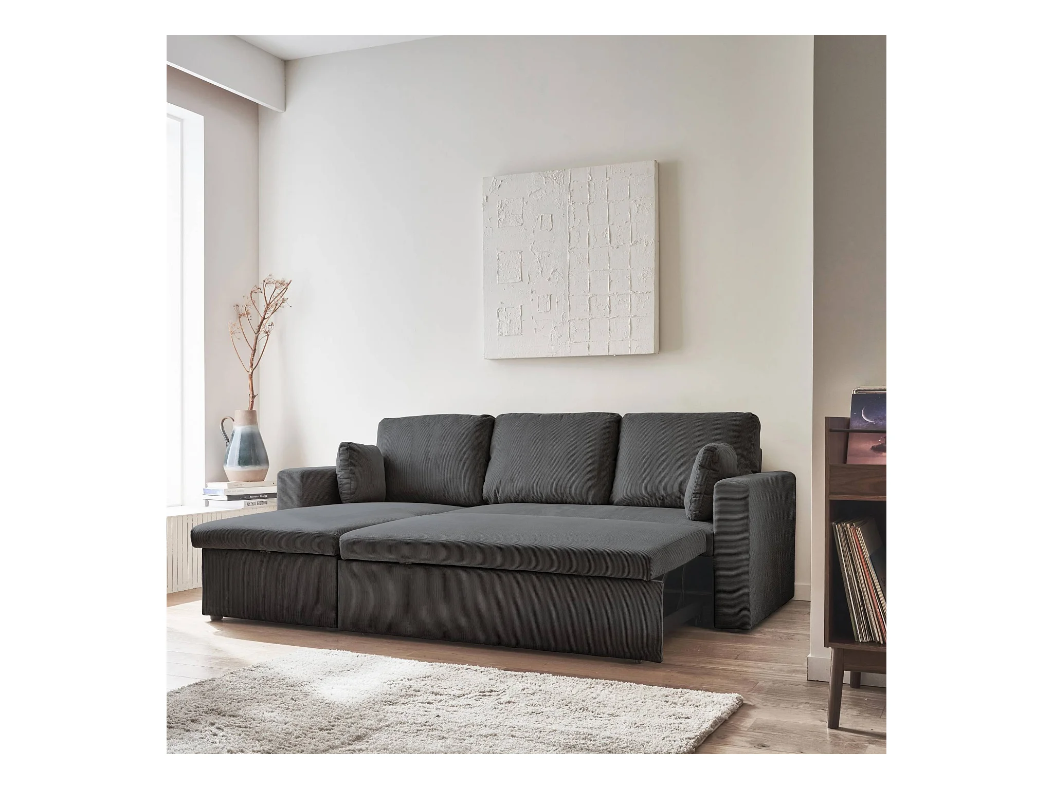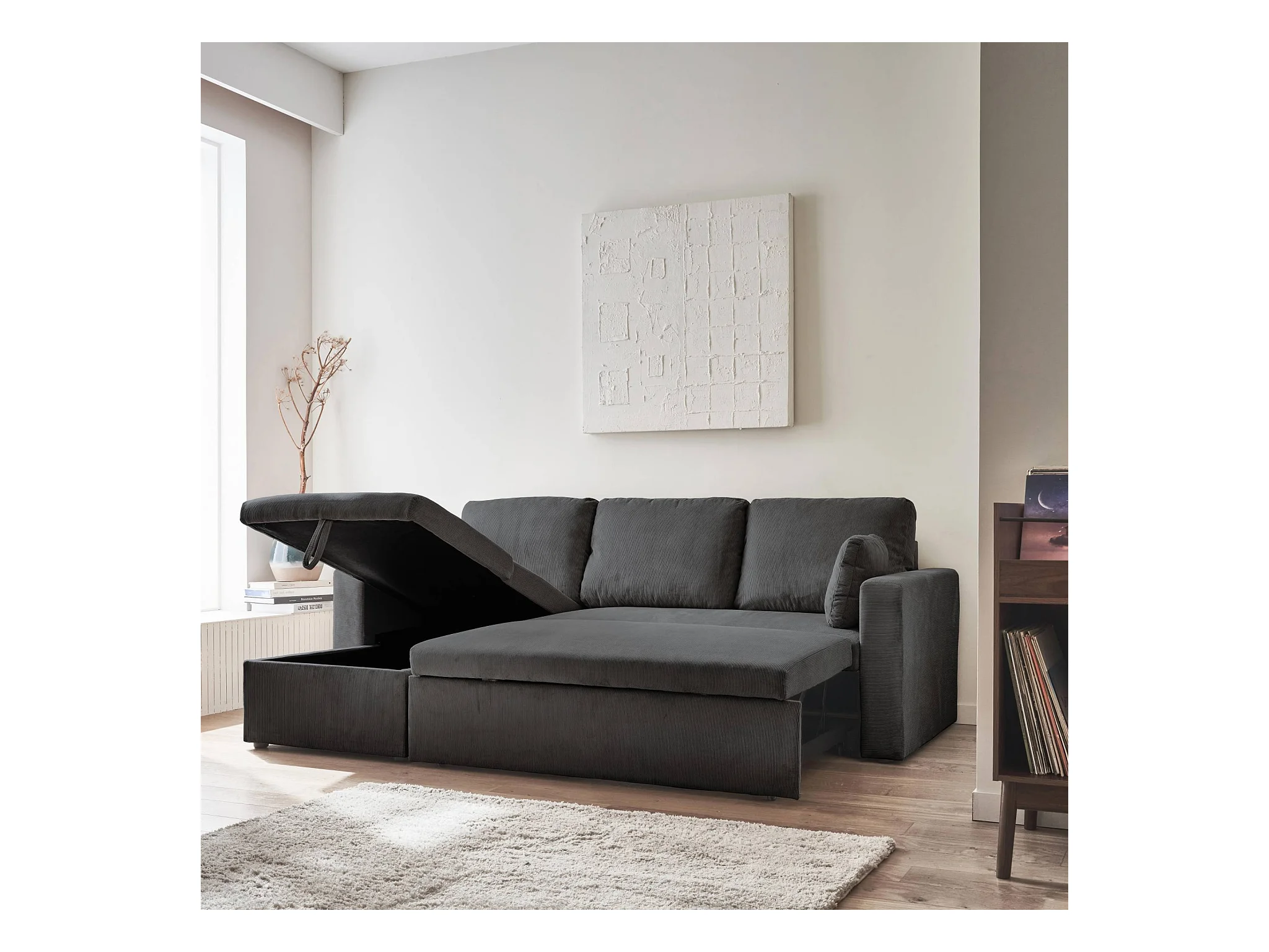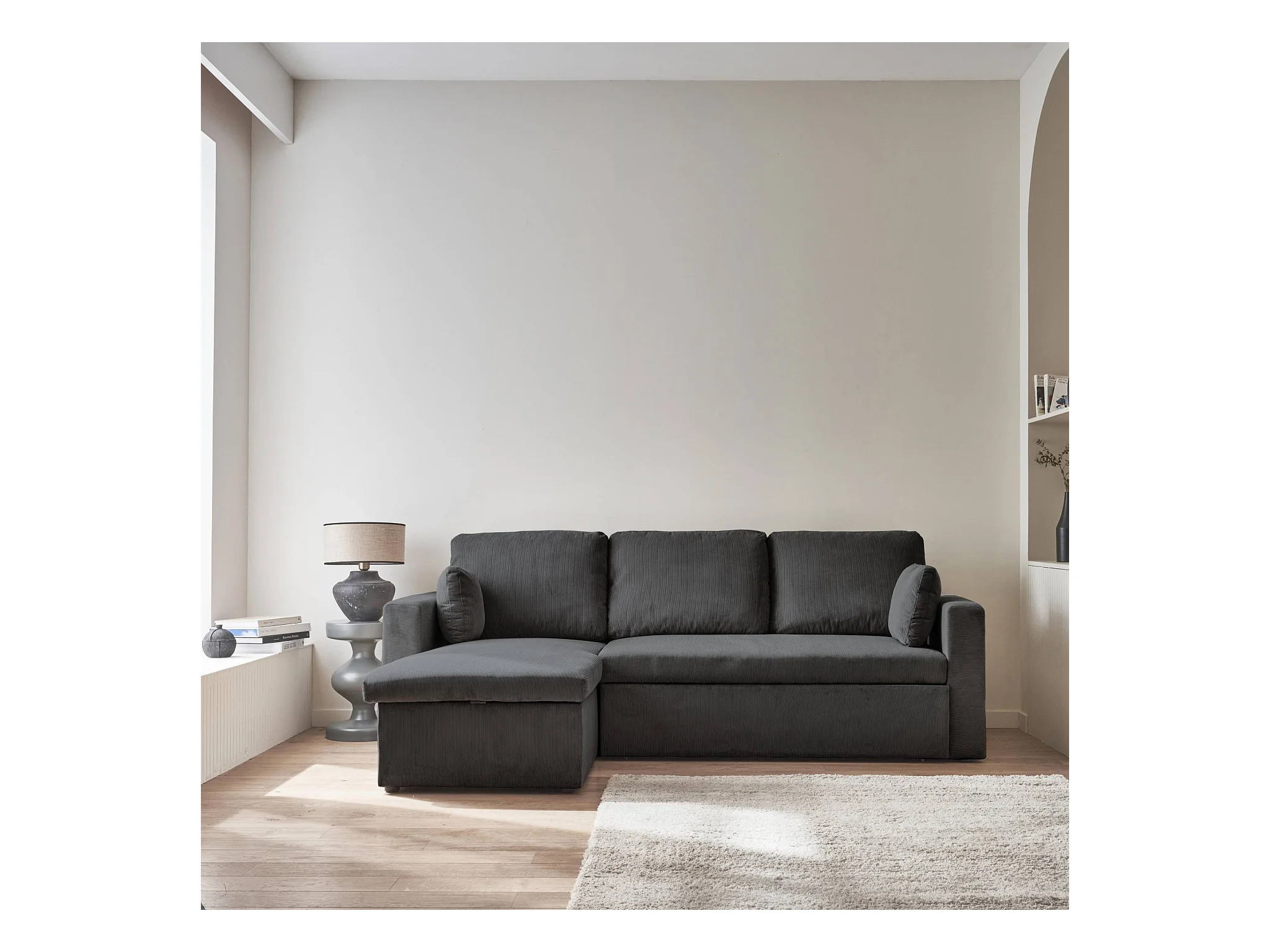 Canapé d'angle convertible en velours côtelé gris foncé - IDA - 3 places. fauteuil d'angle réversible coffre rangement lit modulable