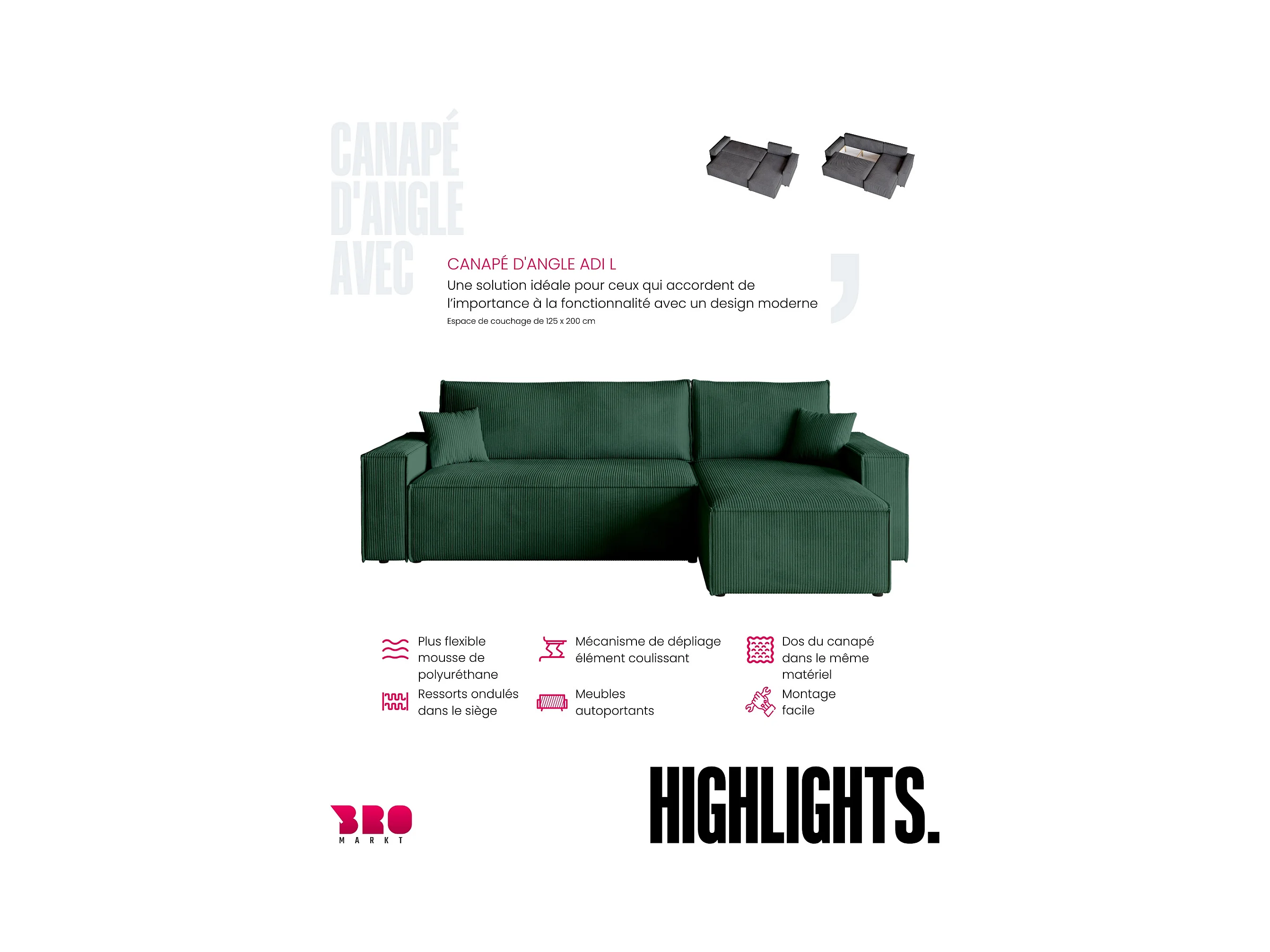 Canapé d'angle convertible en velours côtelé vert bouteille ADI L