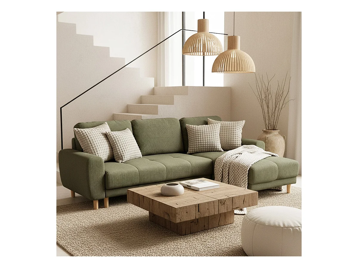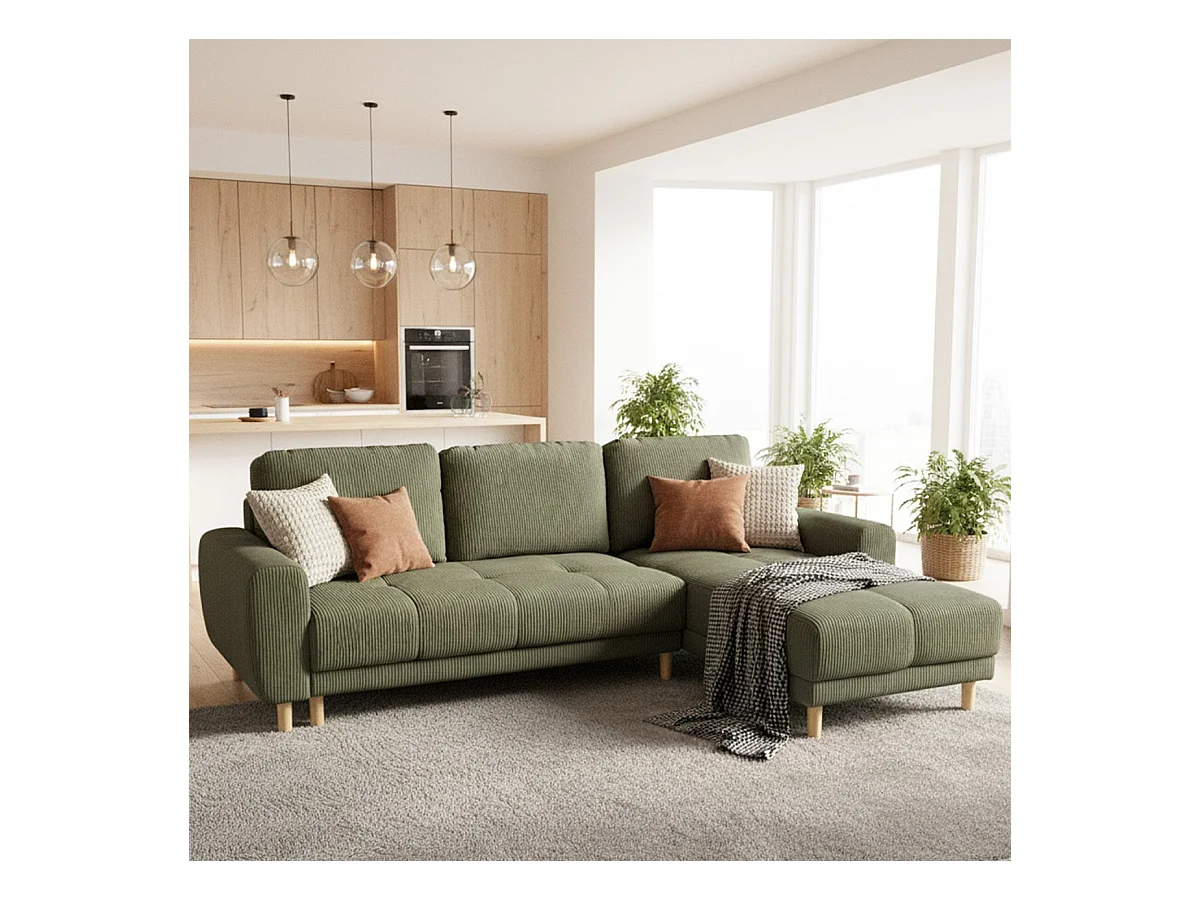 Canapé d'angle convertible réversible 3/4 places en velours côtelé vert kaki - Alva