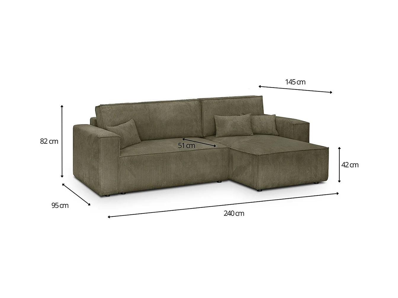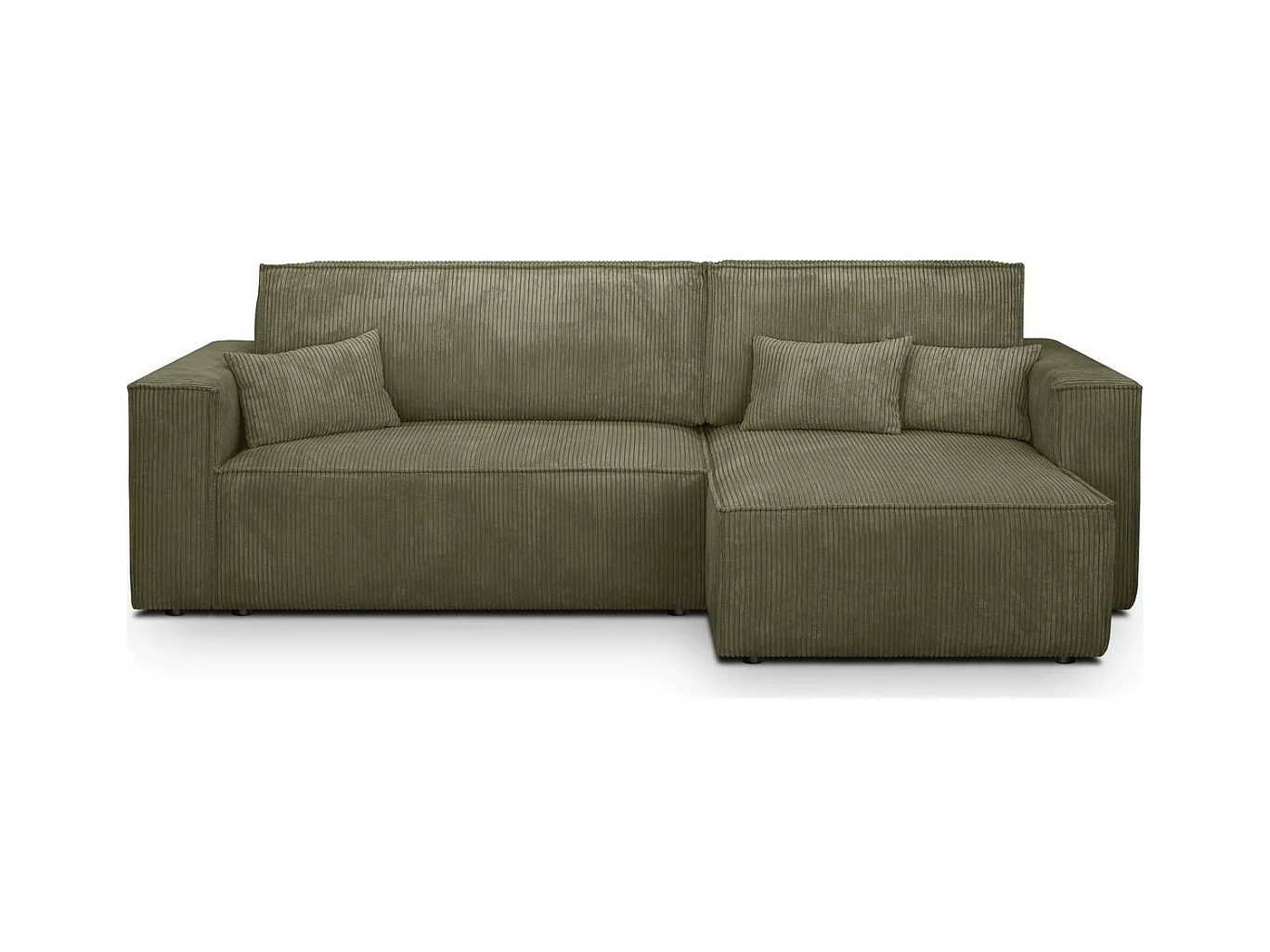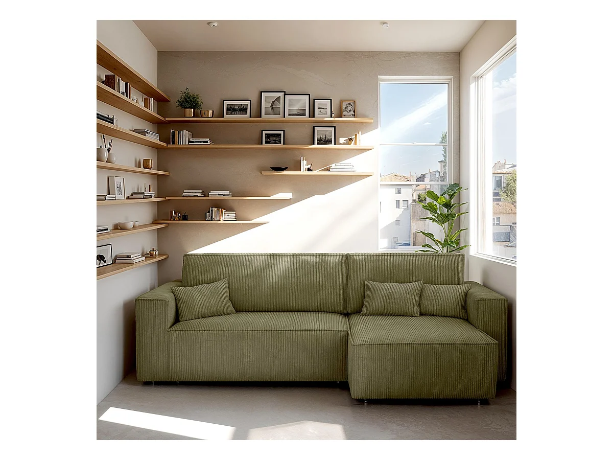 Canapé d'angle convertible réversible 4 places avec coffre de rangement en velours côtelé vert kaki - Livia
