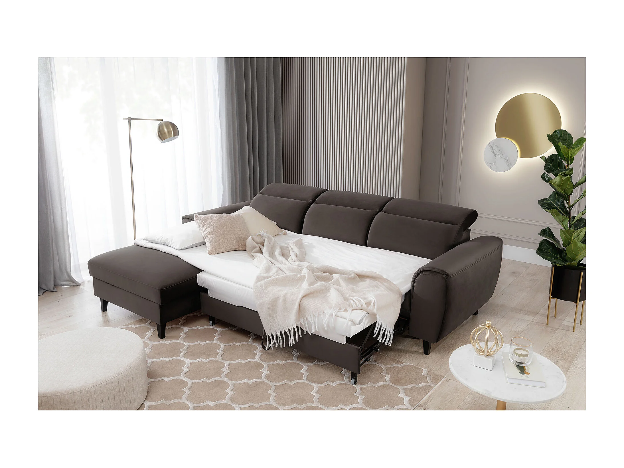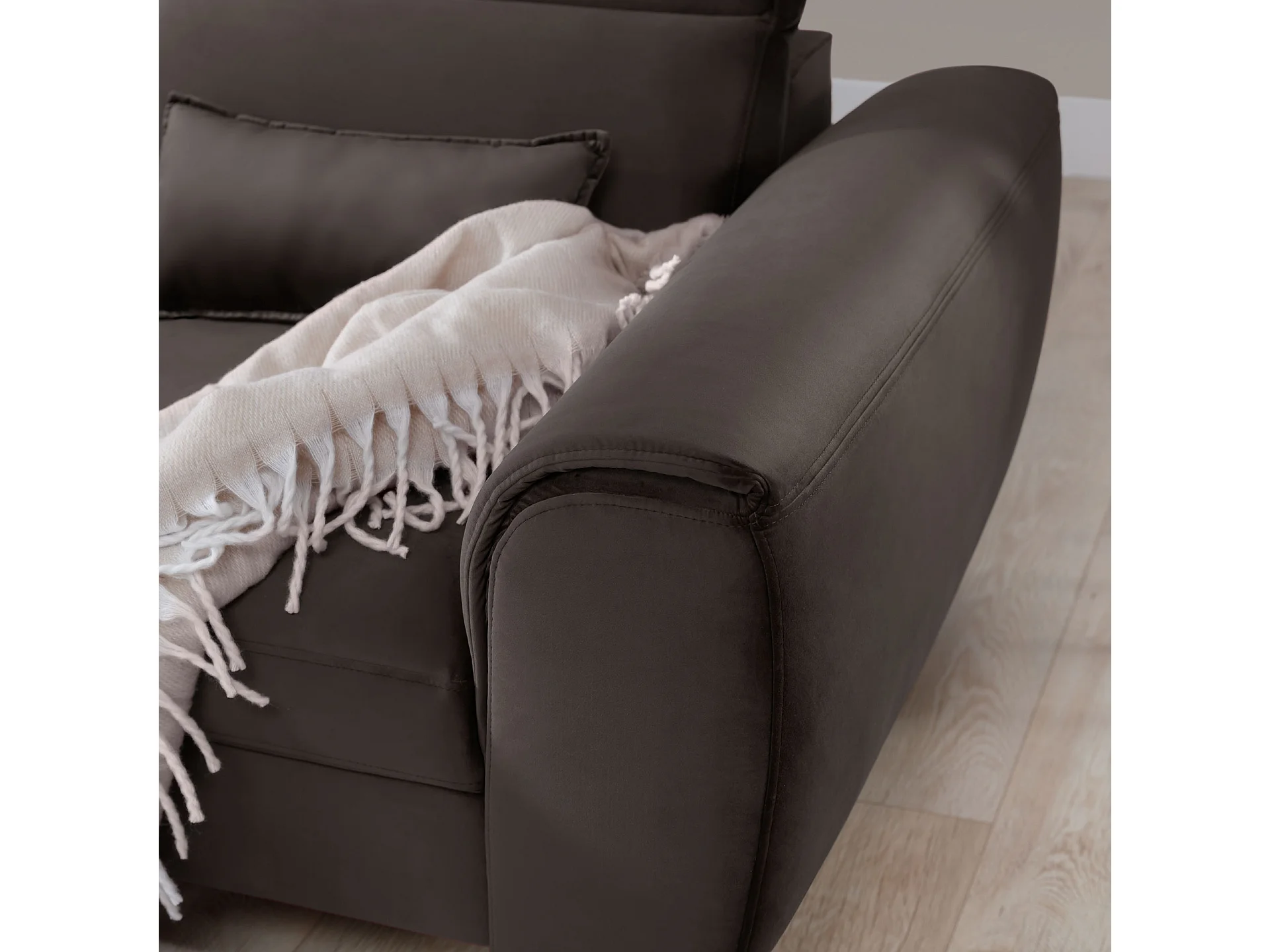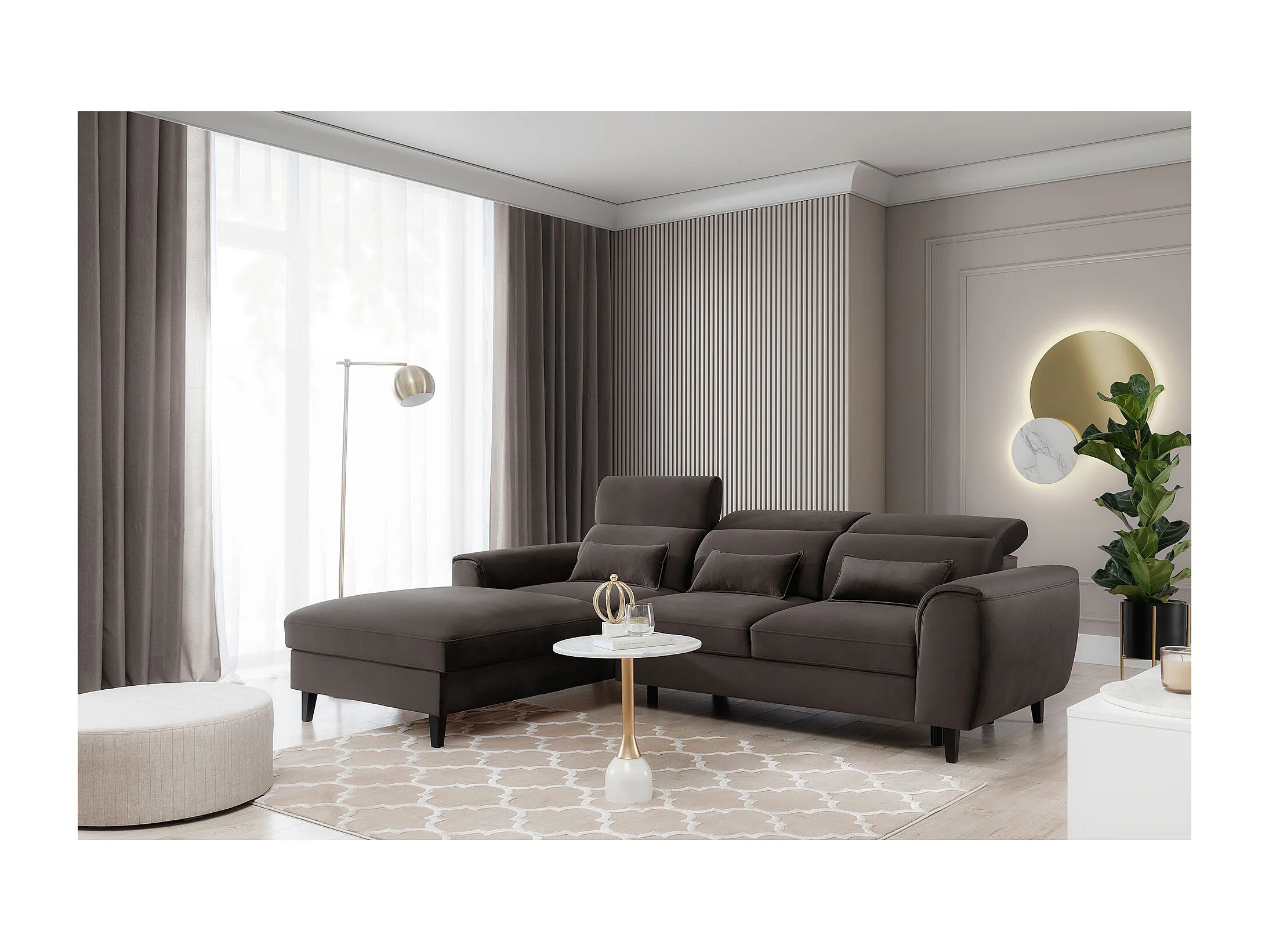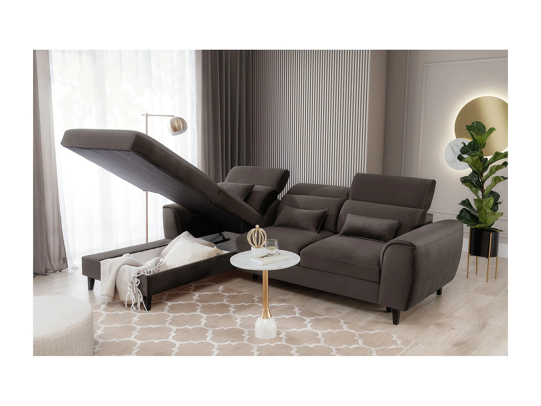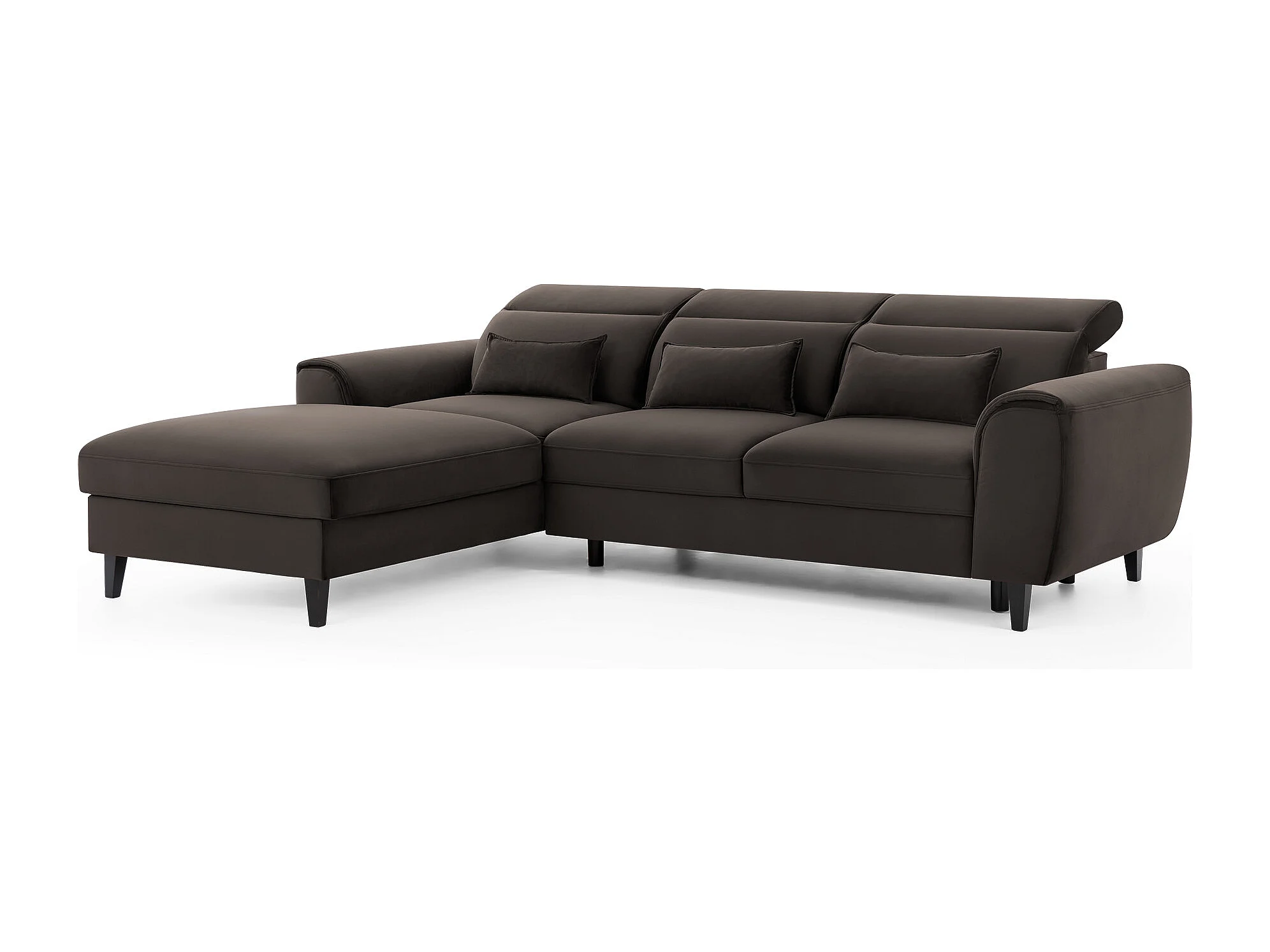 Canapé d'angle convertible velours appuis-tête réglables ASTORIA - Coffre et pieds bois noir-Marron-angle gauche