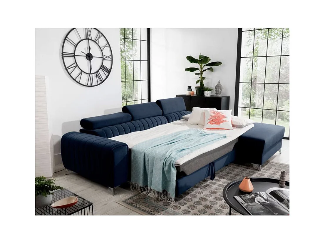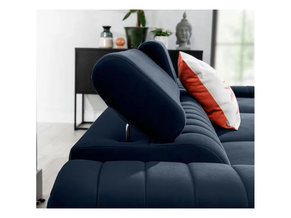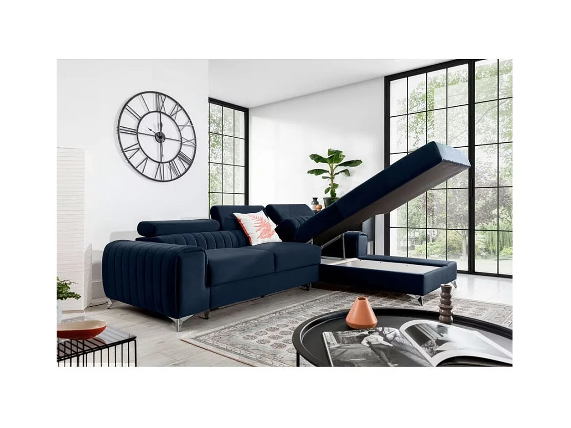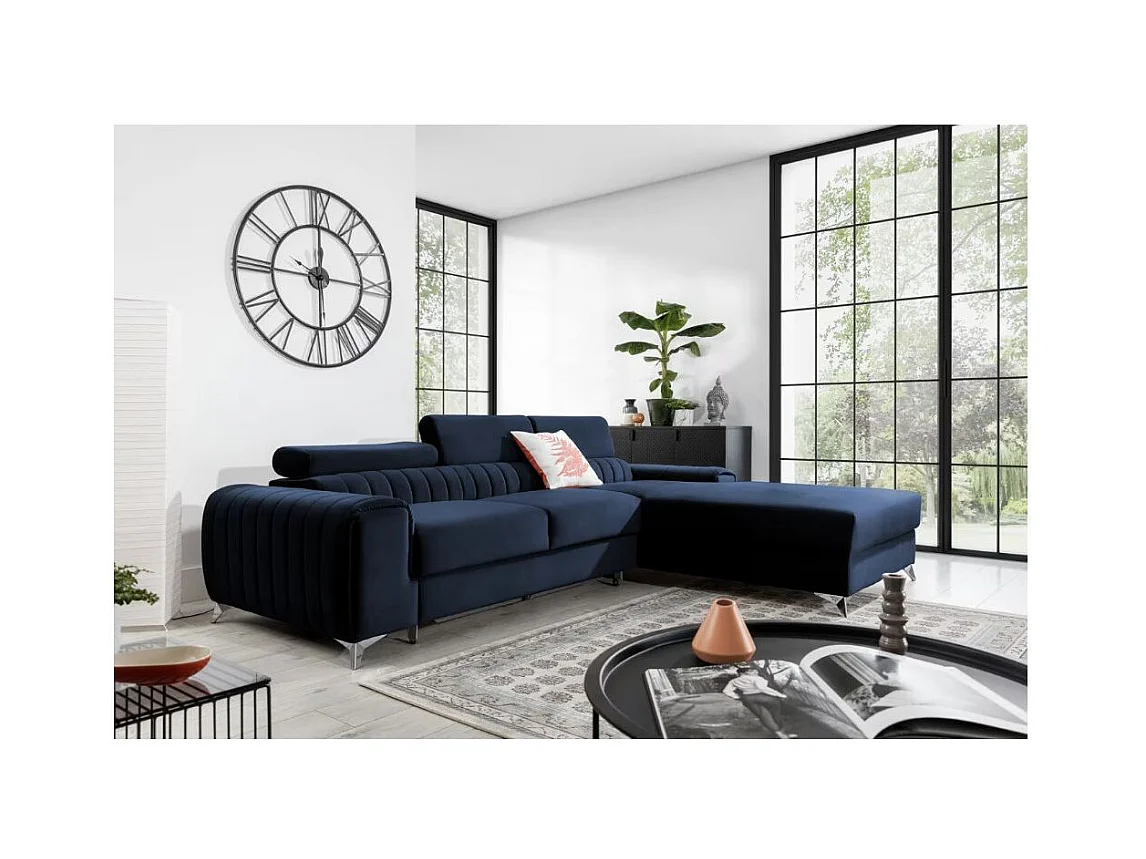 Canapé d'angle convertible velours têtière réglables GRENKY - Coffre, pieds acier chromé-Bleu marine-angle droit