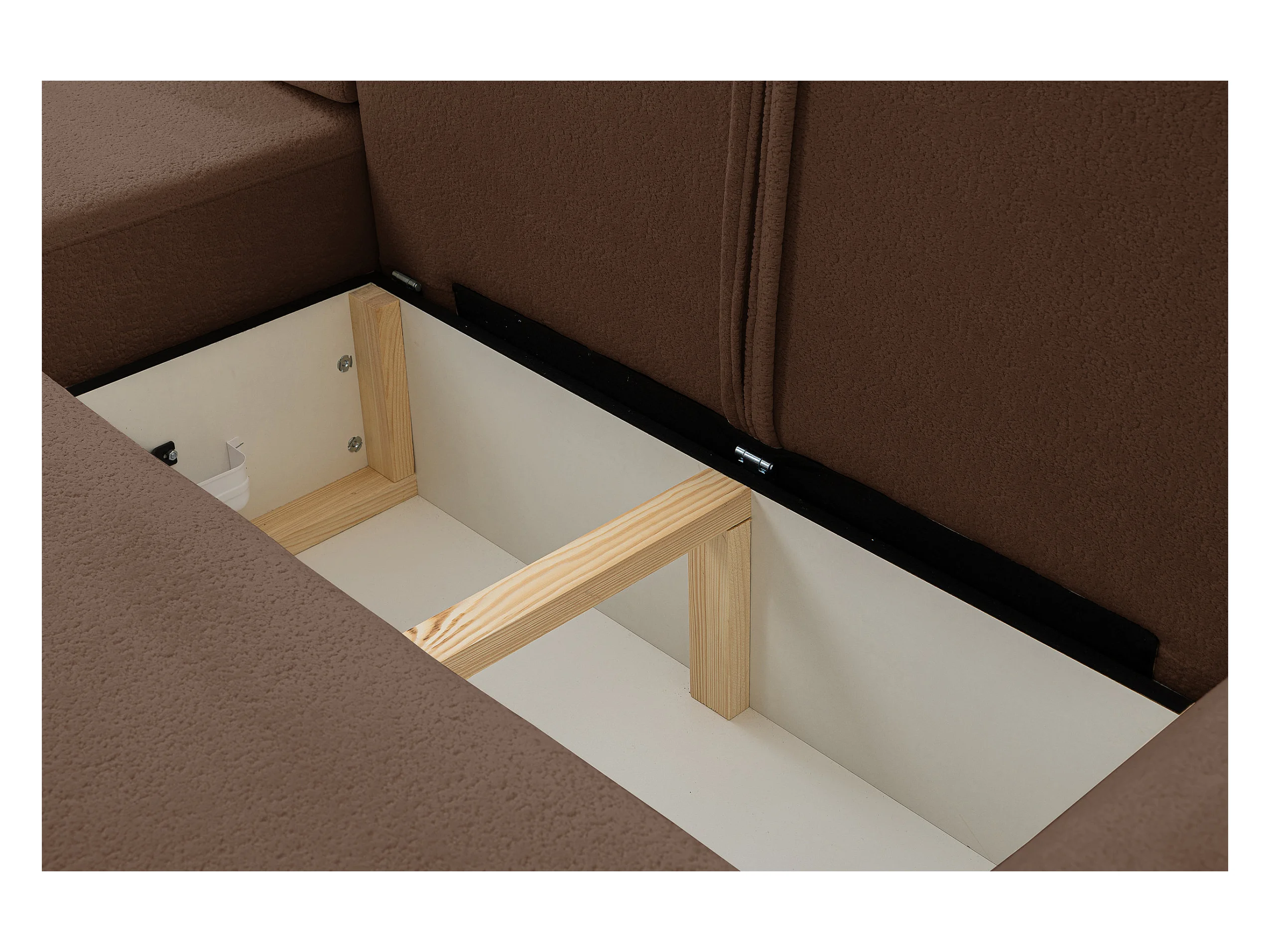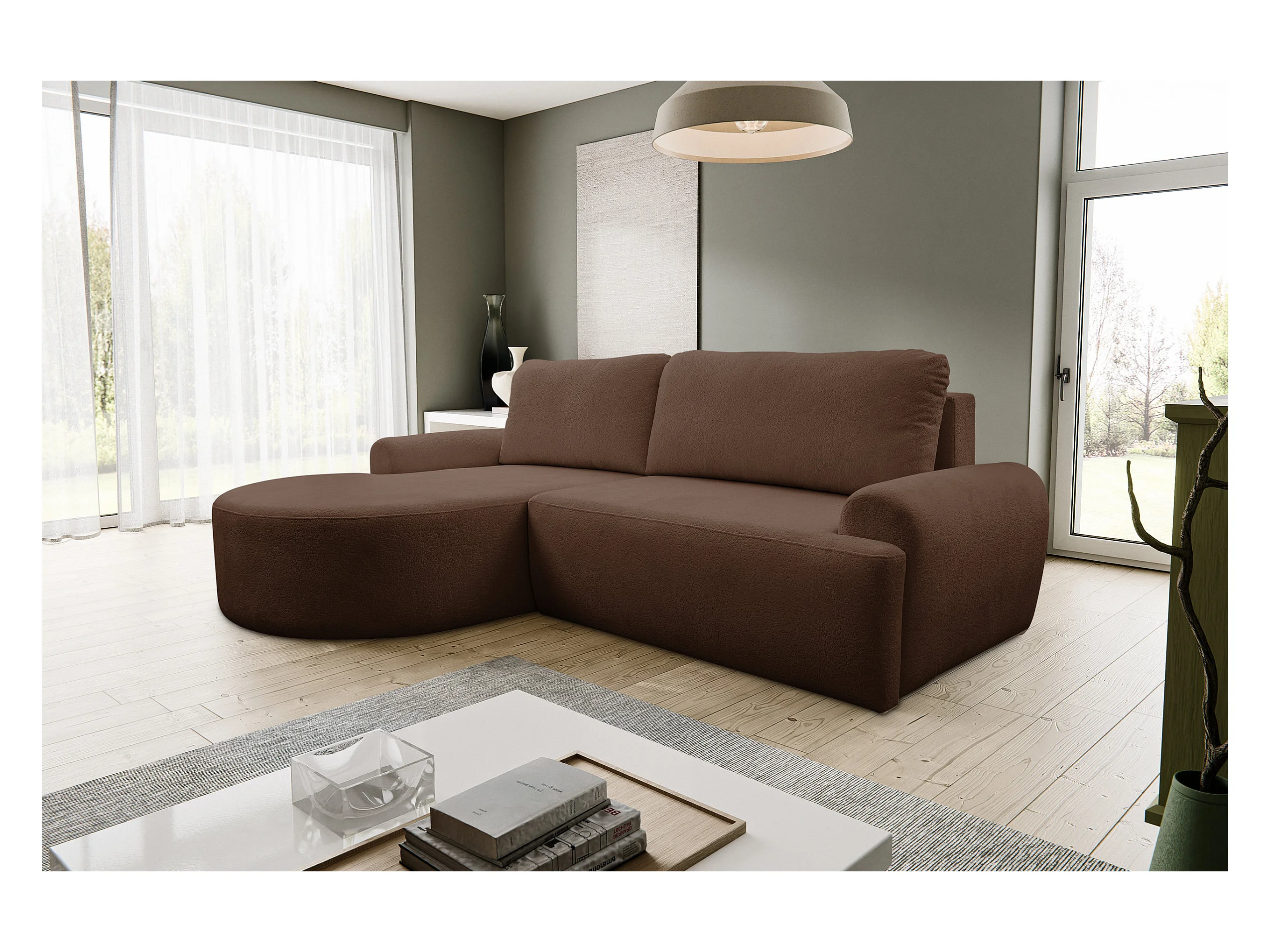 Canapé d'angle Dream avec fonction couchage et coffre de rangement, couleur : brun foncé, tissu bouclé, pouf à gauche