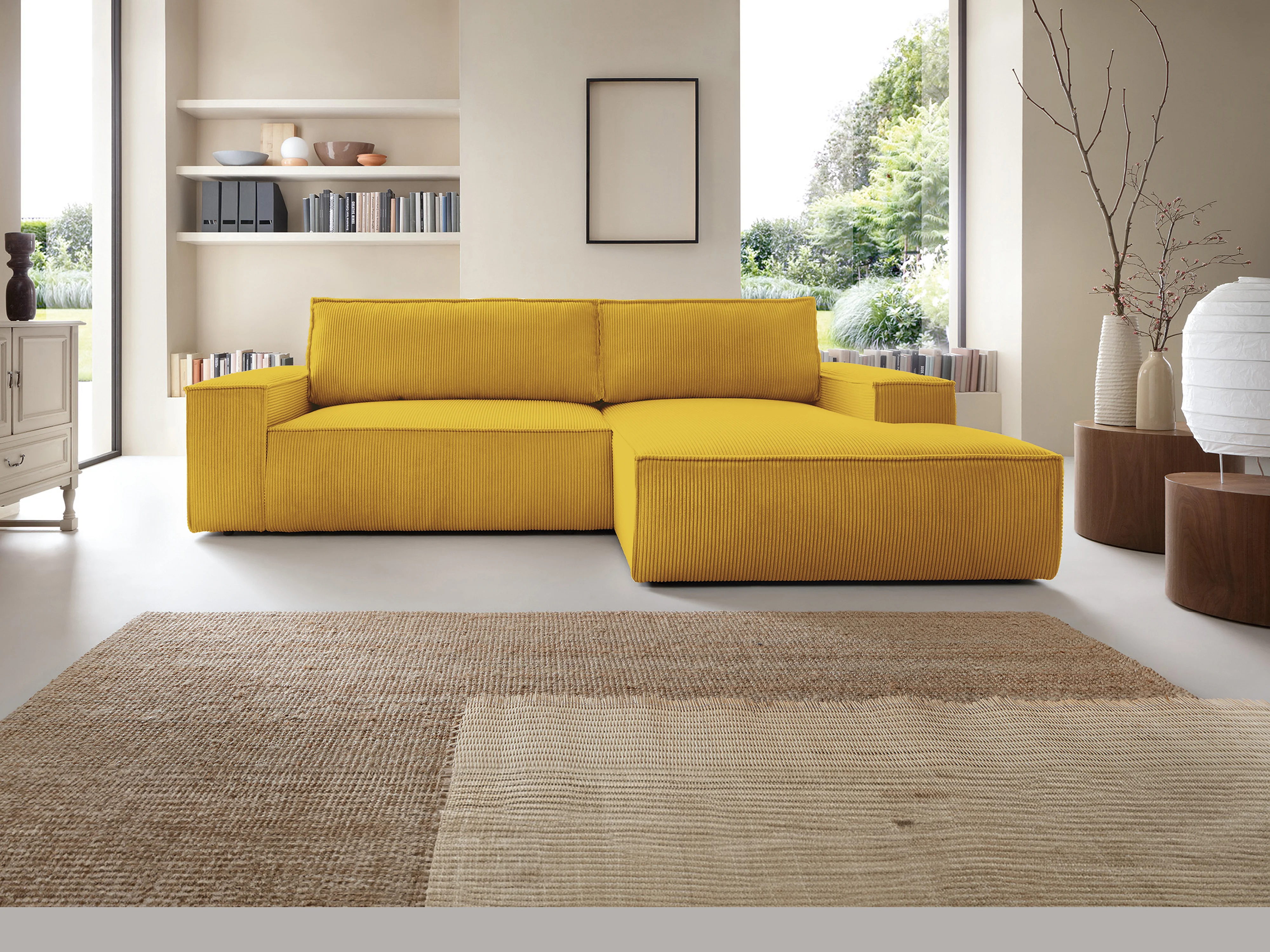 Canapé d'angle droit convertible en velours côtelé jaune AMELIA