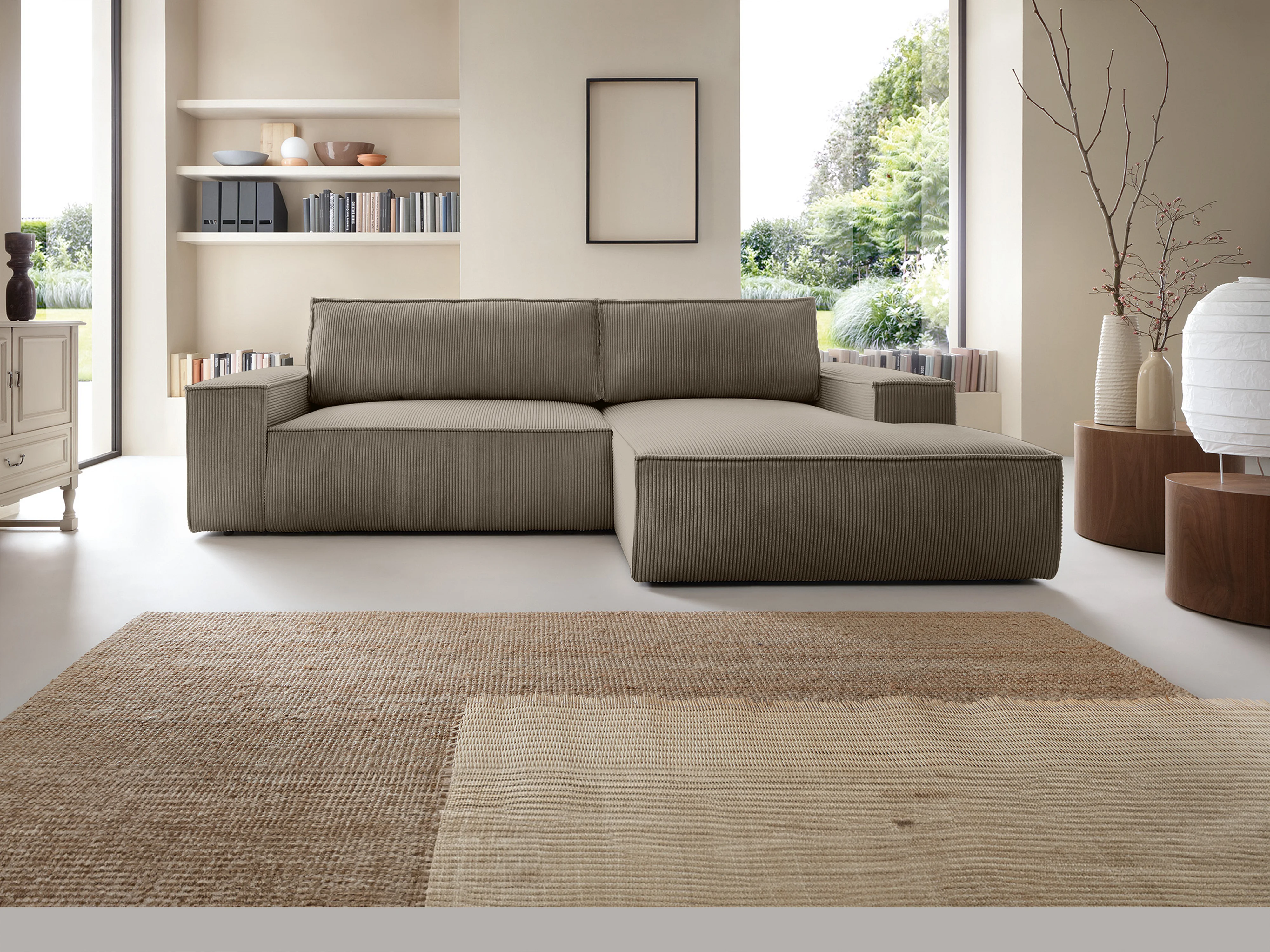 Canapé d'angle droit convertible en velours côtelé taupe AMELIA