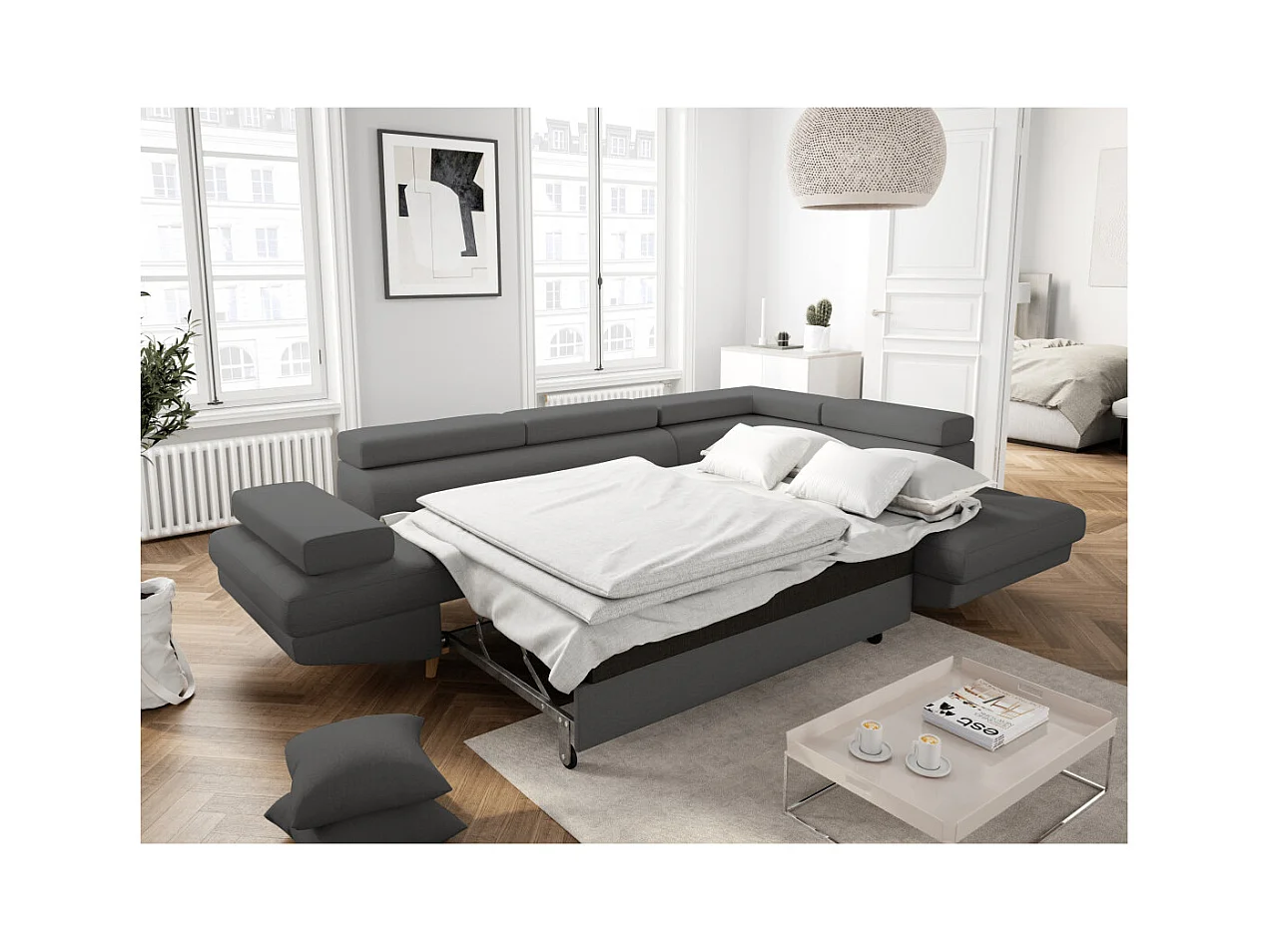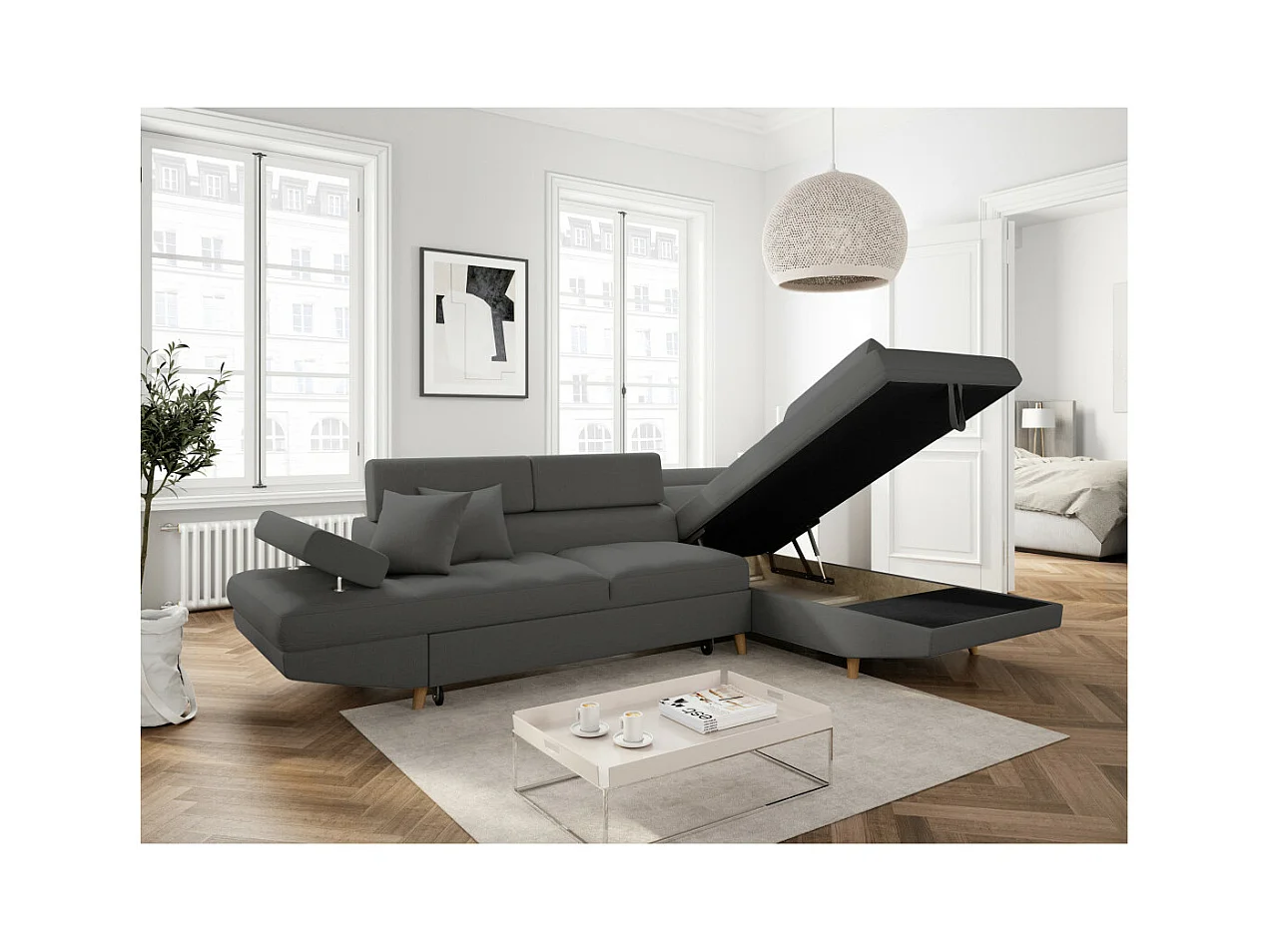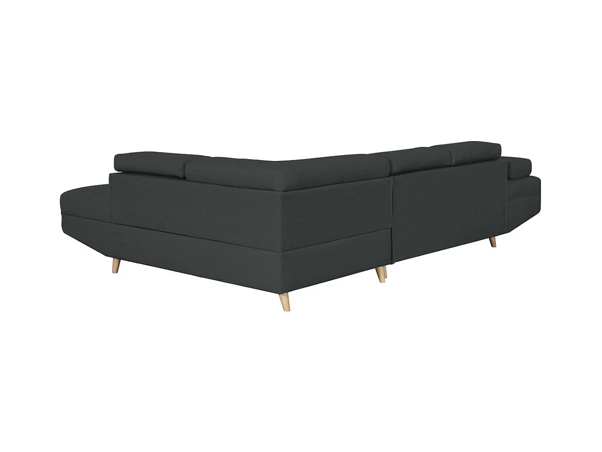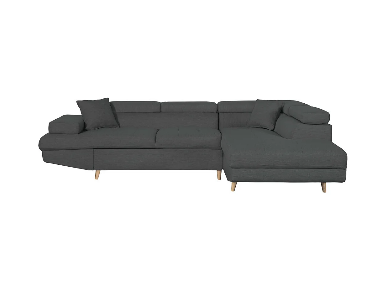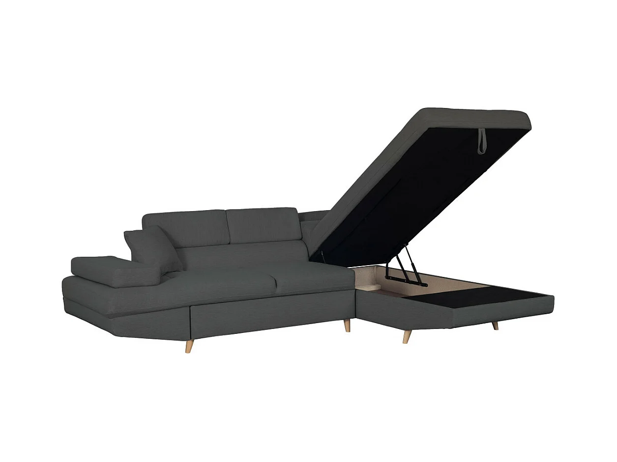 Canapé d'angle droit convertible Rio Scandinave avec coffre en tissu - Gris anthracite, Pieds bois - L271 x P192 x H70cm - Loungitude