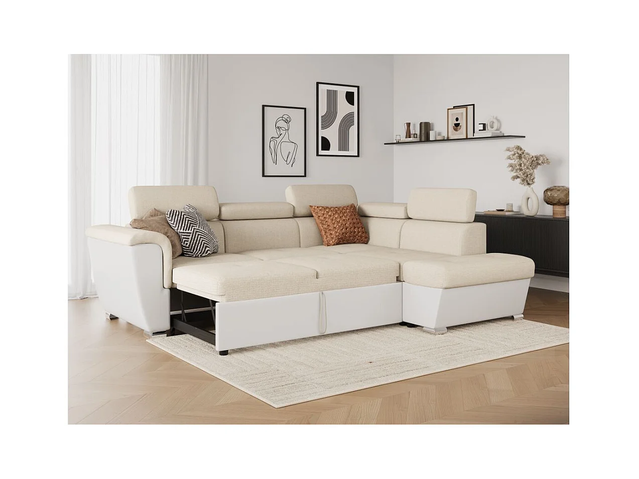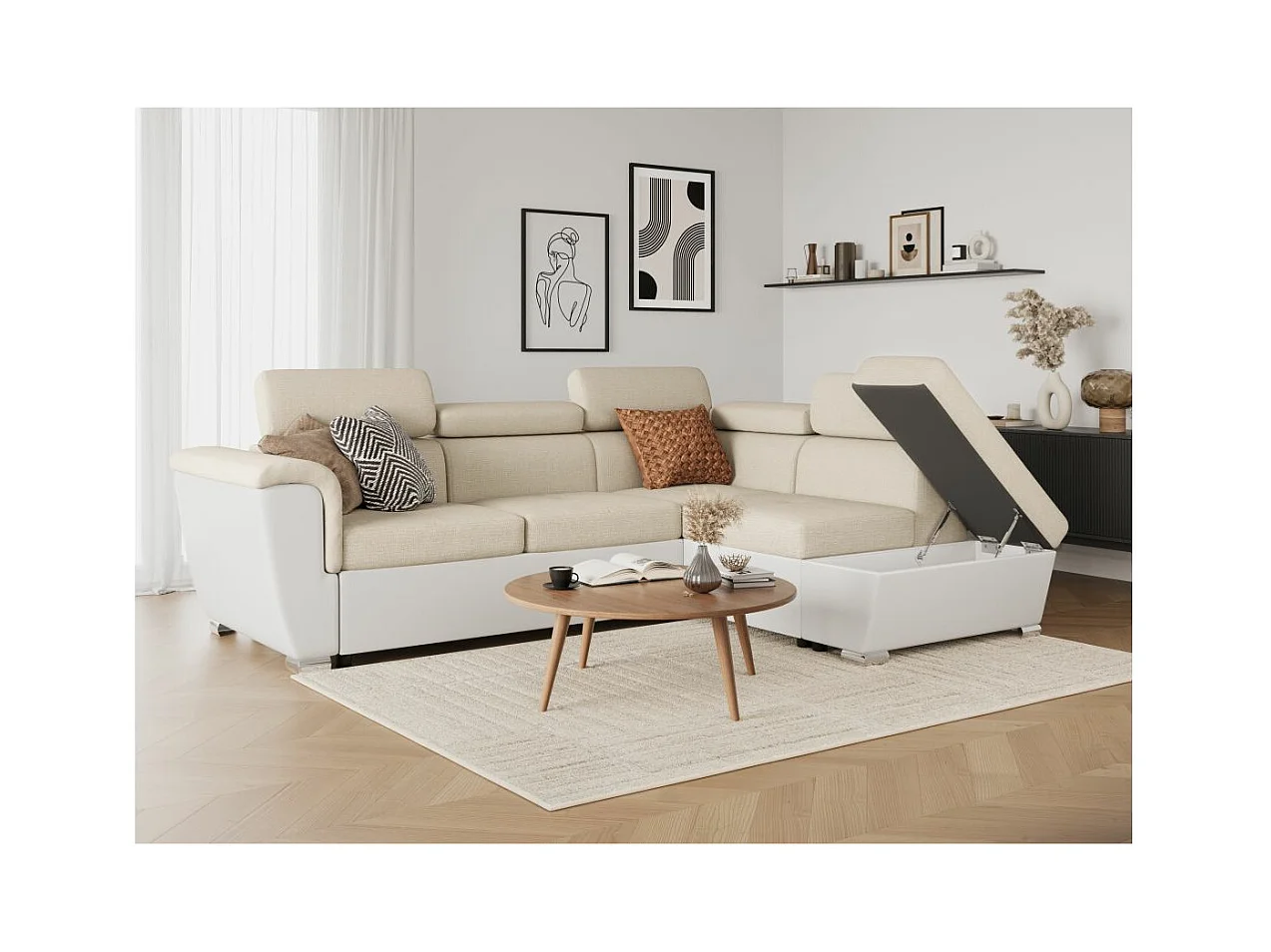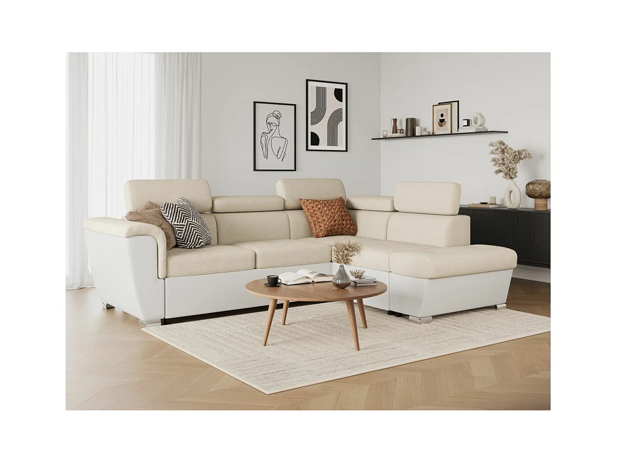 Canapé d'angle droit PAOLA convertible 4 places tissu Easy Clean antitache et simili - Beige/Blanc