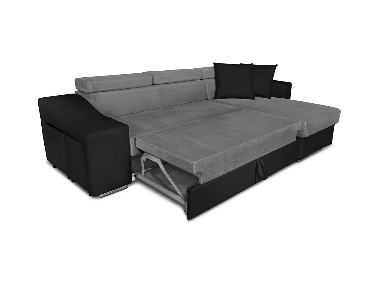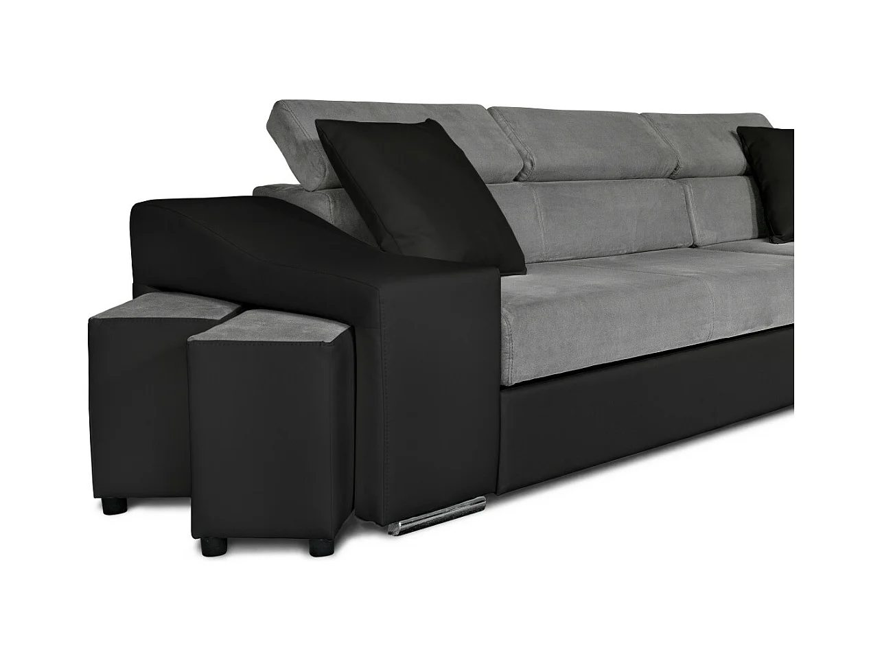 Canapé d'angle Elona convertible bi-matière Gris et Noir avec poufs de rangement à gauche - L264 x P162 x H75cm - Loungitude